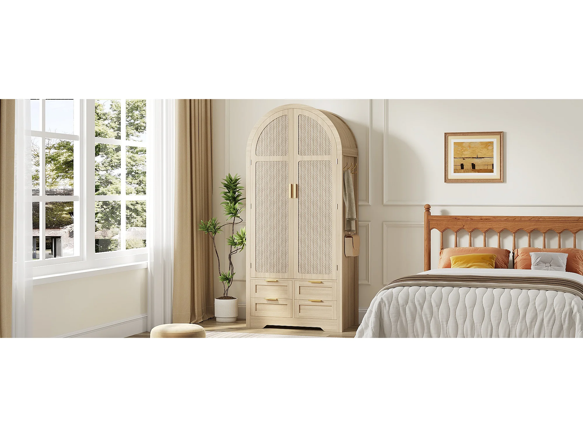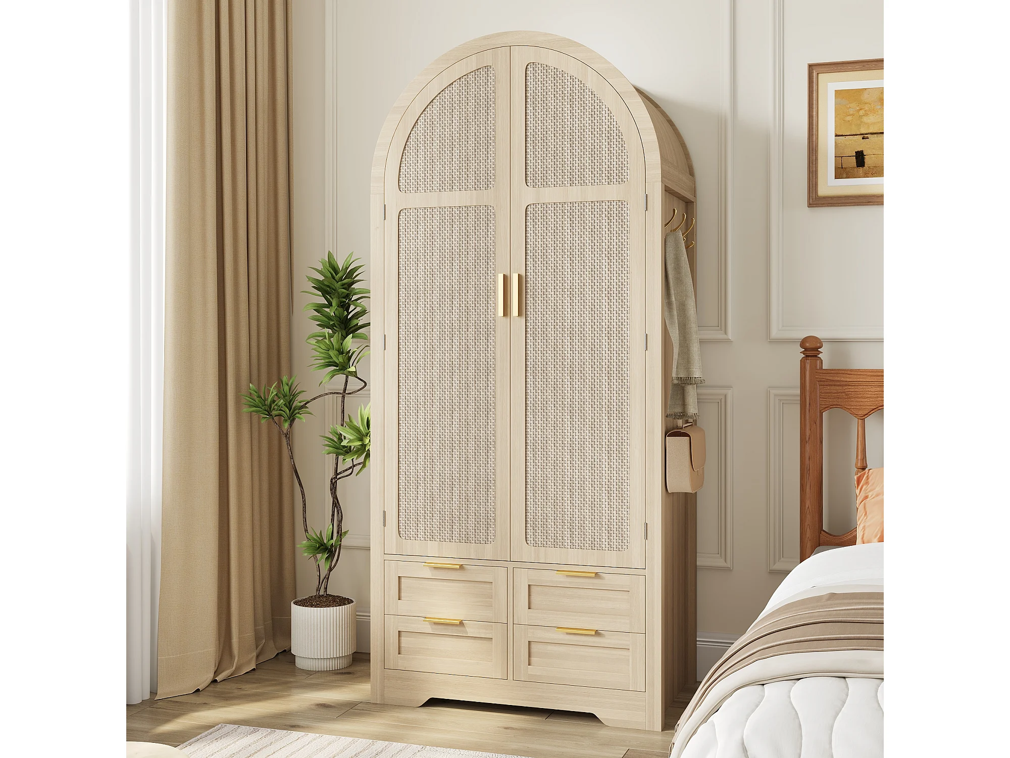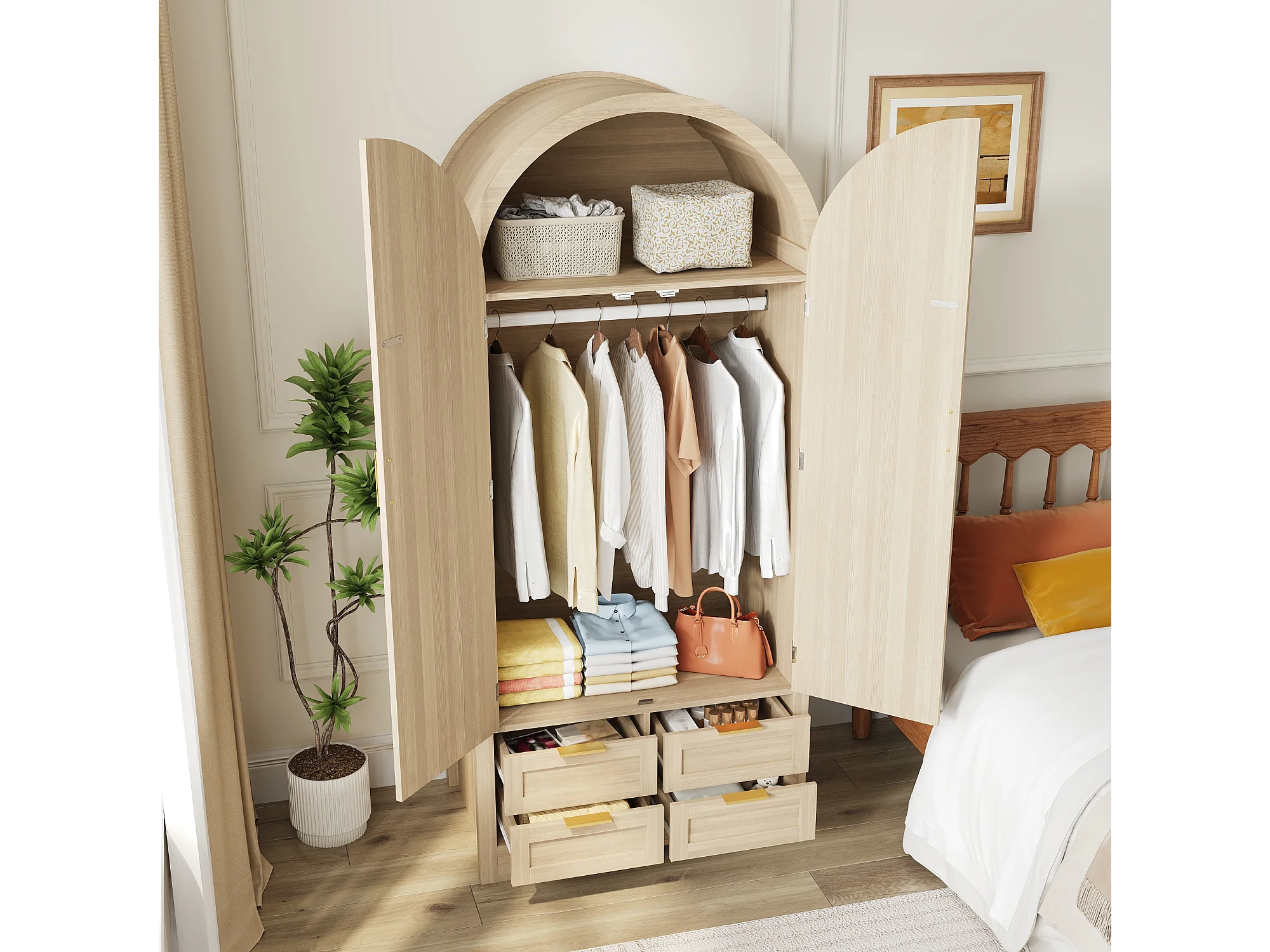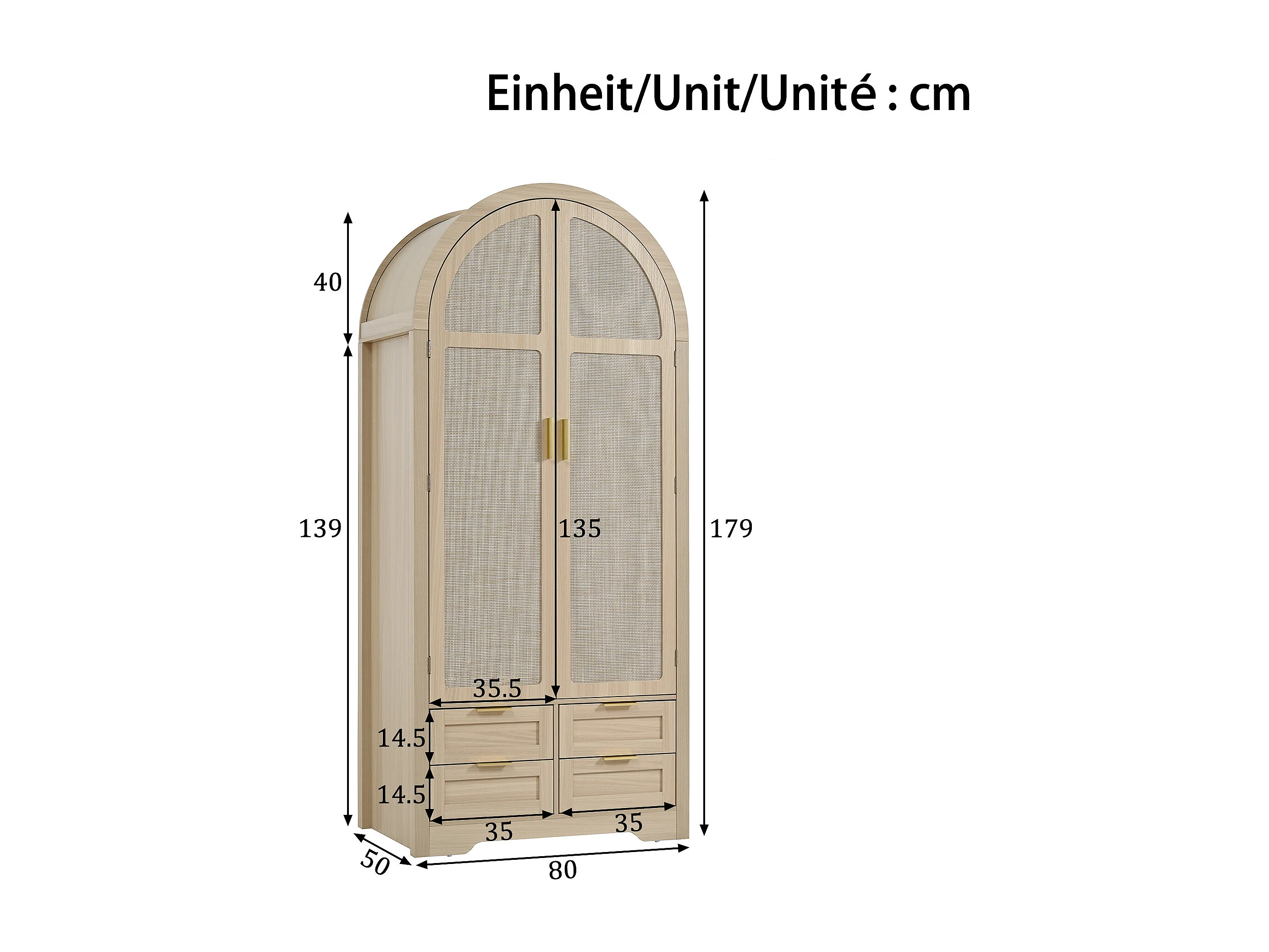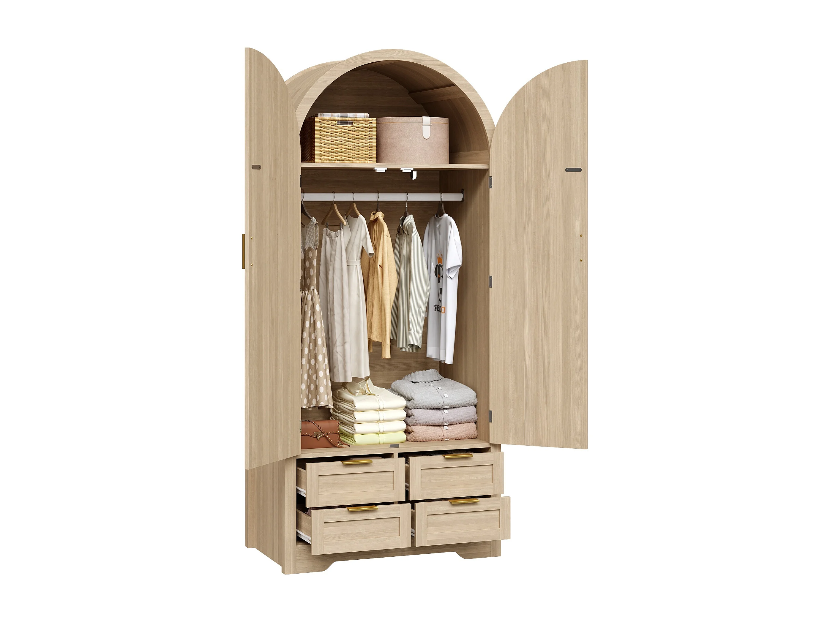Moderner Kleiderschrank mit gebogenen Türen – 80 x 50 x 179 cm – mit Kleiderstange und 4 Schubladen – für Schlafzimmer und Flur – MDF – natur
