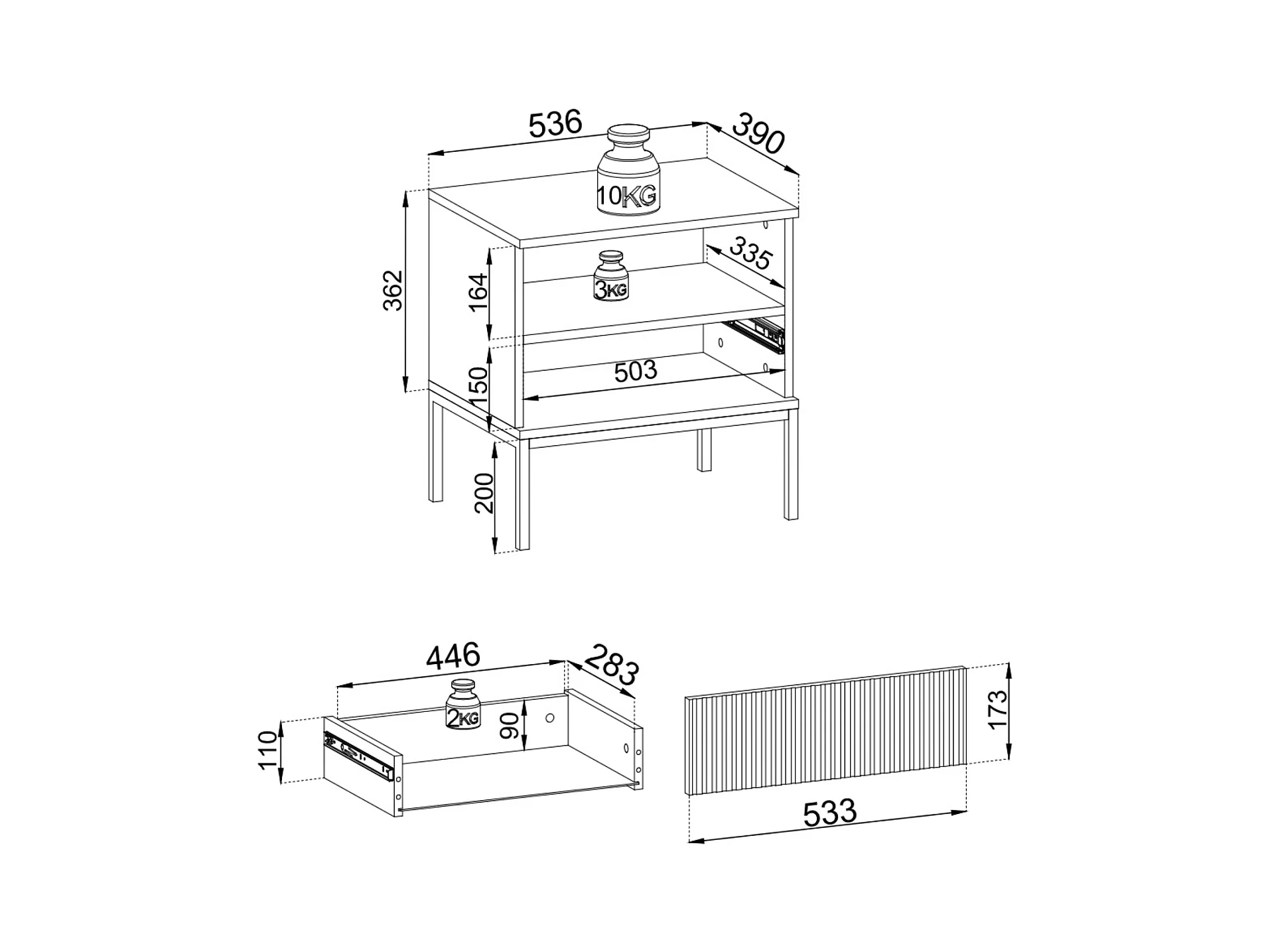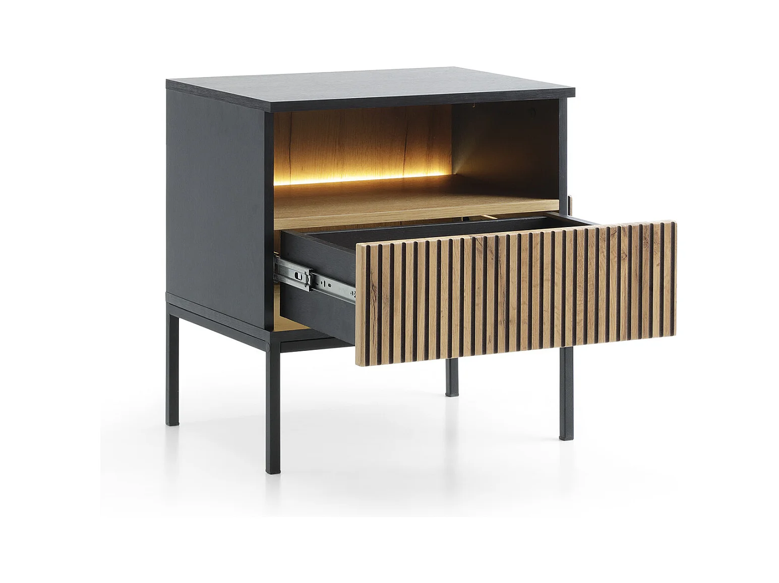 Moderner Nachttisch mit geriffelter Front, 54×56×39 cm, Schwarz / Wotan Eiche