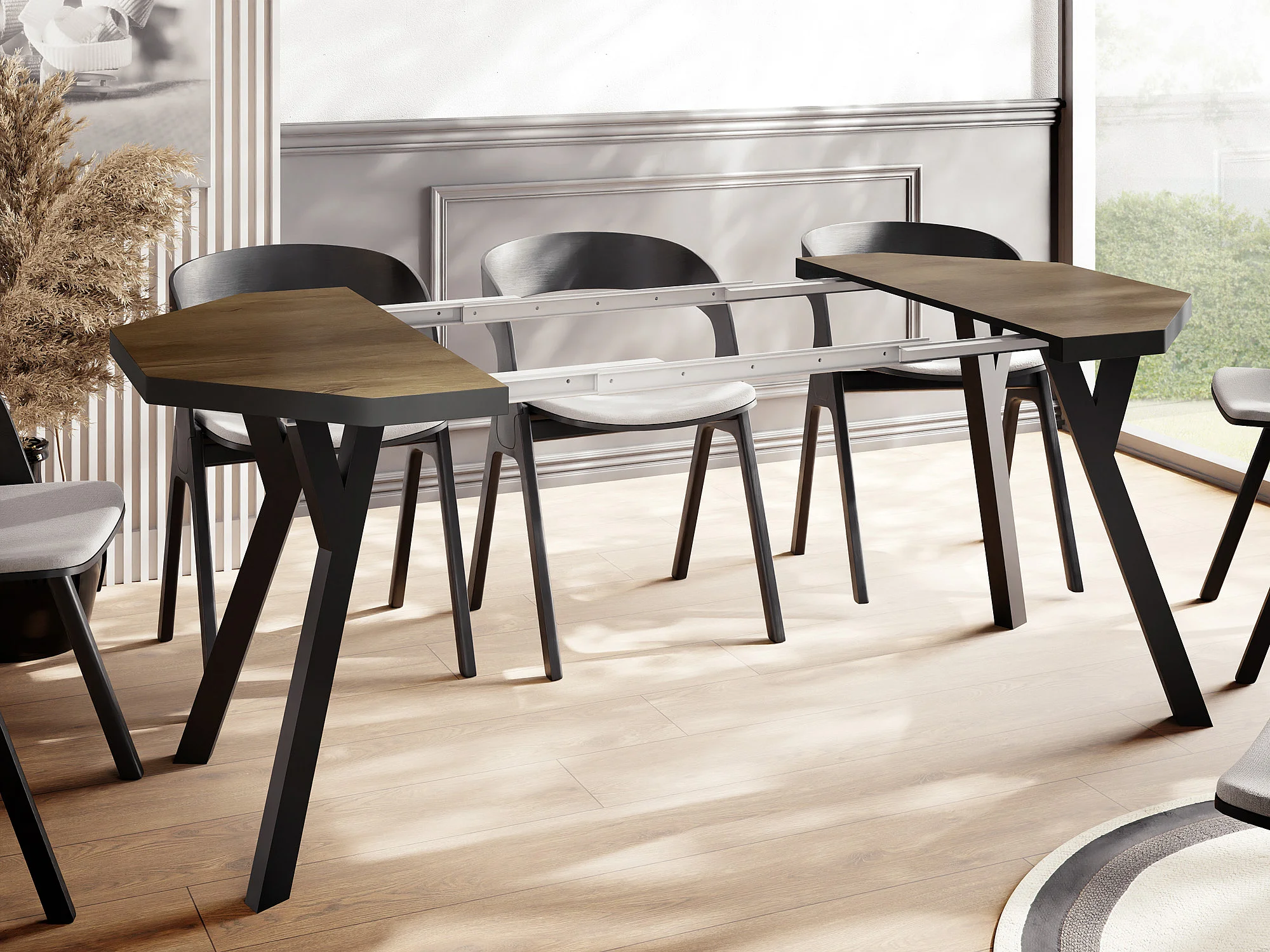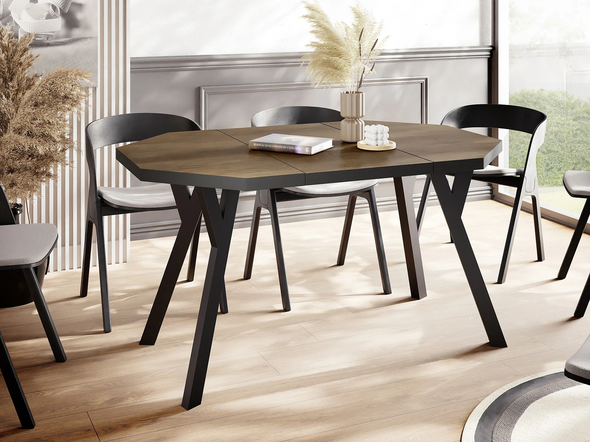 Moderner Runder Ausziehbarer Esstisch Desmond mit Schwarz Holzbeinen – Erweiterbar bis 200 cm, Ideal für 4 bis 8 Personen - Loft-Stil Tisch für Küche - Lefkas Eiche