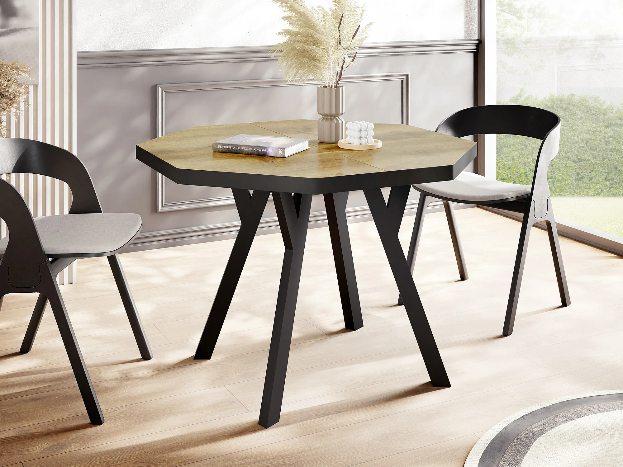 Moderner Runder Ausziehbarer Esstisch Desmond mit Schwarz Holzbeinen – Erweiterbar bis 200 cm, Ideal für 4 bis 8 Personen - Loft-Stil Tisch für Küche - Wotan Eiche
