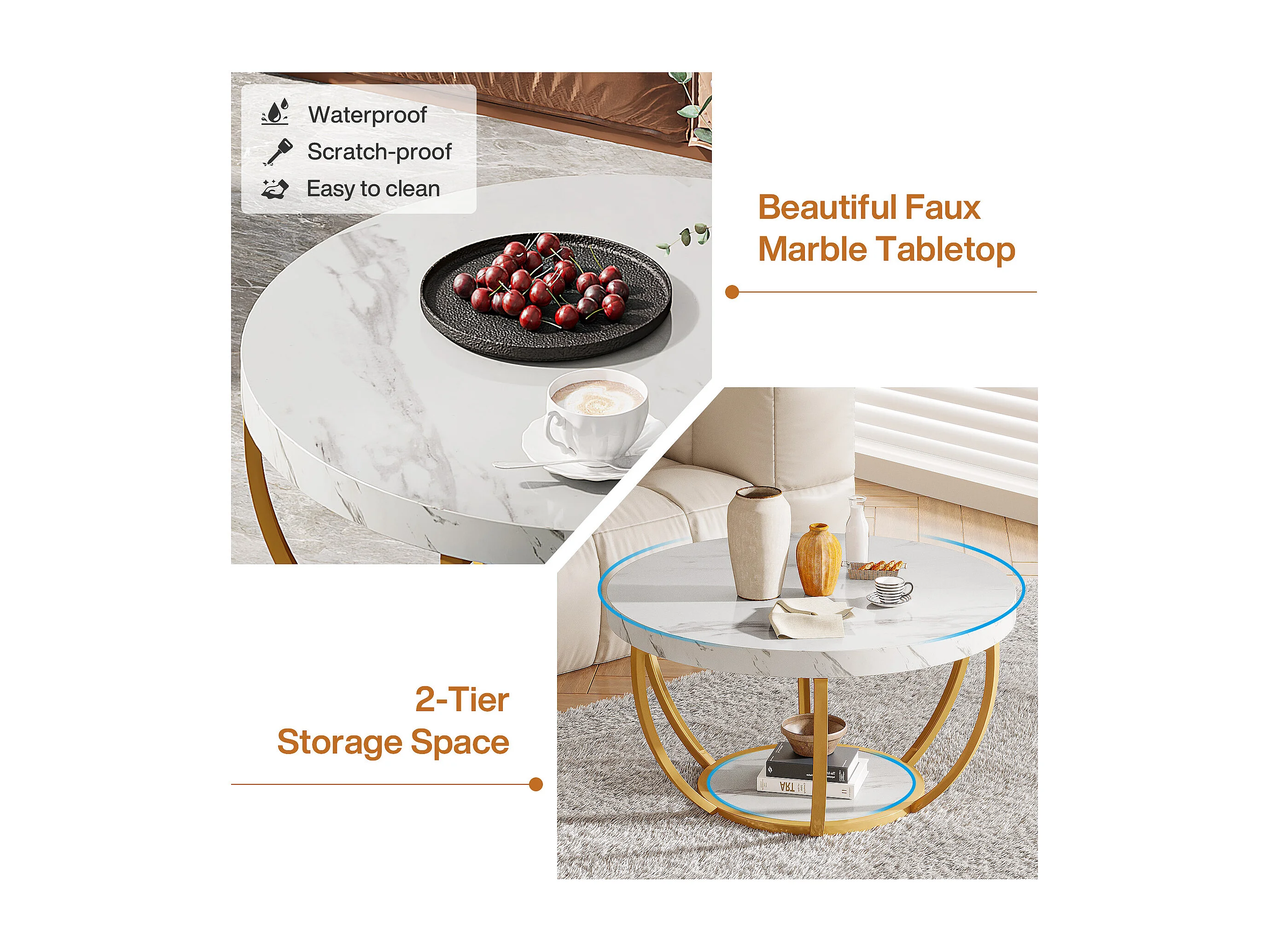 Moderner runder Couchtisch, 2-stufiger Couchtisch mit künstlichem weißem Marmorfinish und goldenen Metallbeinen