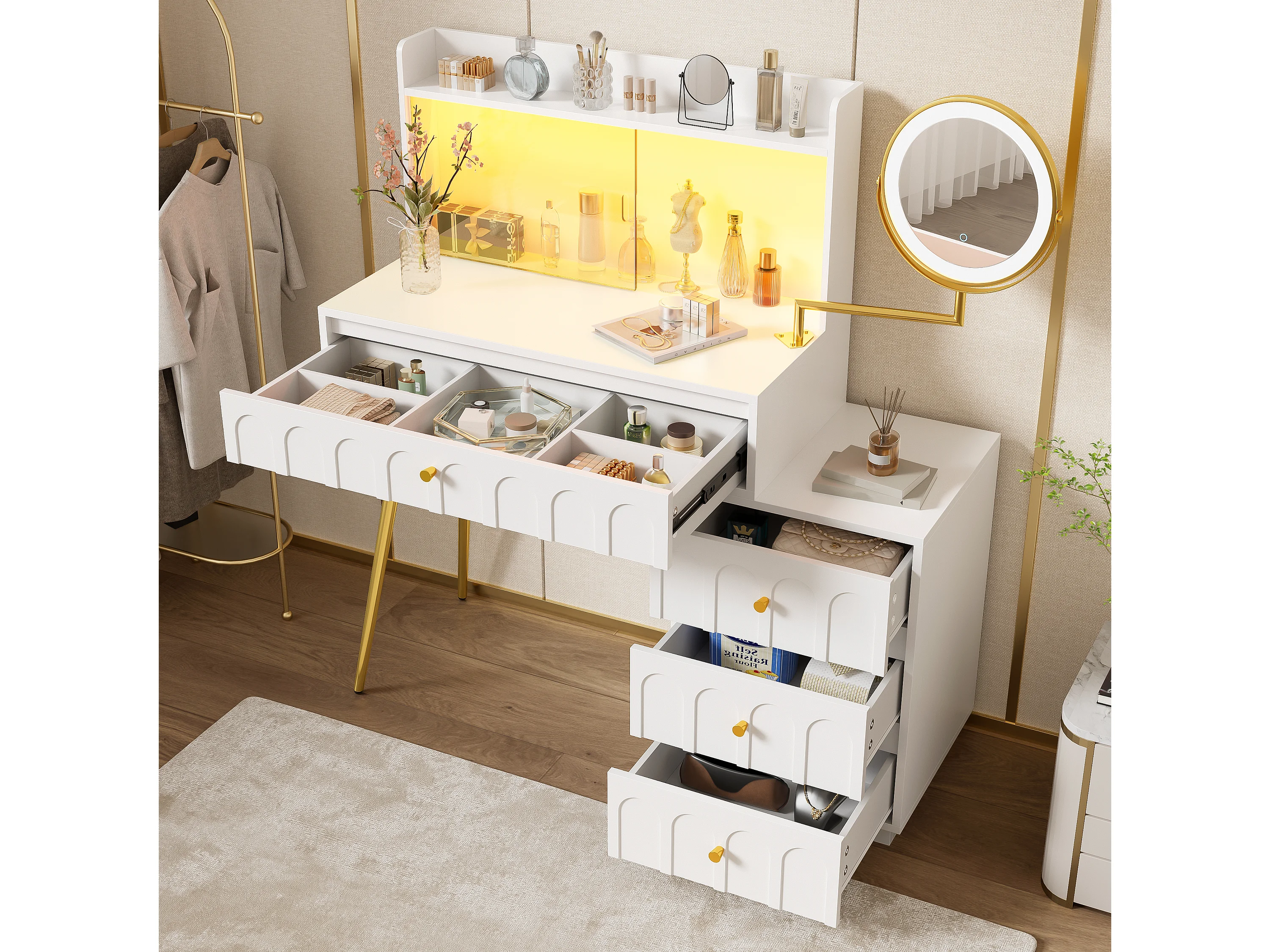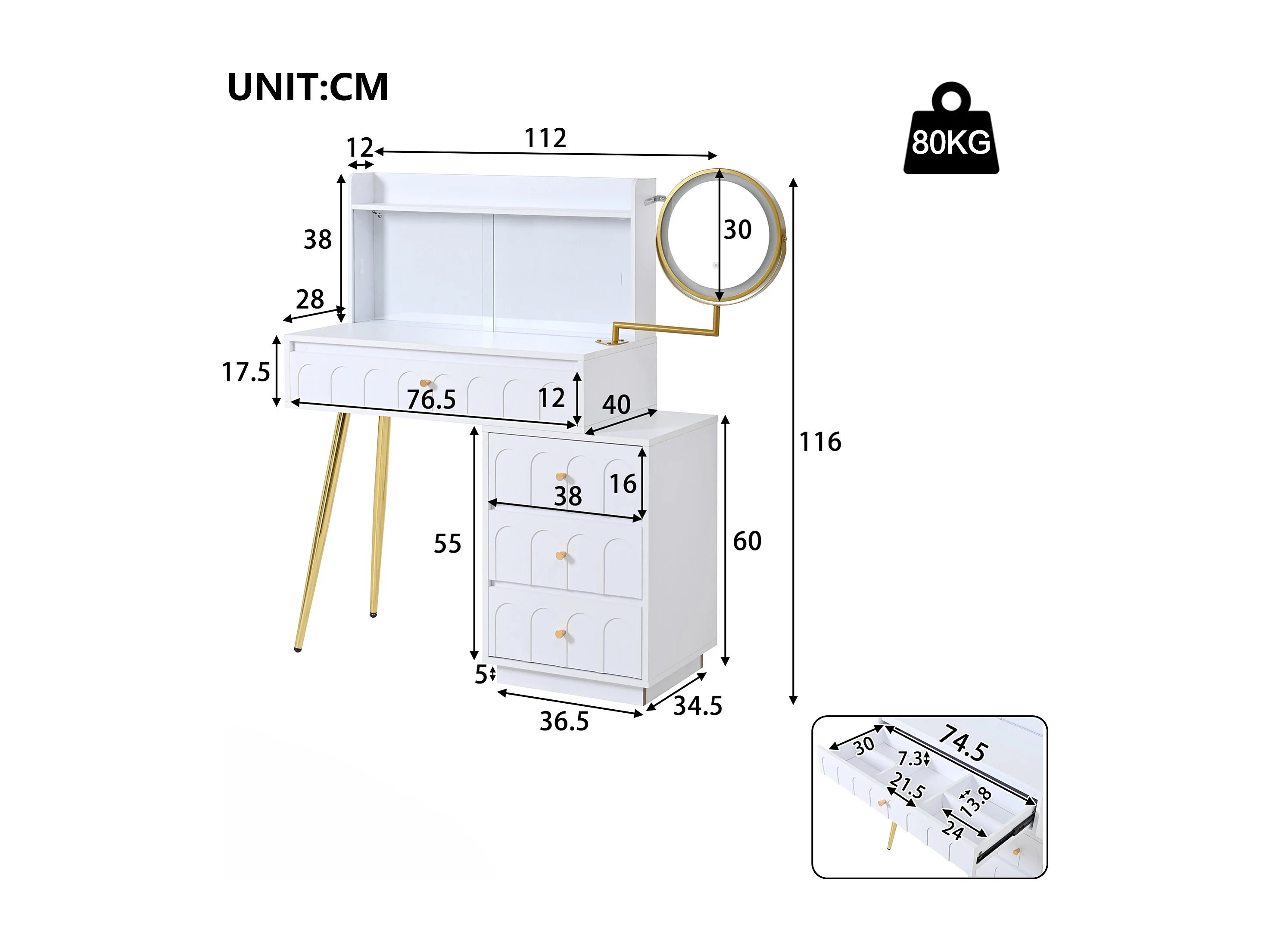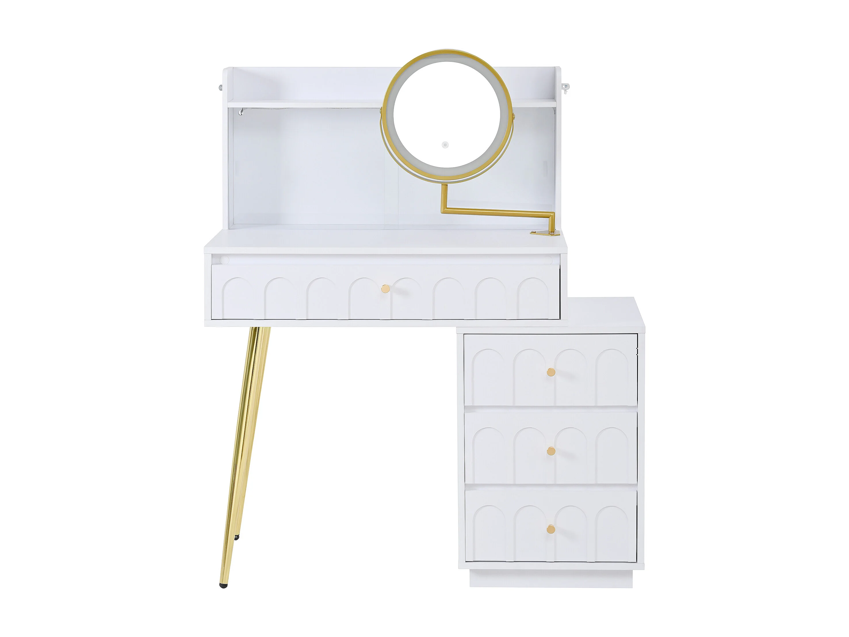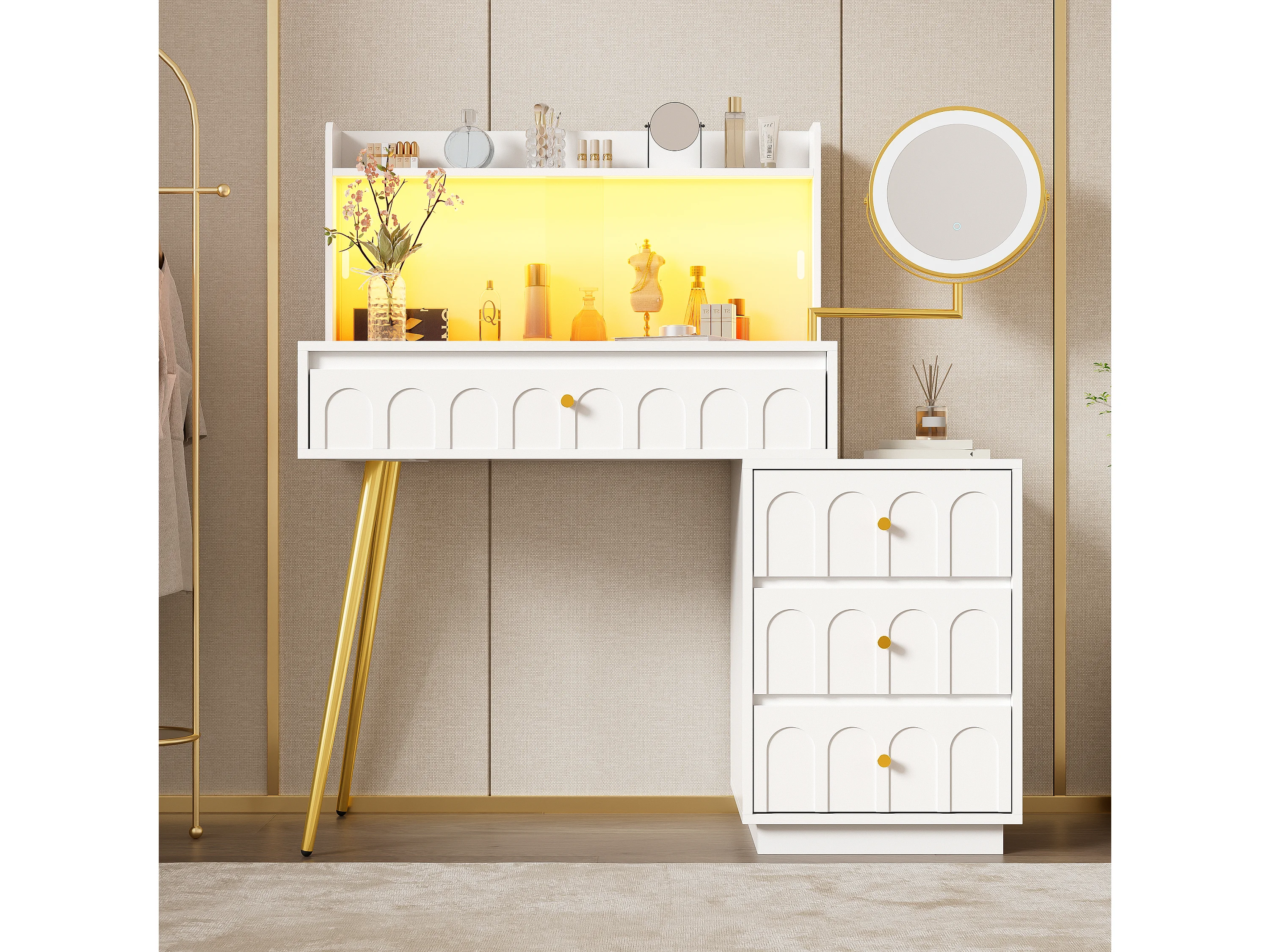 Moderner Schminktisch – 112 x 40 x 116 cm – mit schwenkbarem LED-Spiegel, Glastüren und 4 Schubladen – MDF und Spanplatte – weiß