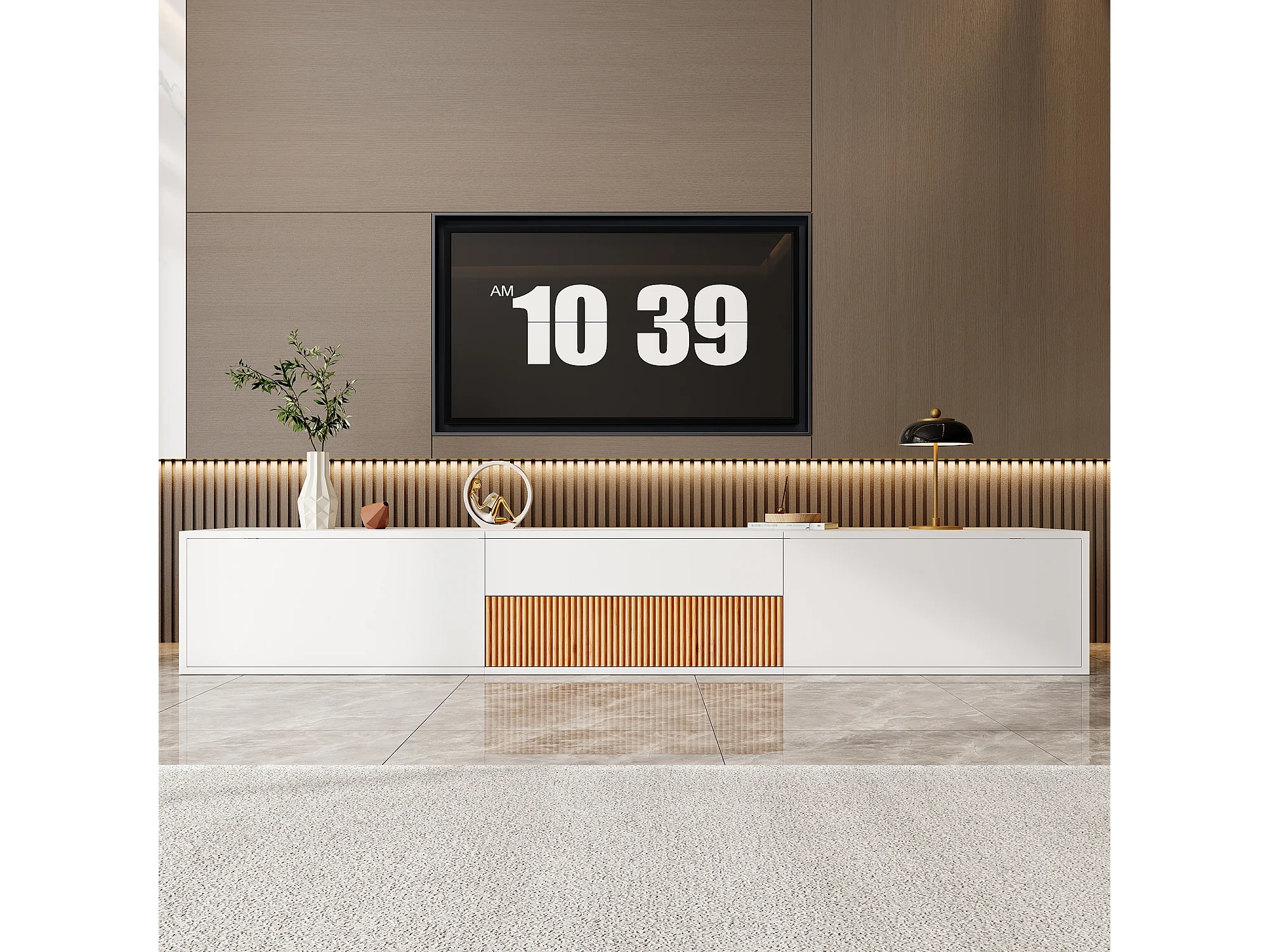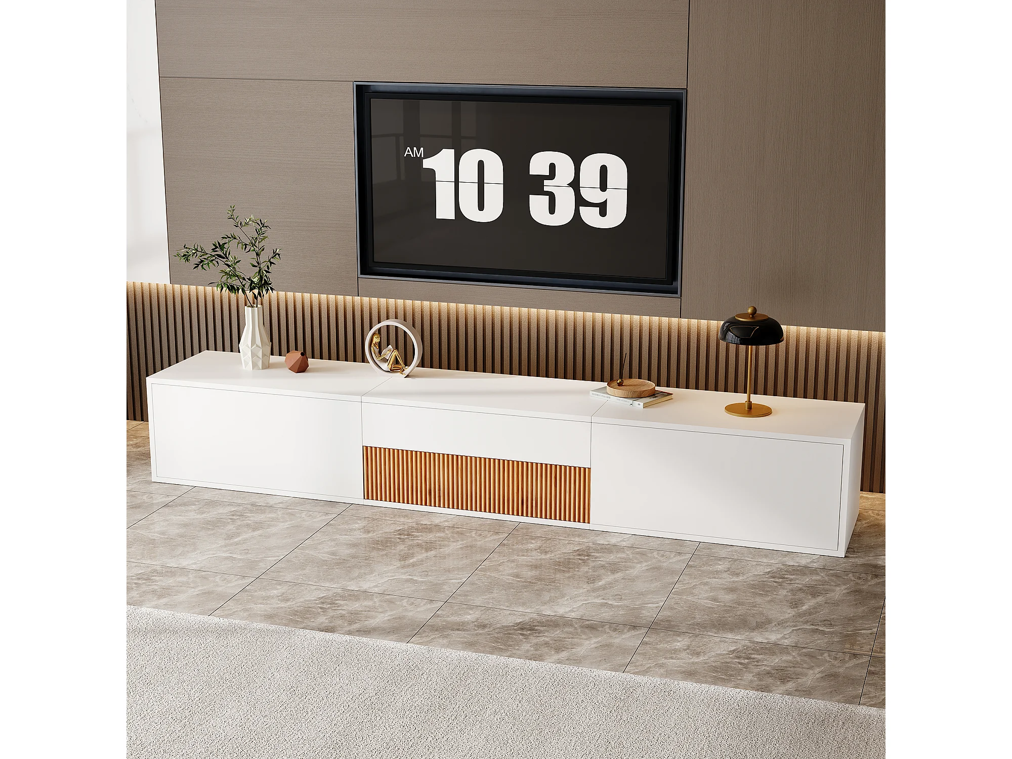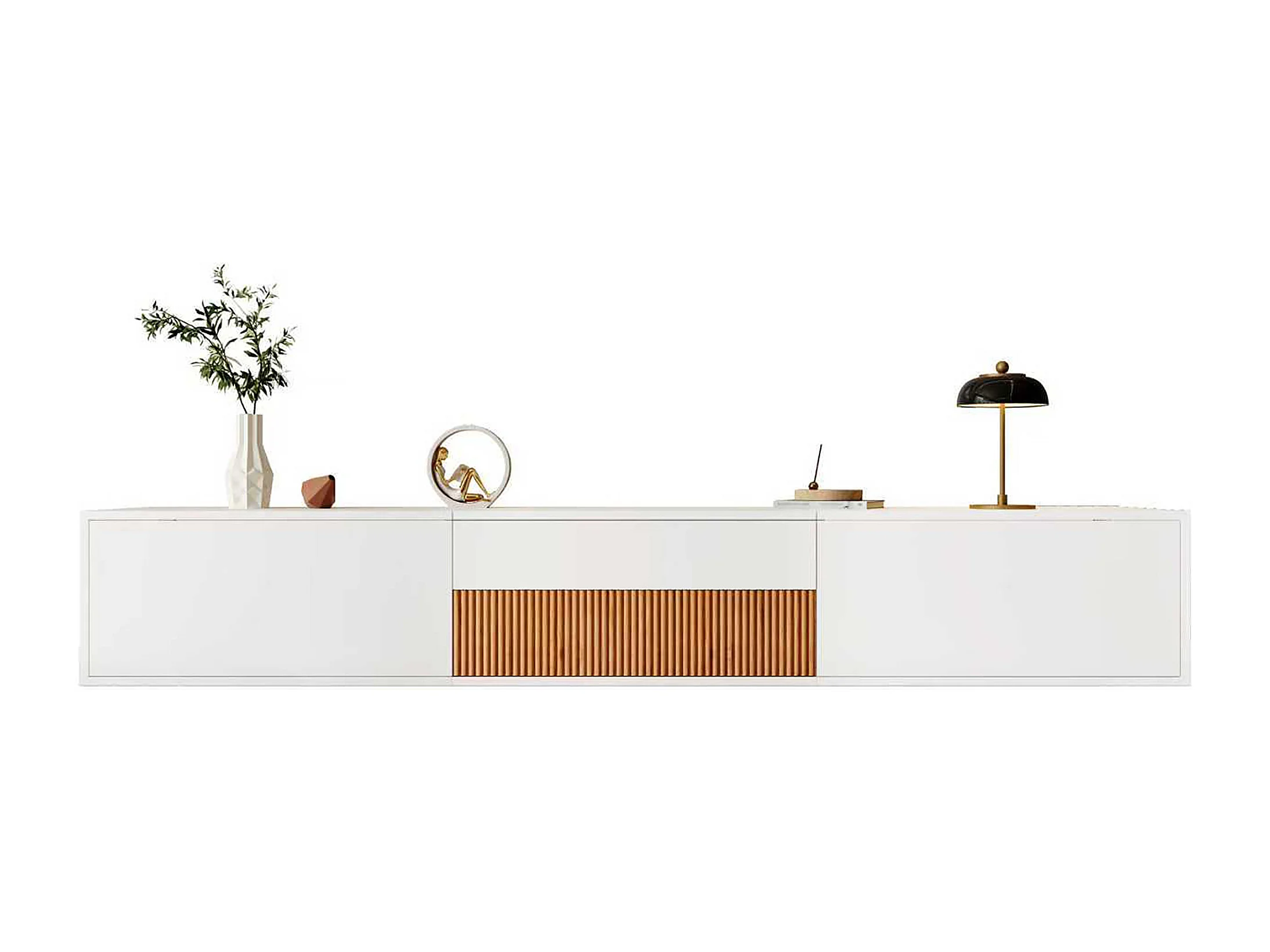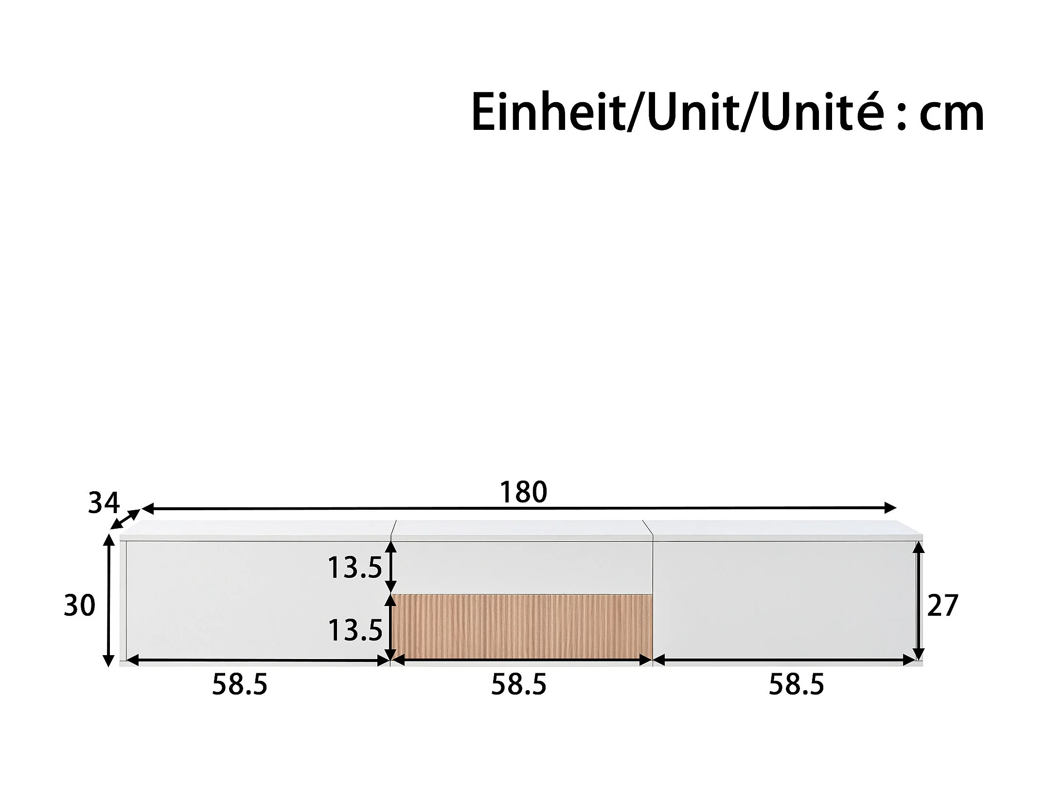 Moderner TV-Schrank 180x34x30 cm - Wandmontage/Auf Standfüßen - 3 Türen - Ausziehbare Ablagen - Spanplatten - Weiß und natur