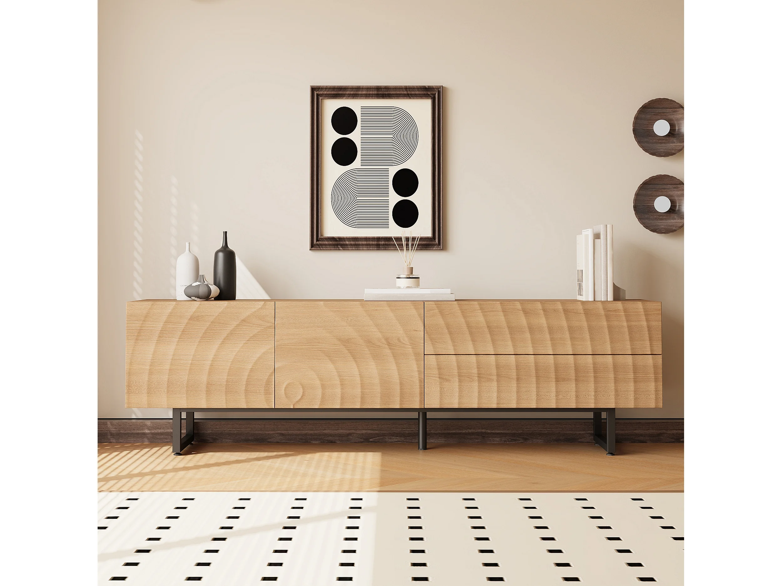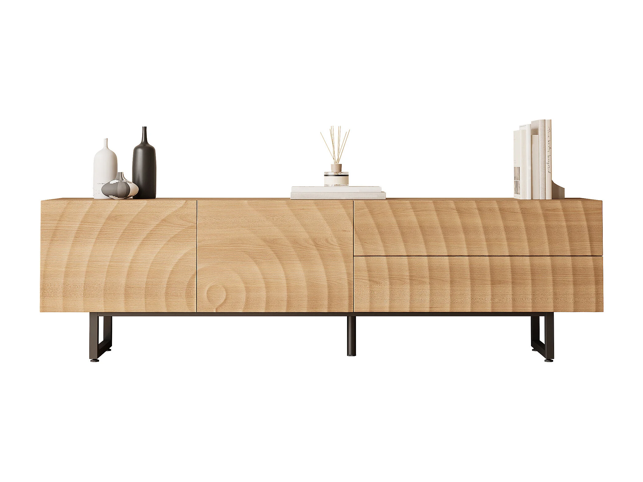 Moderner TV-Schrank 180x38x51,5 cm - 2 Türen und 2 Schubladen - Oberfläche mit wellenartiger Holzmaserung - Spanplatten - Natur