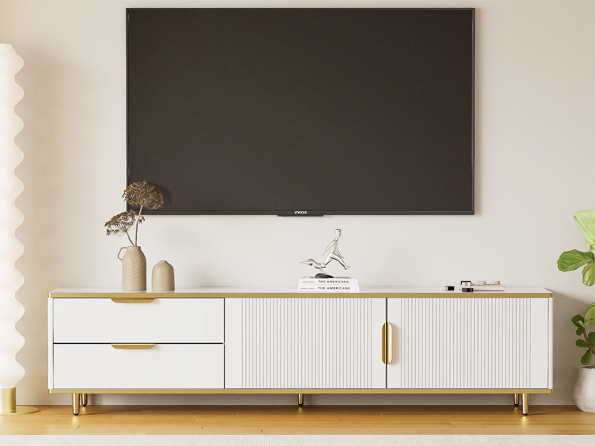Moderner TV-Schrank – mit 2 Türen und 2 Schubladen – Metallbeine – Weiß