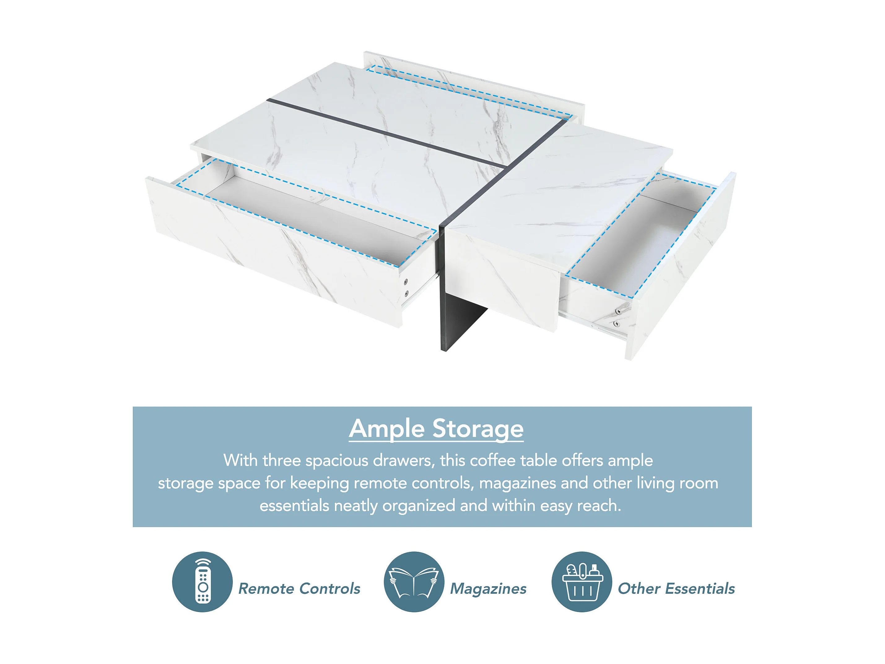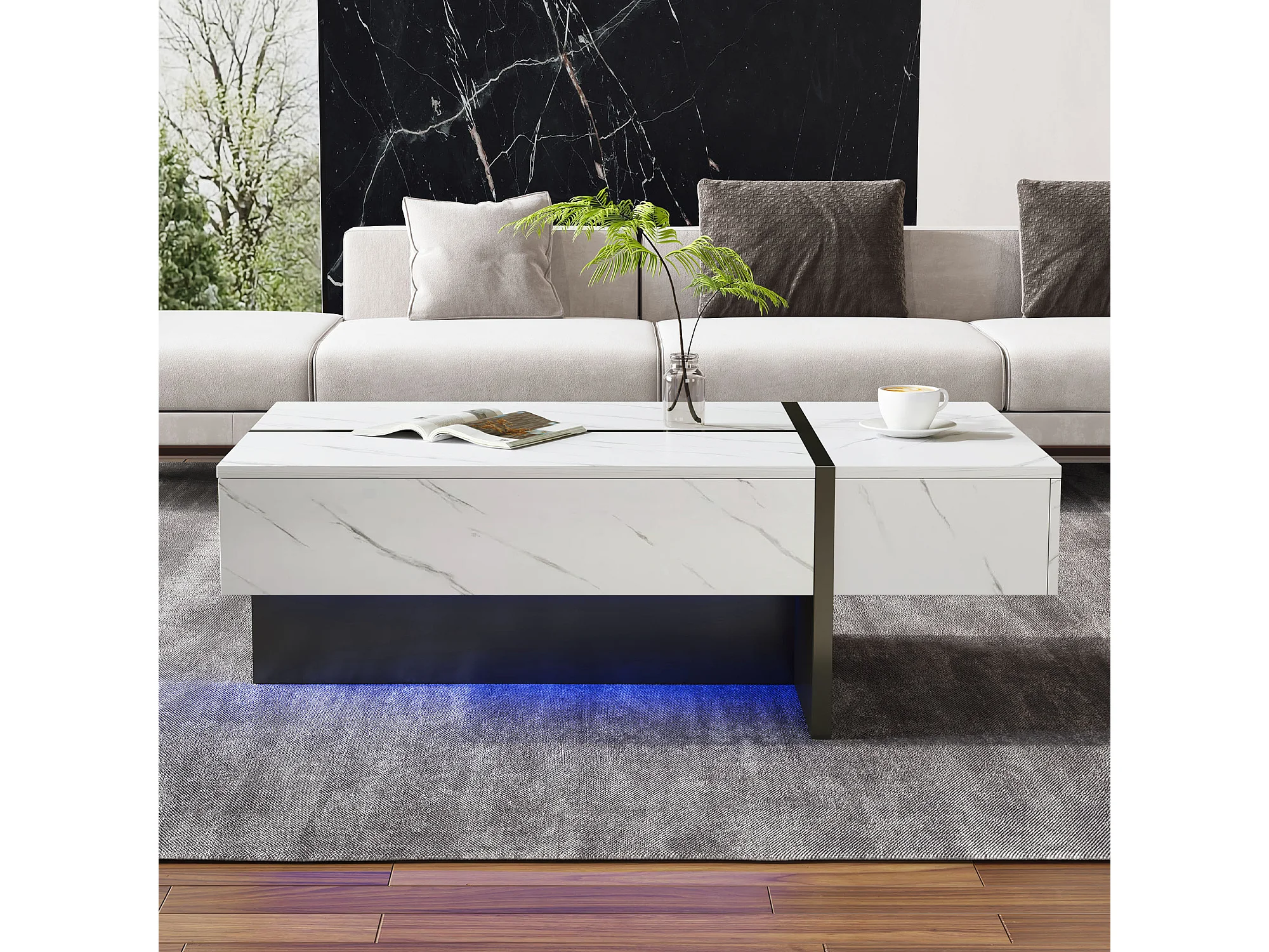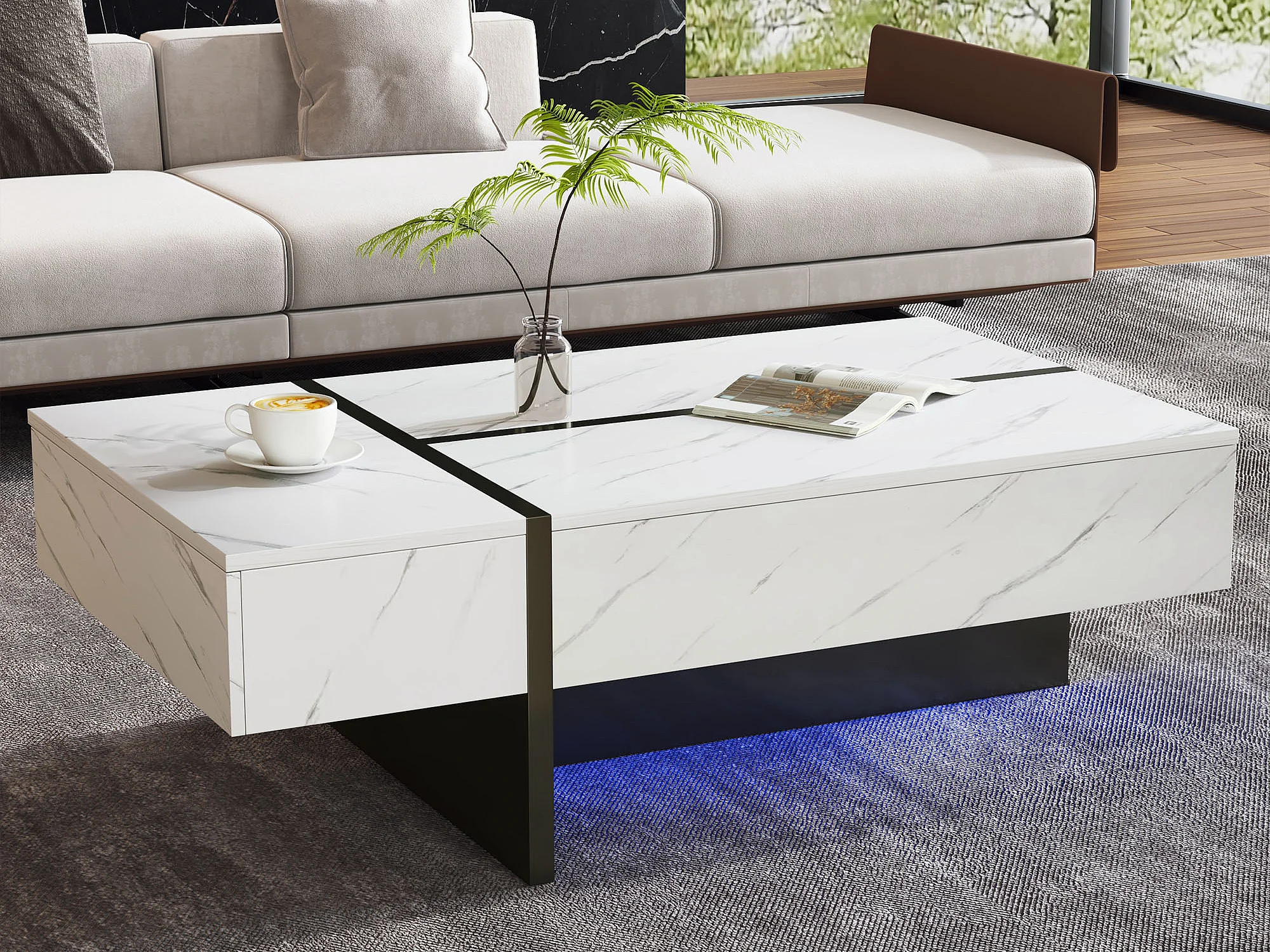 Moderner weißer Couchtisch mit LED-Beleuchtung, Marmormuster, glänzende Platte – 105 x 60 x 35 cm