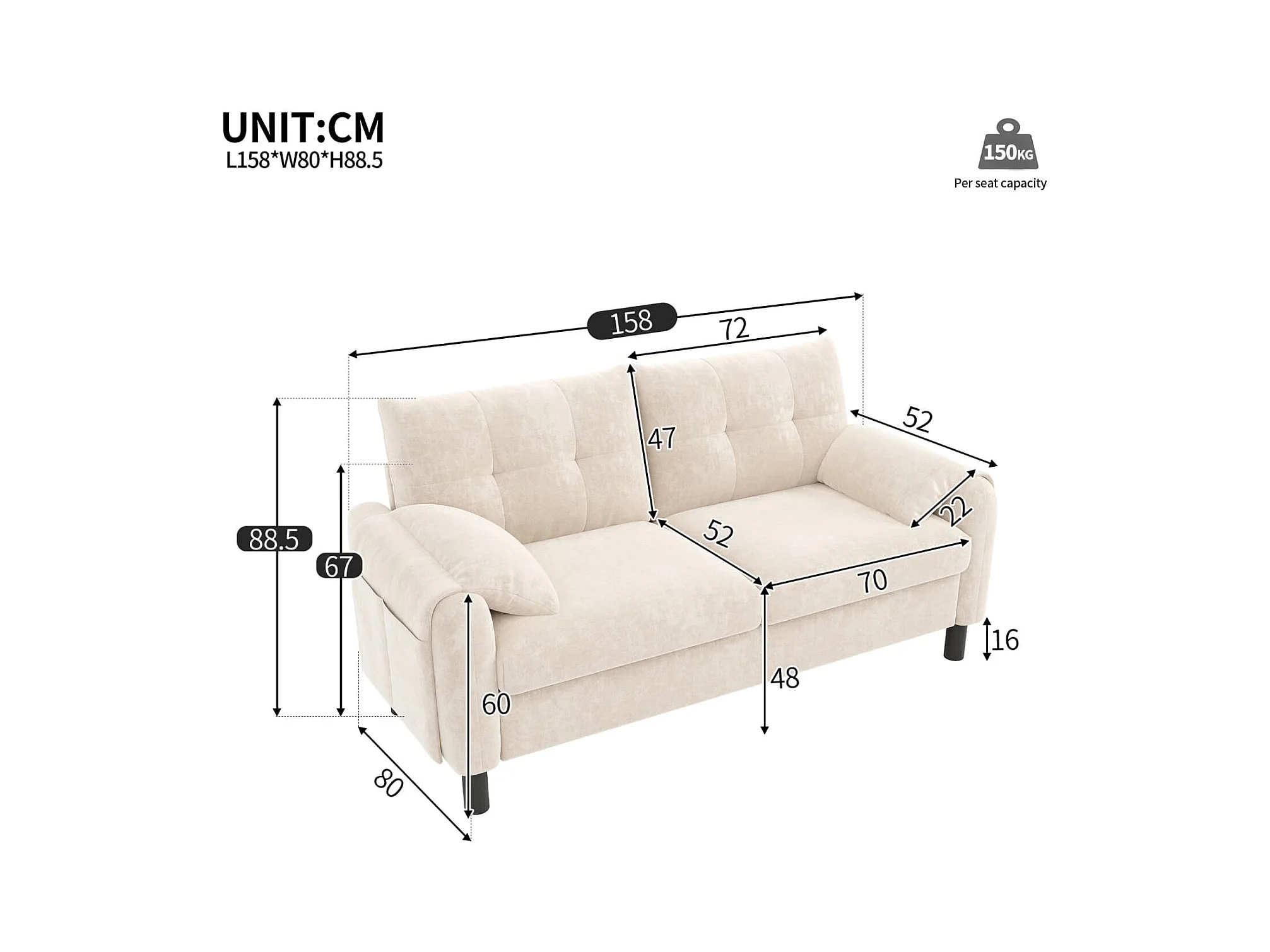 Modernes 2-Sitzer Sofa,bequemes Polstersofa aus Chenille Stoff mit dicken Kissen,gemütliche Couch,Polstermöbel im skandinavischen Design