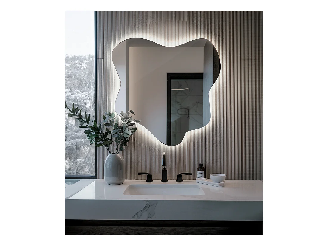 Modernes asymmetrisches Spiegel ohne Rahmen mit integrierter LED-Beleuchtung, kaltes Licht, perfekt für Wanddekoration - 48,3 cm x 47,9 cm Asymmetrischer spiegel