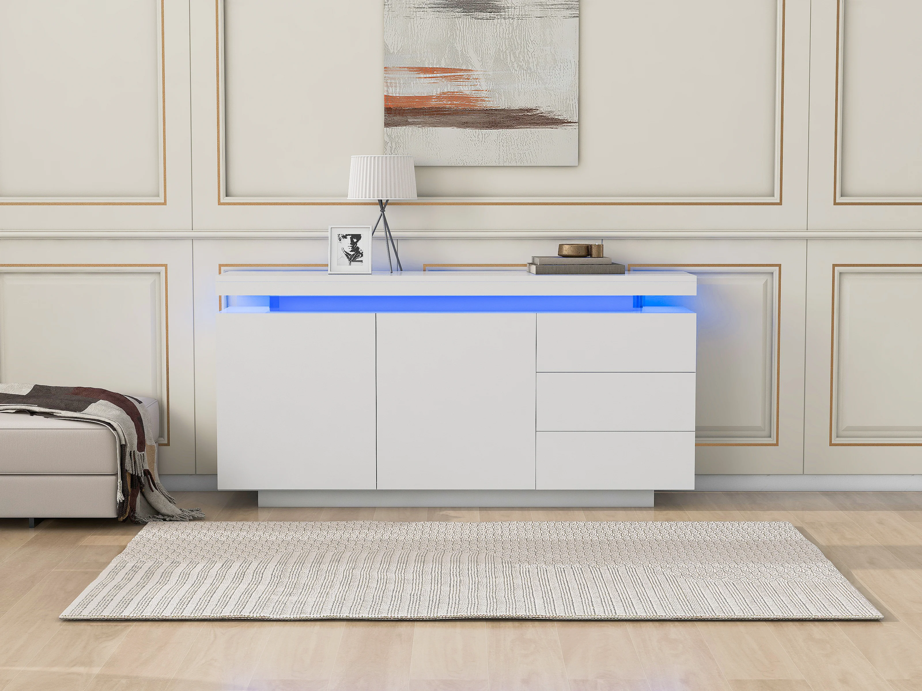 Modernes, hochglanzlackiertes Sideboard fürs Wohnzimmer – 140 x 38 x 72,5 cm – mit 2 Türen, 3 Schubladen und LED-Beleuchtung – Spanplatte – weiß