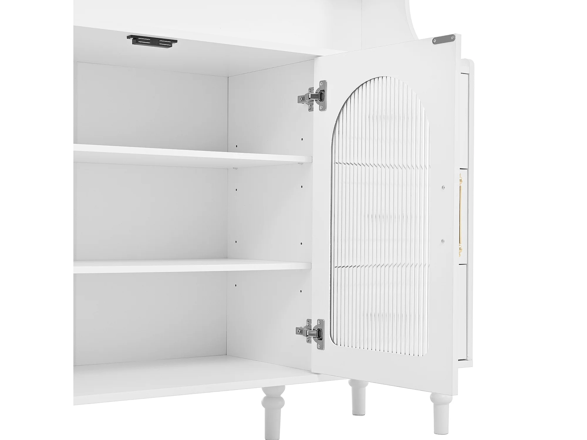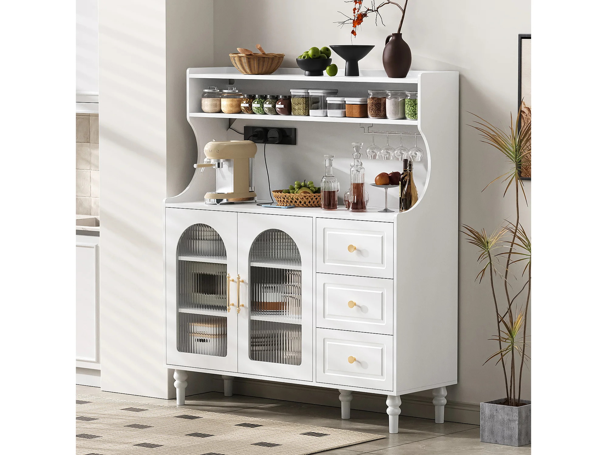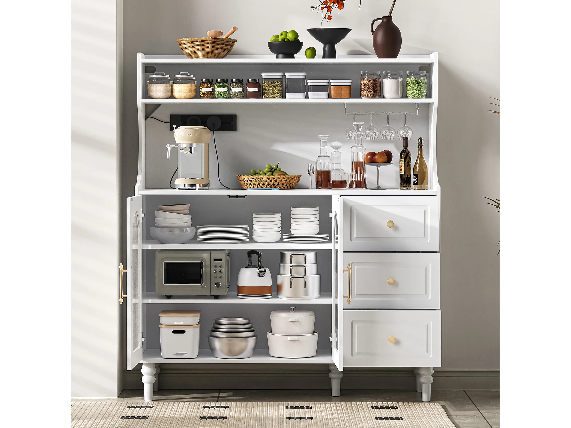 Modernes Küchenbuffet 120x40x138.5cm - mit Steckdose und Weinglashaltern - mit 3 Schubladen und 2 Türen - Weiß