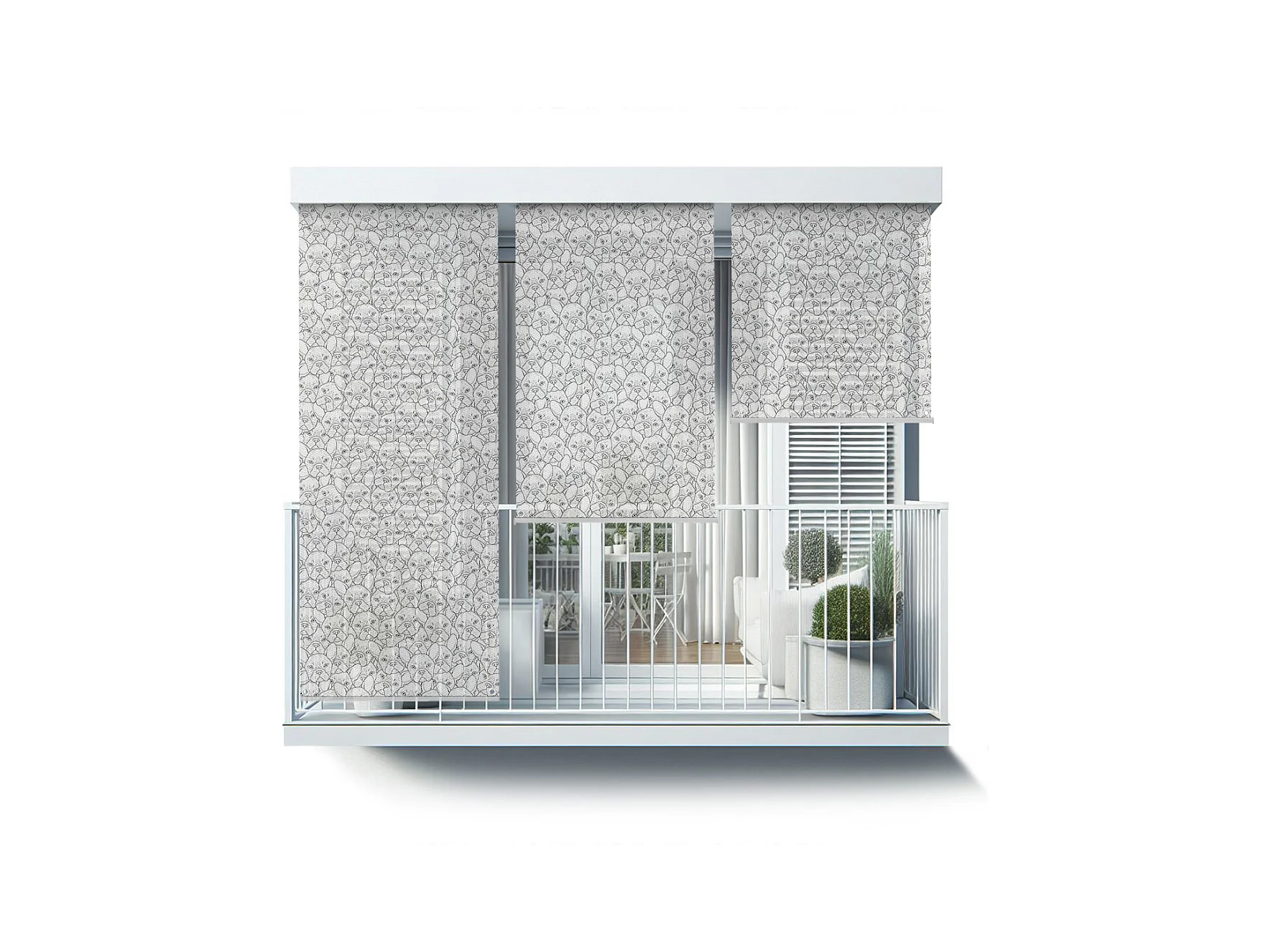Modernes Rollo für den Außenbereich – 140 x 290 cm – Schwarz-weiße Cartoon-Hunde. Balkonvorhang, Balkonjalousien und Sonnenschutzvorhang