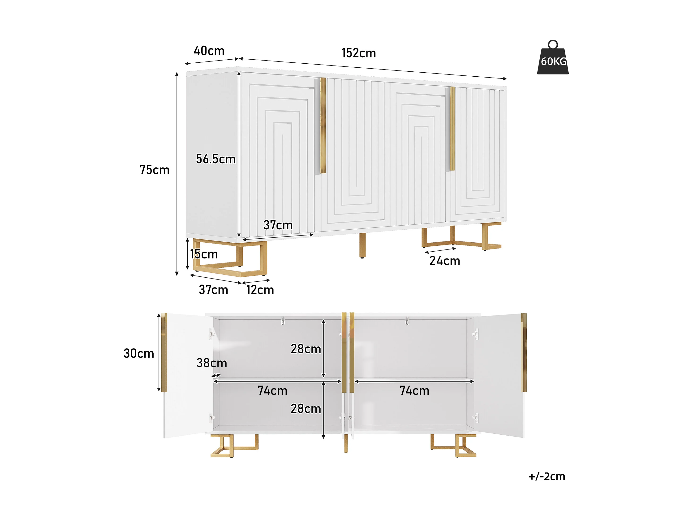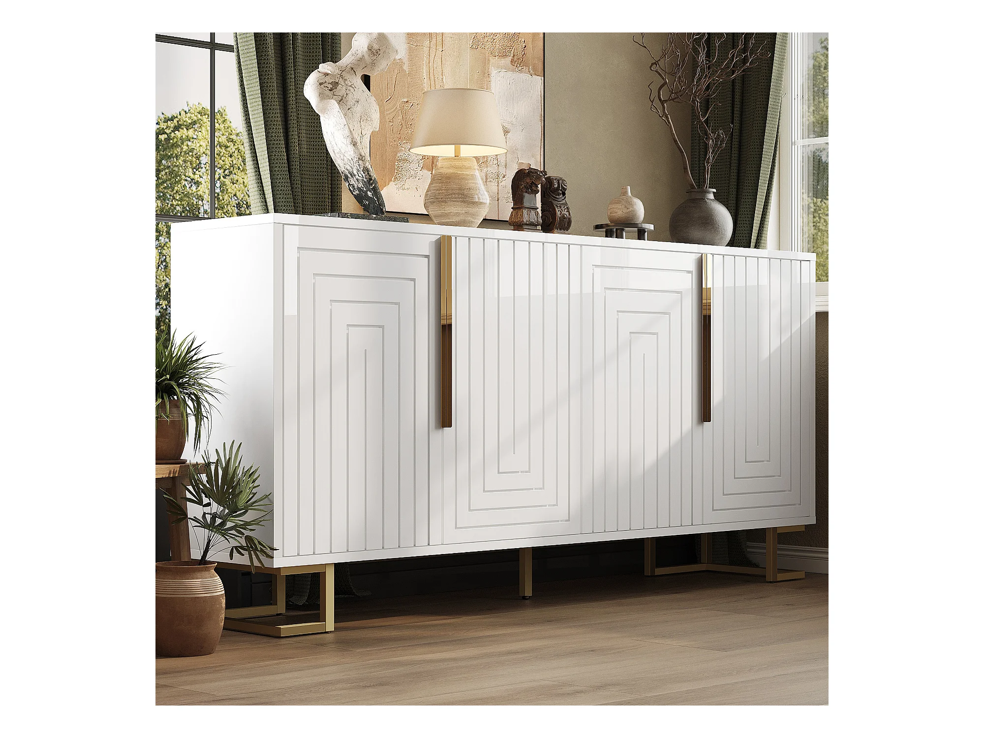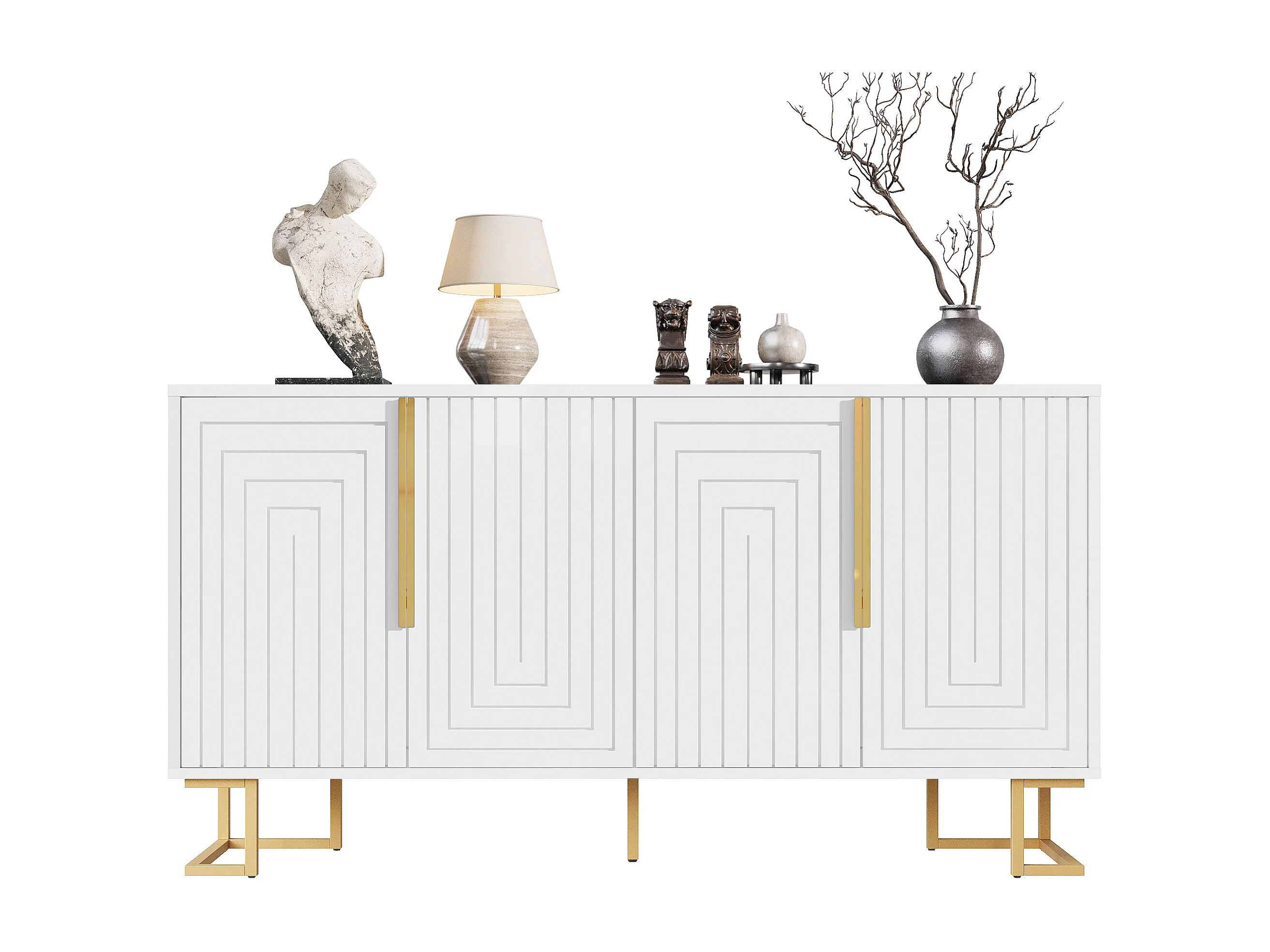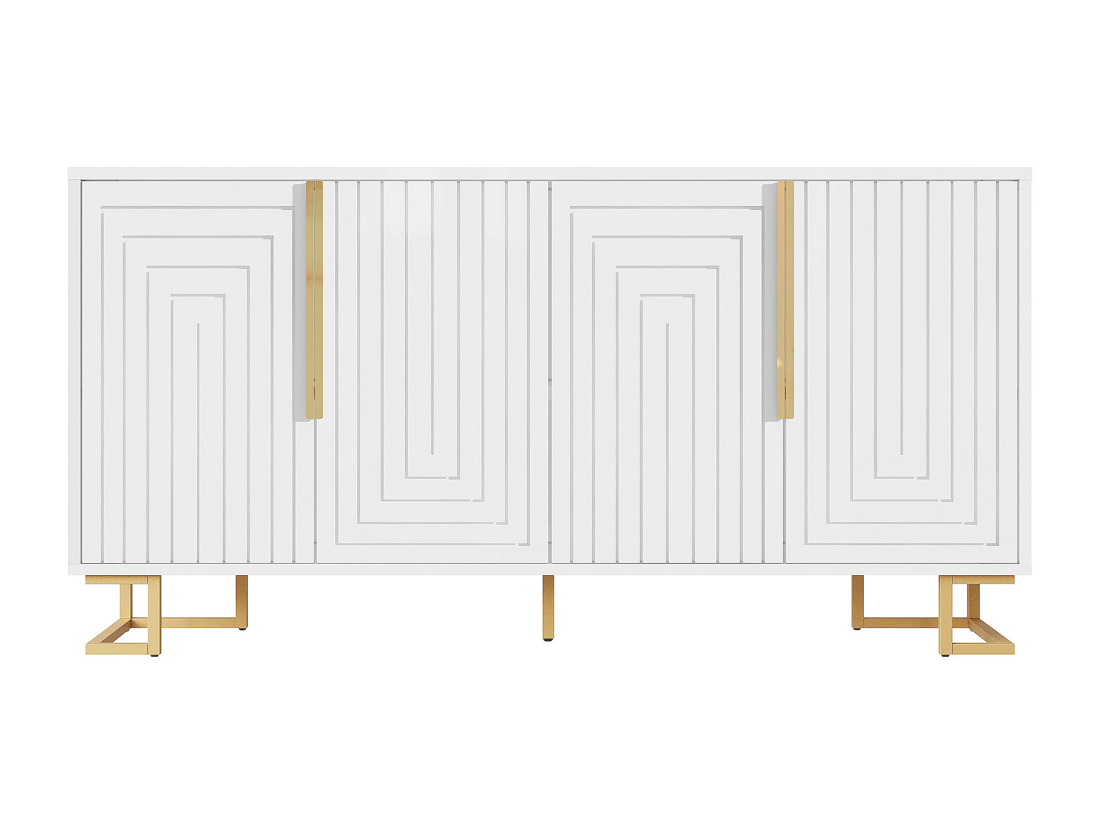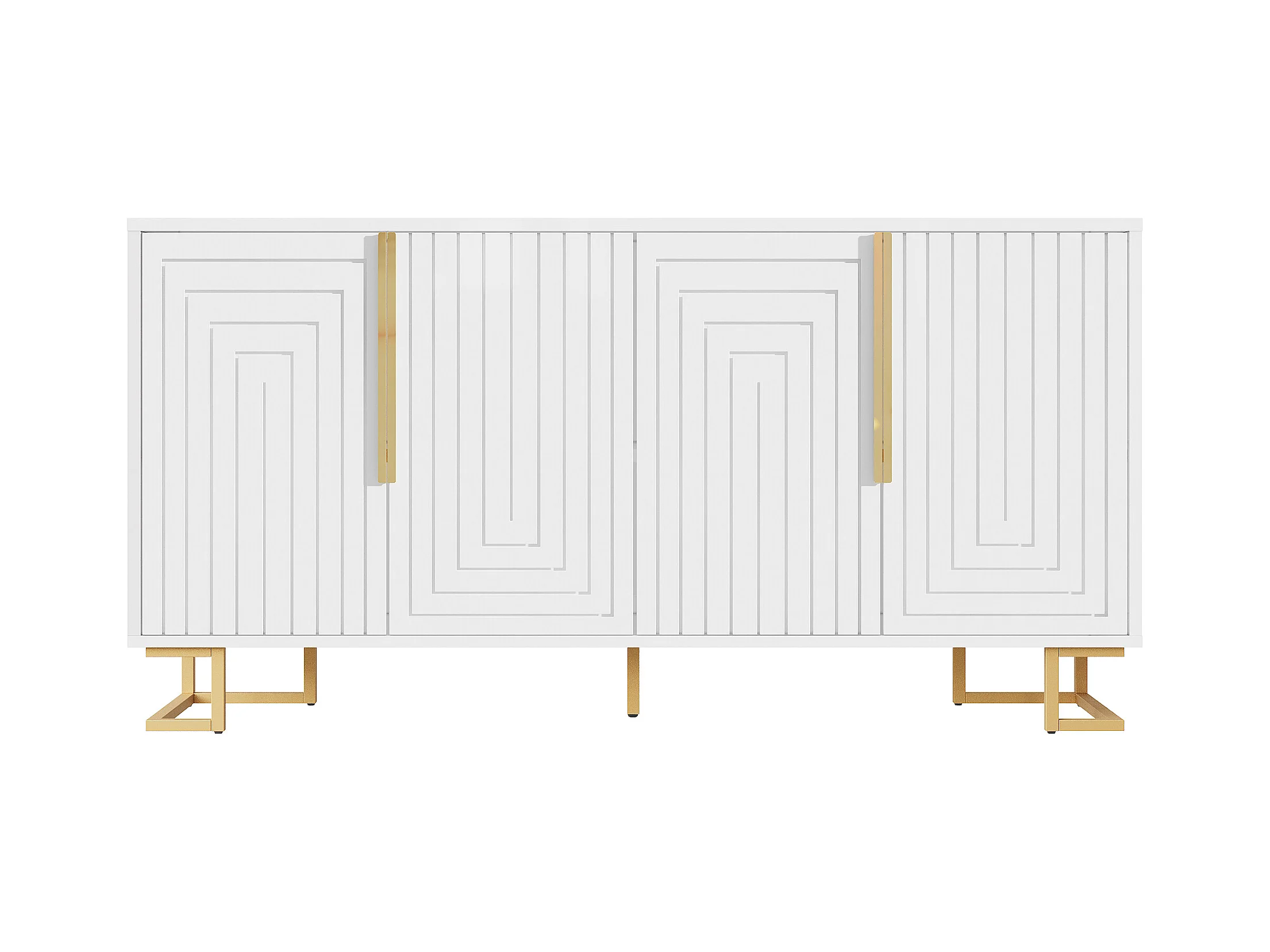 Modernes Sideboard 152×40×75 cm - mit 4 Türen - mit goldenen Griffen und Füßen - weiß