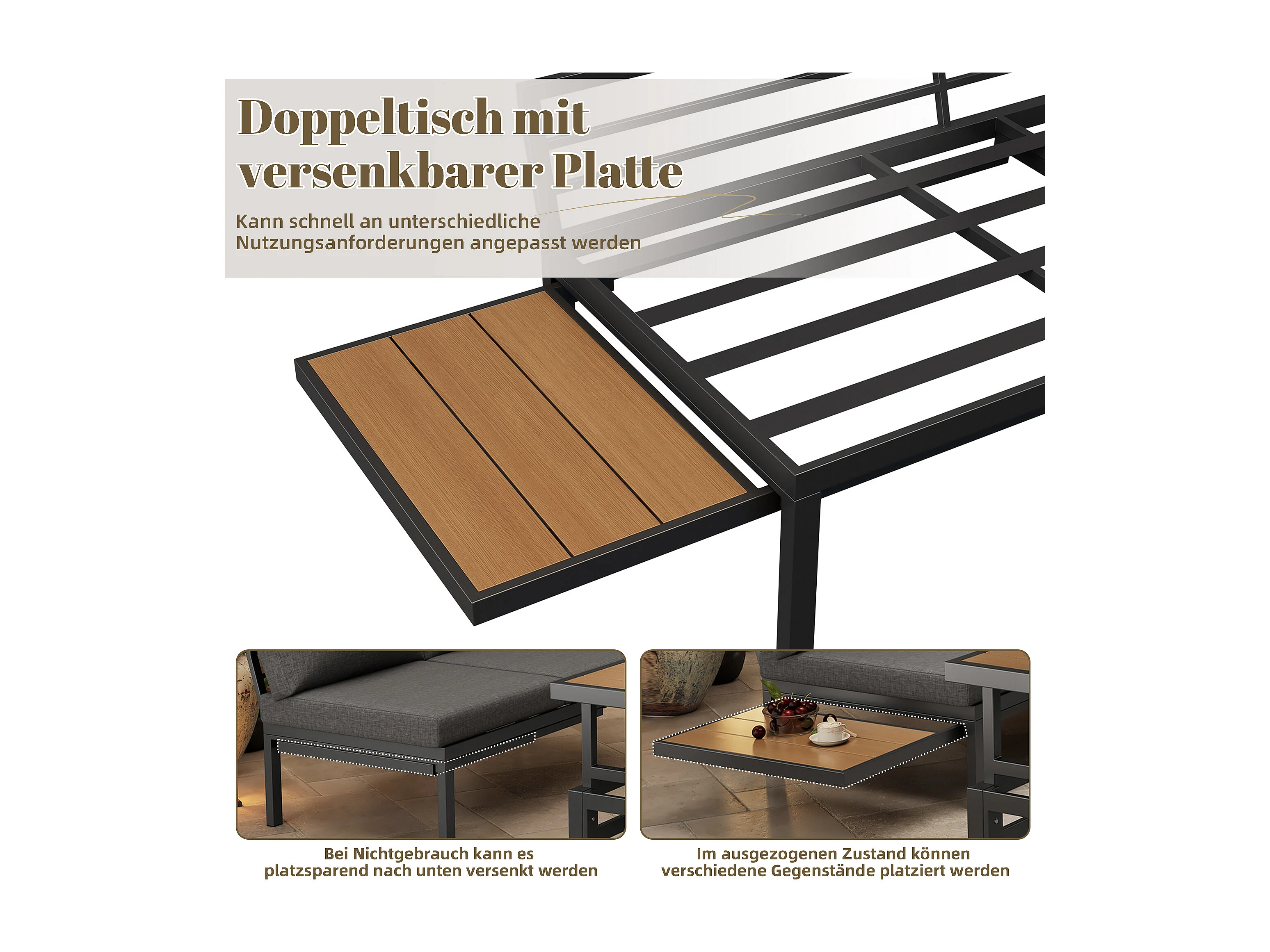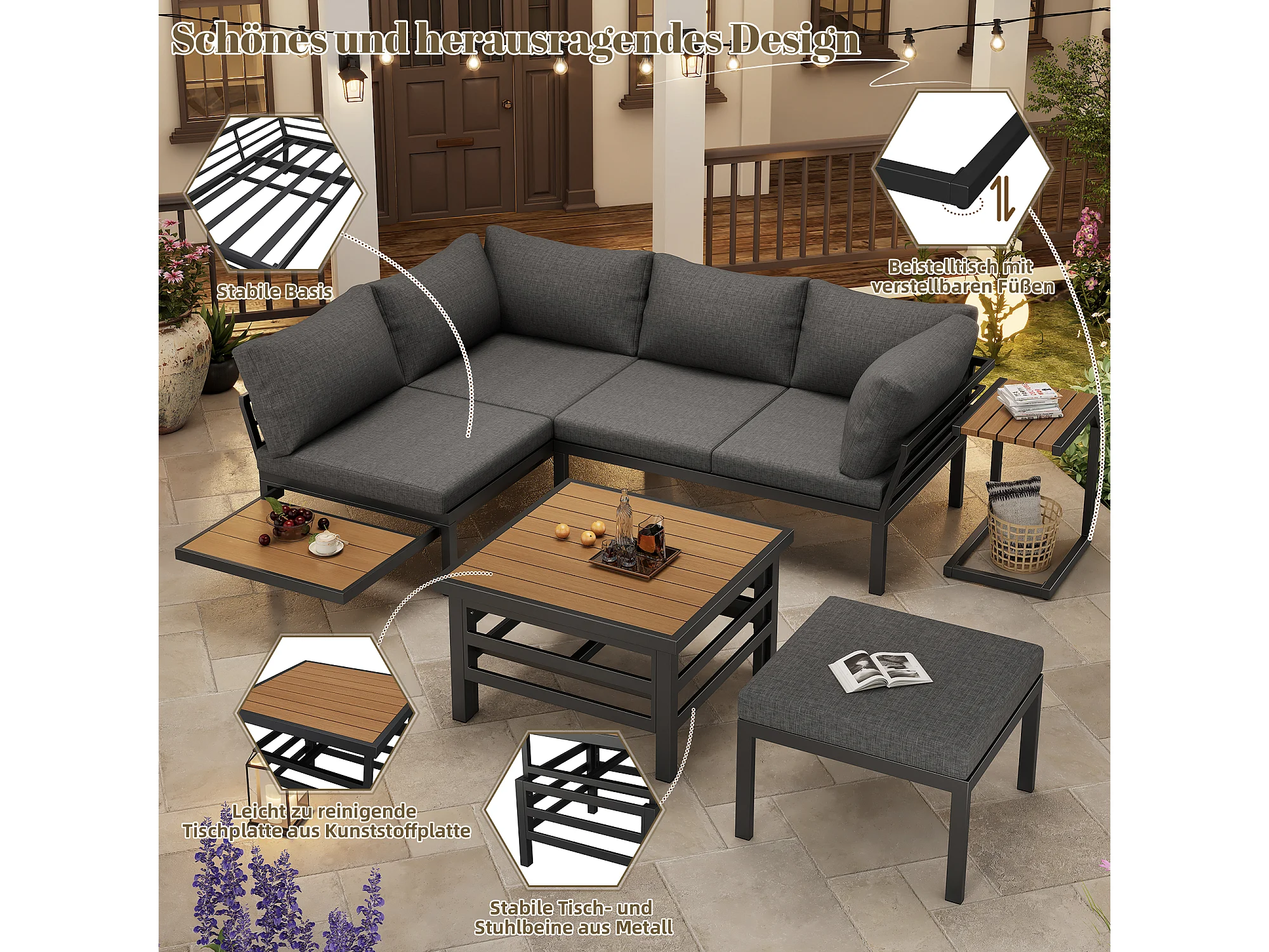 Modulare Gartenmöbel aus verzinktem Eisen: 2 2-Sitzer-Sofas + 1 Hocker + hochklappbarer Couchtisch + 1 Beistelltisch - Grau