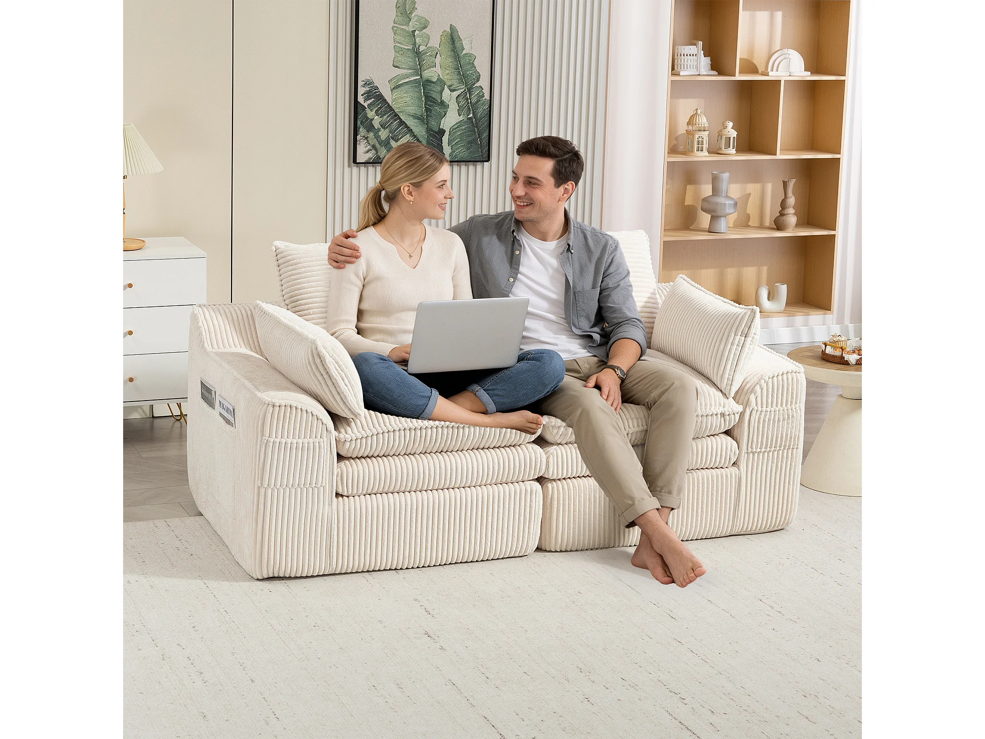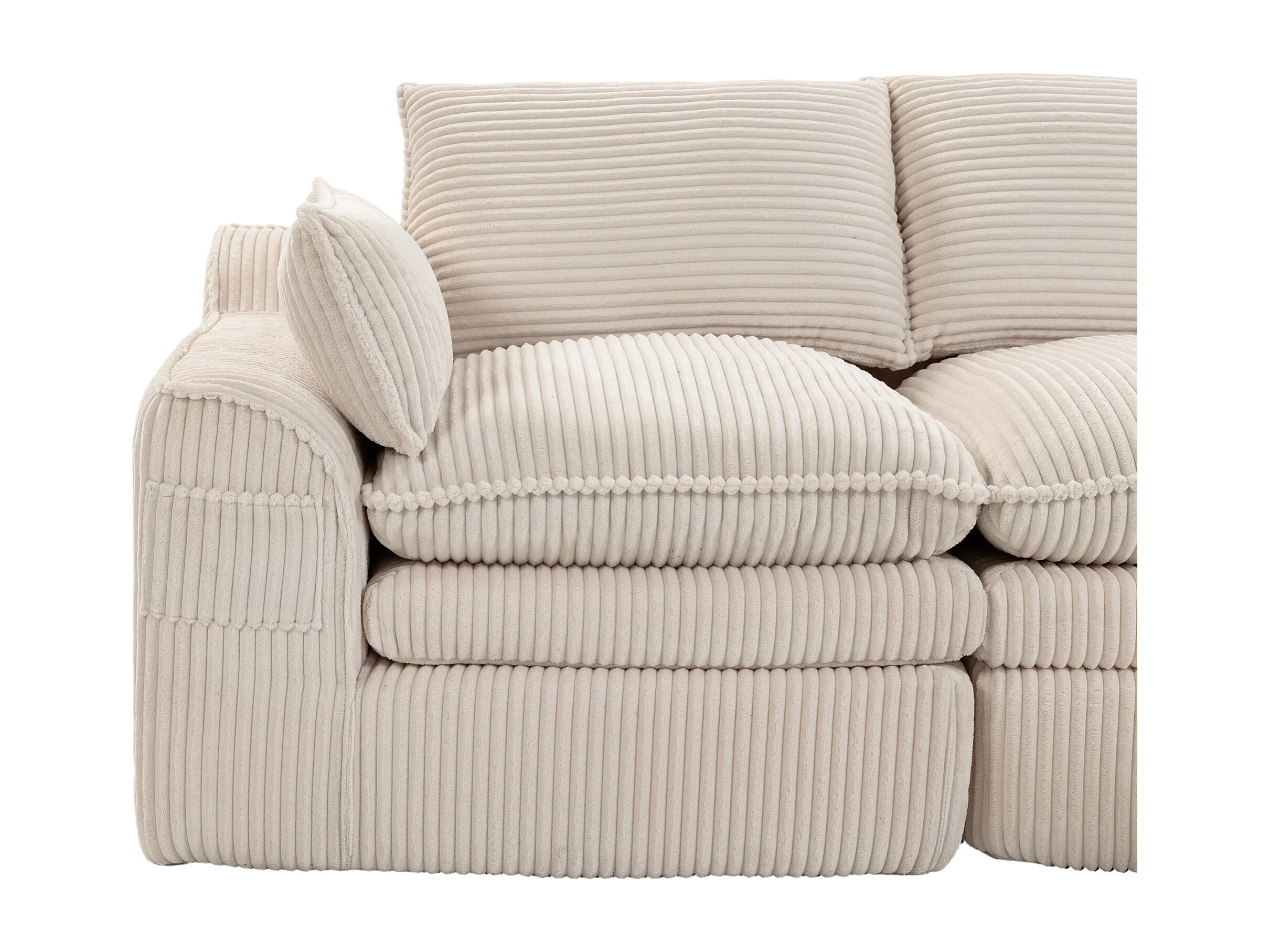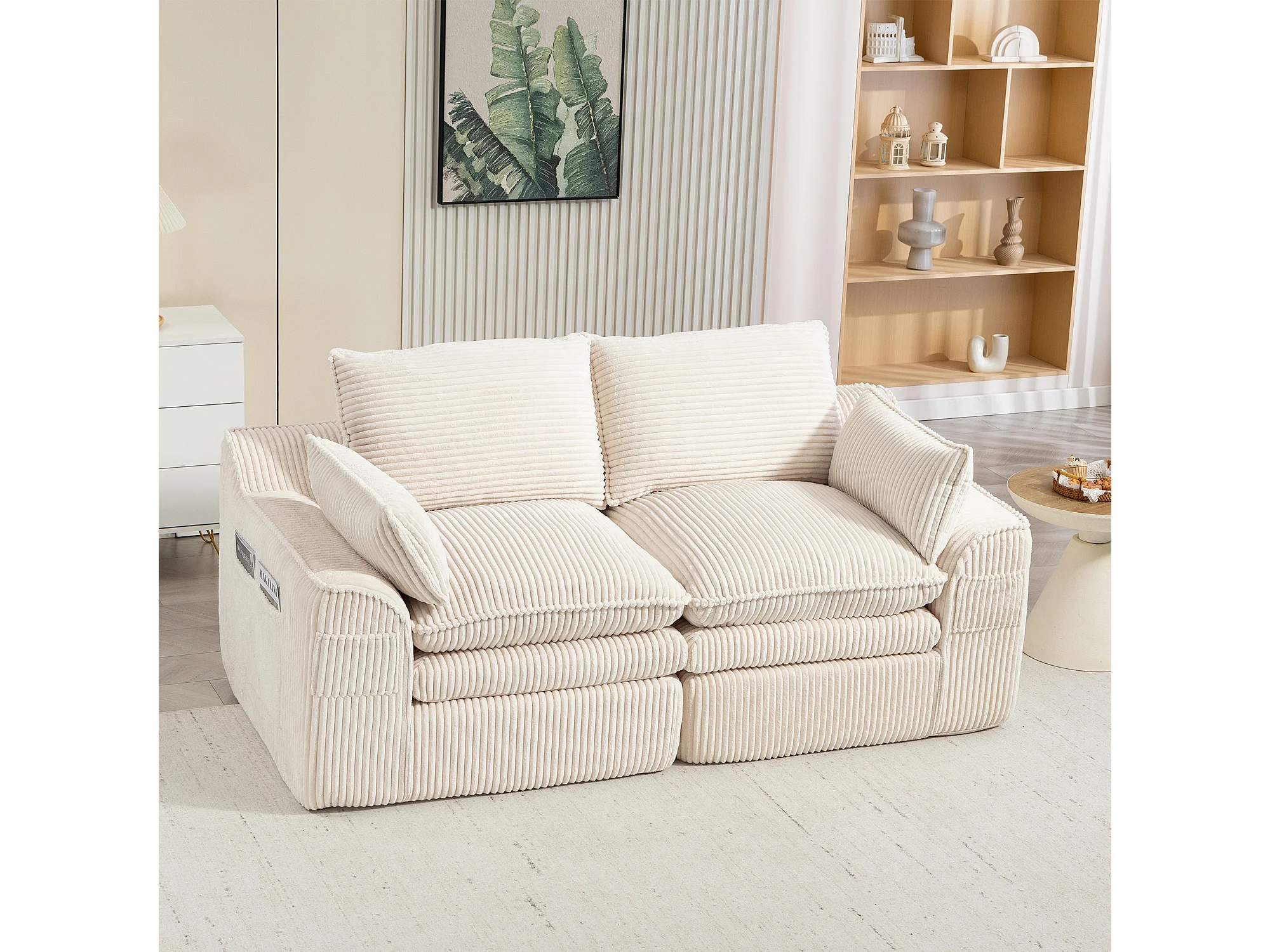 Modulares 2-Sitzer-Sofa aus Cord – 191 x 94 x 85 cm – mit 1 Hocker + Kissen + 2 Taschen – beige