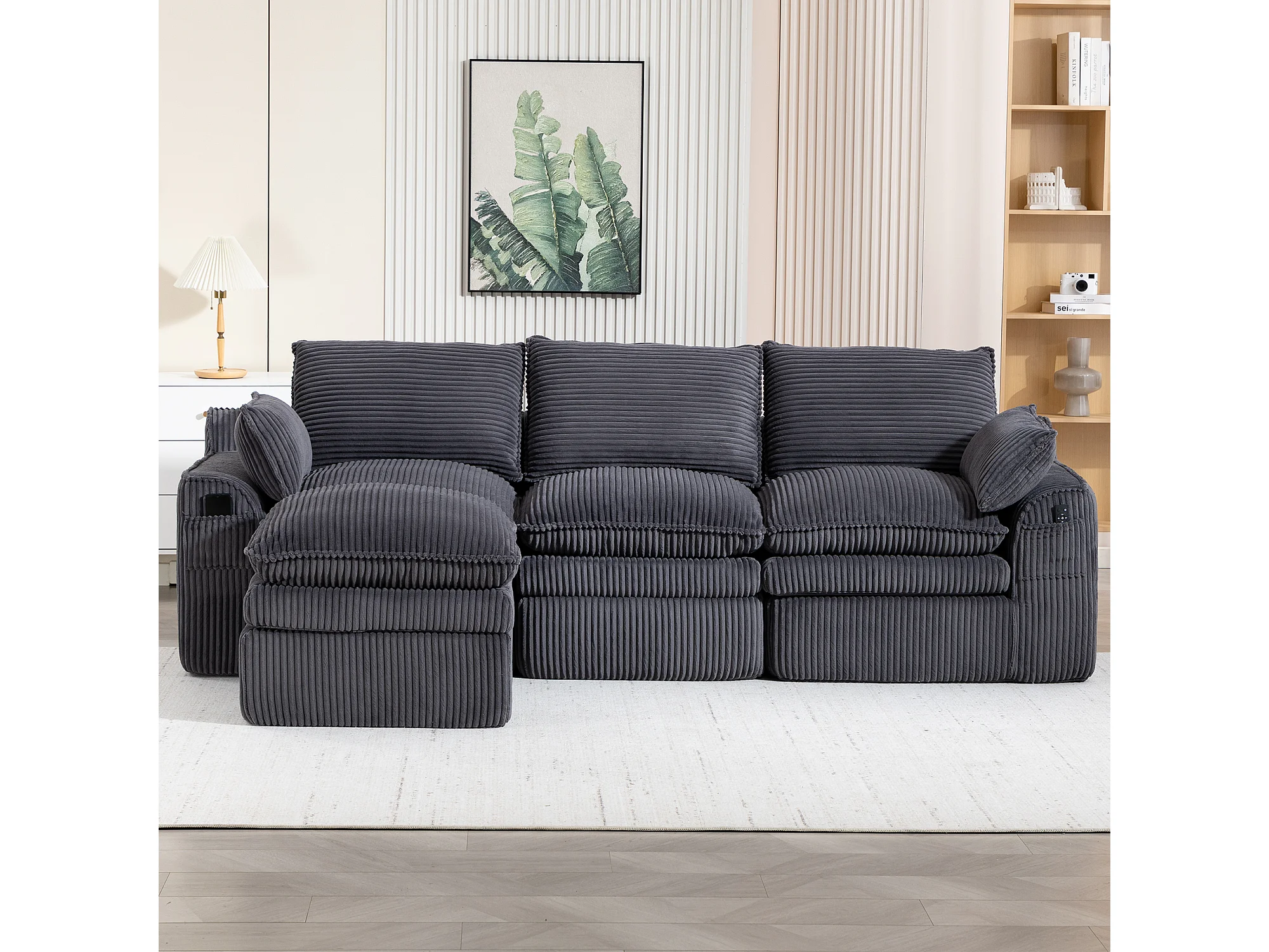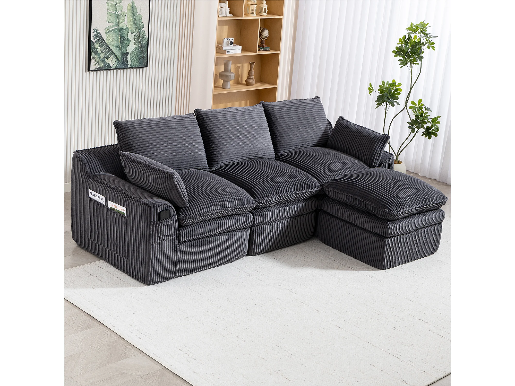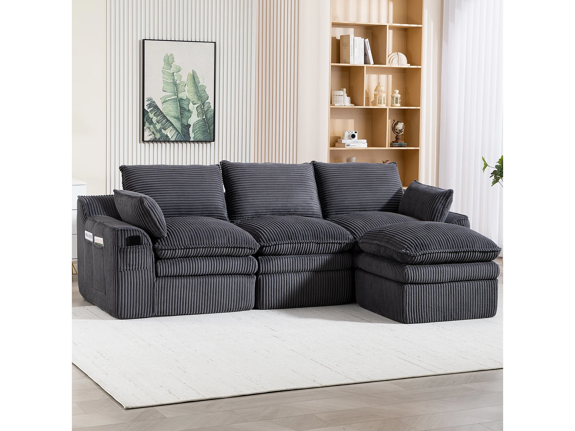Modulares 3-Sitzer-Cordsofa-Set – 263 x 167 x 85 cm – mit 1 Hocker + Kissen + 2 Taschen – dunkelgrau