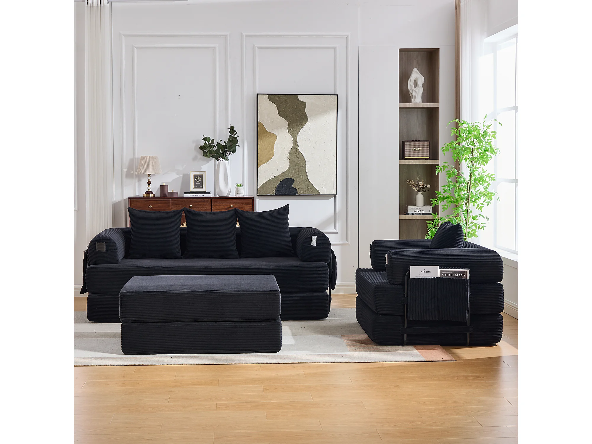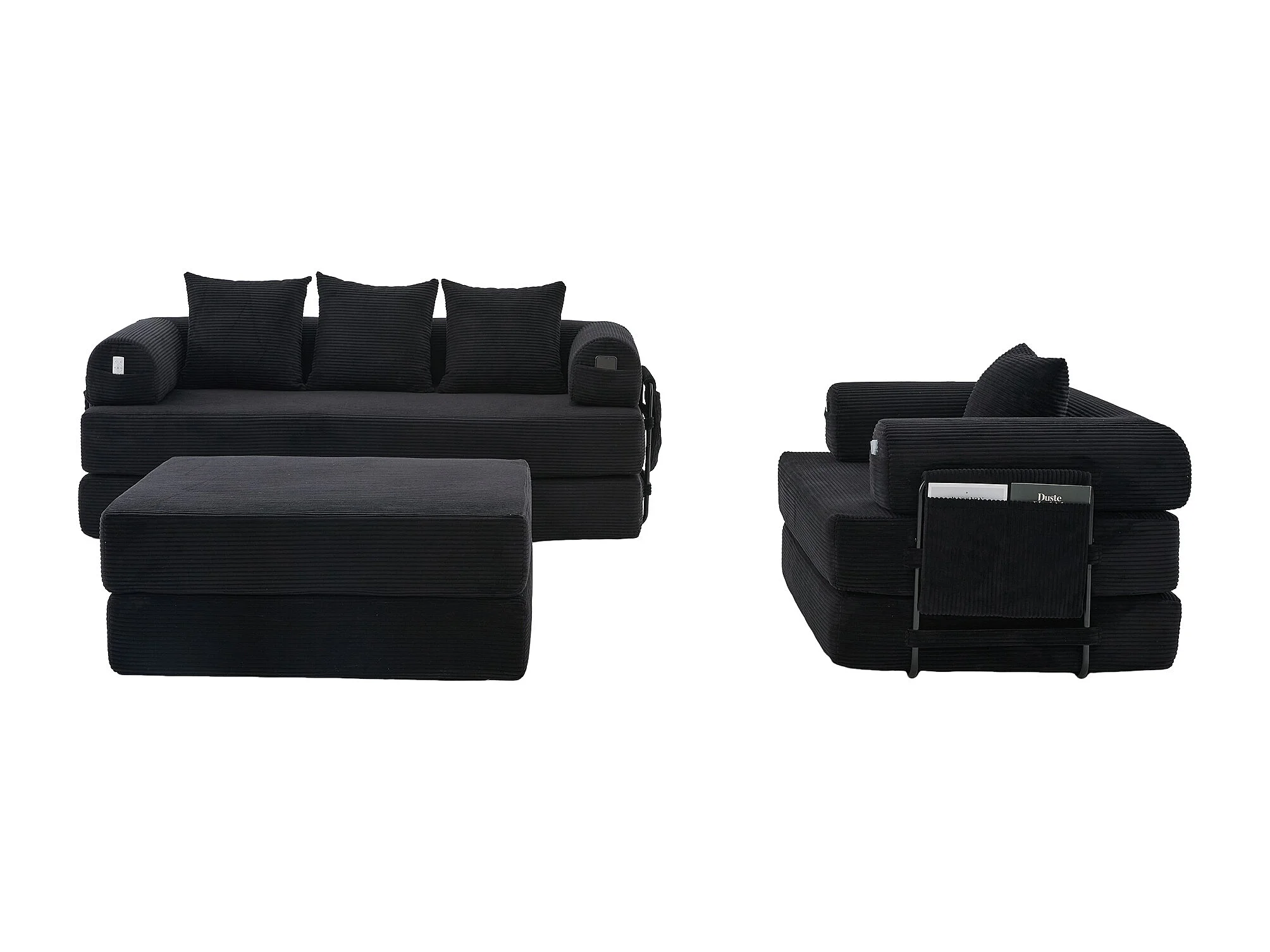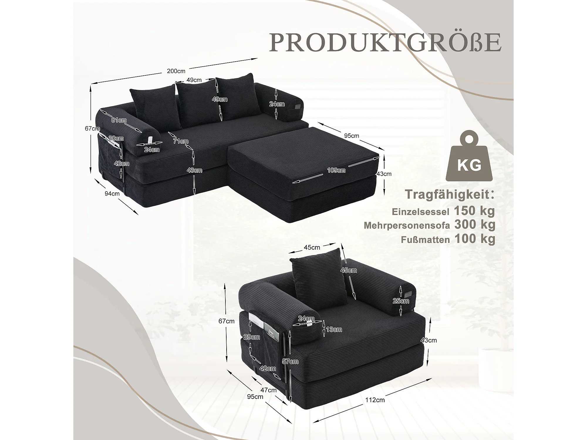 Modulares 4-Sitzer-Sofa-Set – 200 x 190 x 67 cm – mit 4 Kissen + 1 Sessel – Cord – schwarz