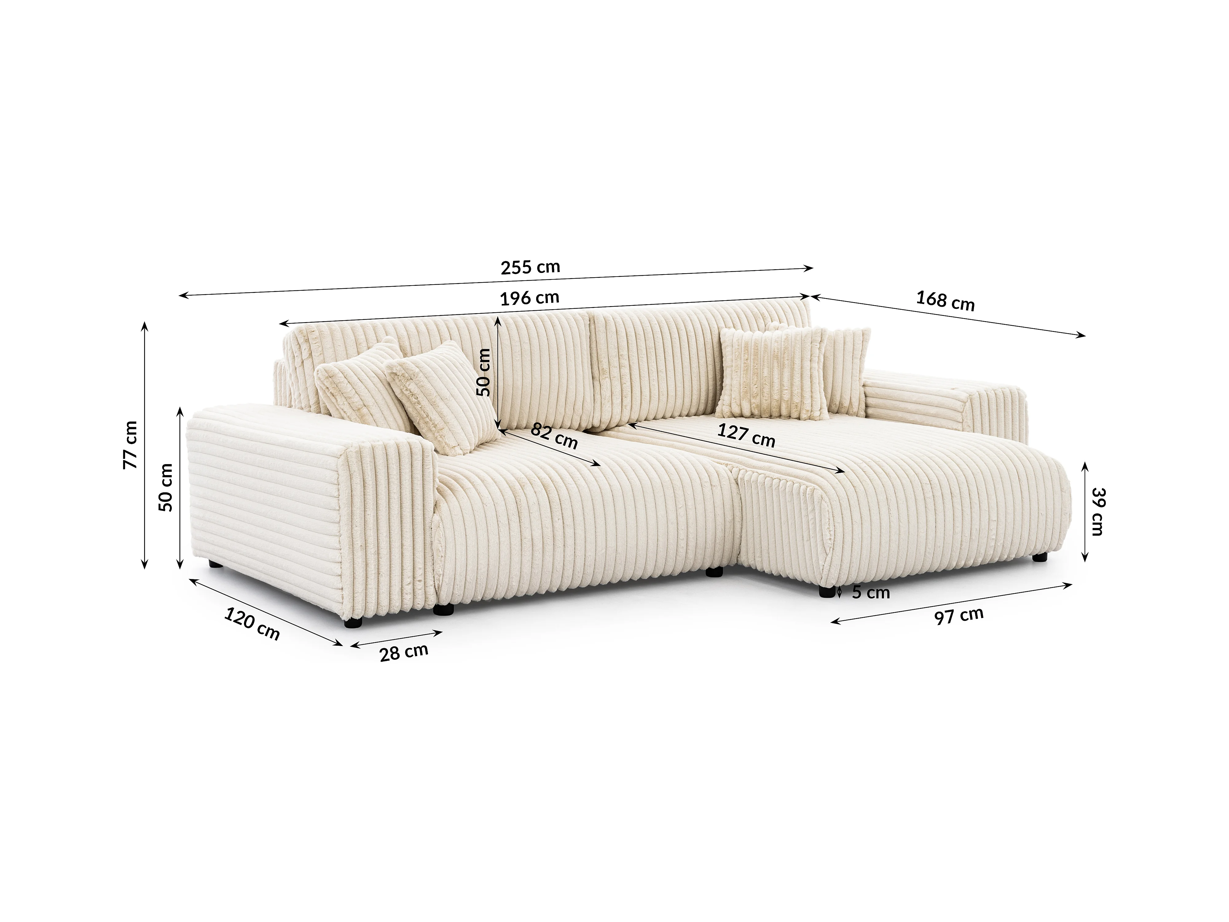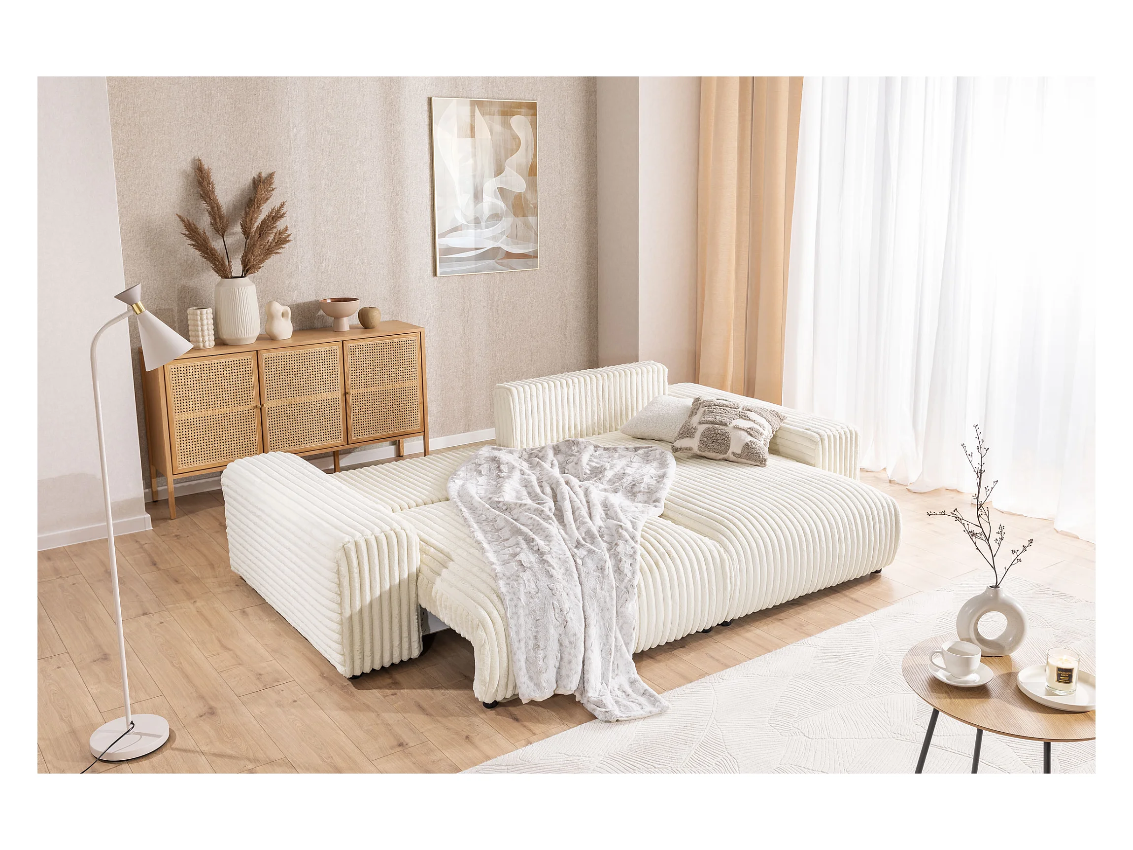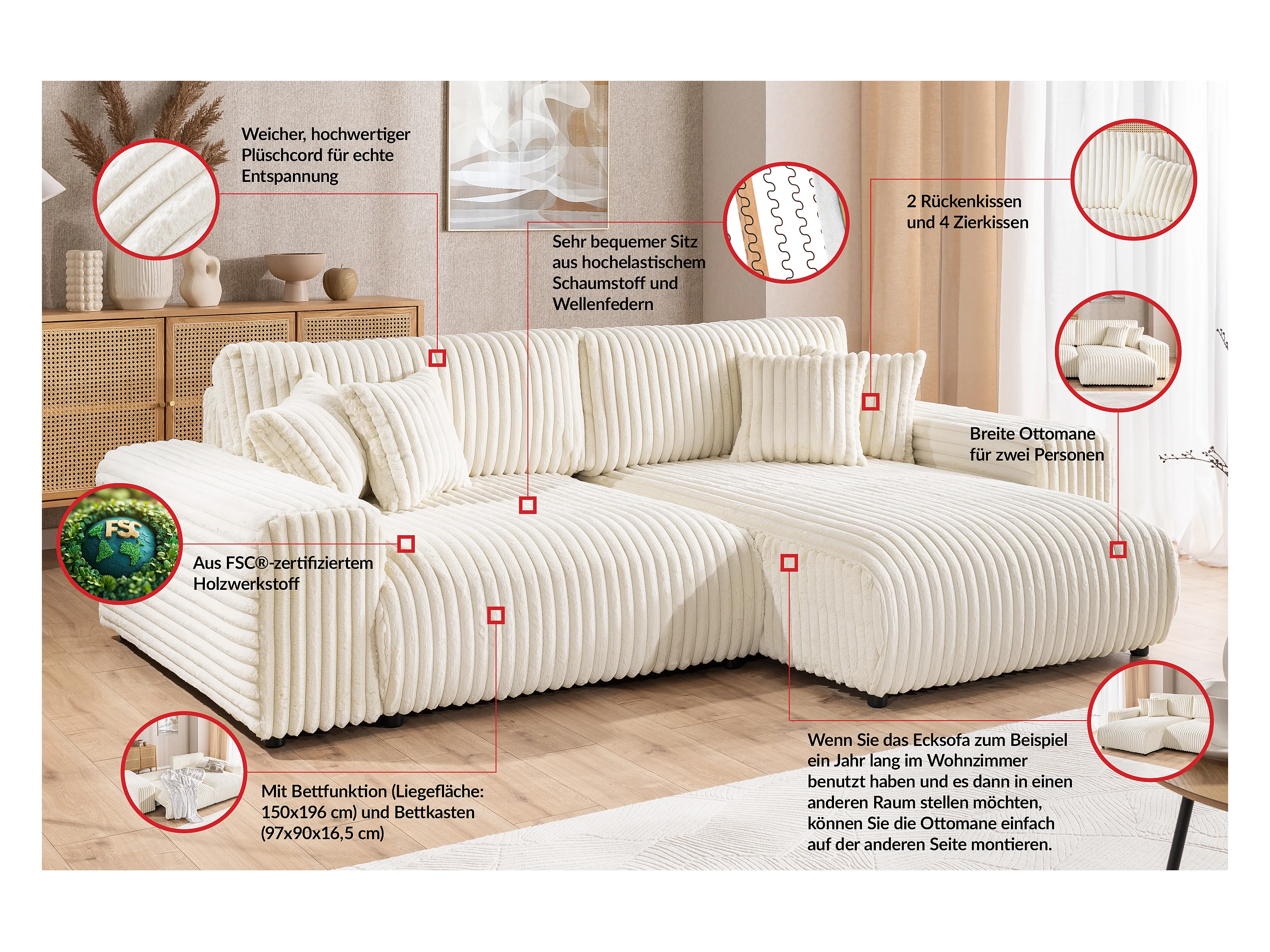 Mollis - Ecksofa mit Schlaffunktion und Bettkasten aus Hellbeige Plüschcord mit schöner Sitzkomfort