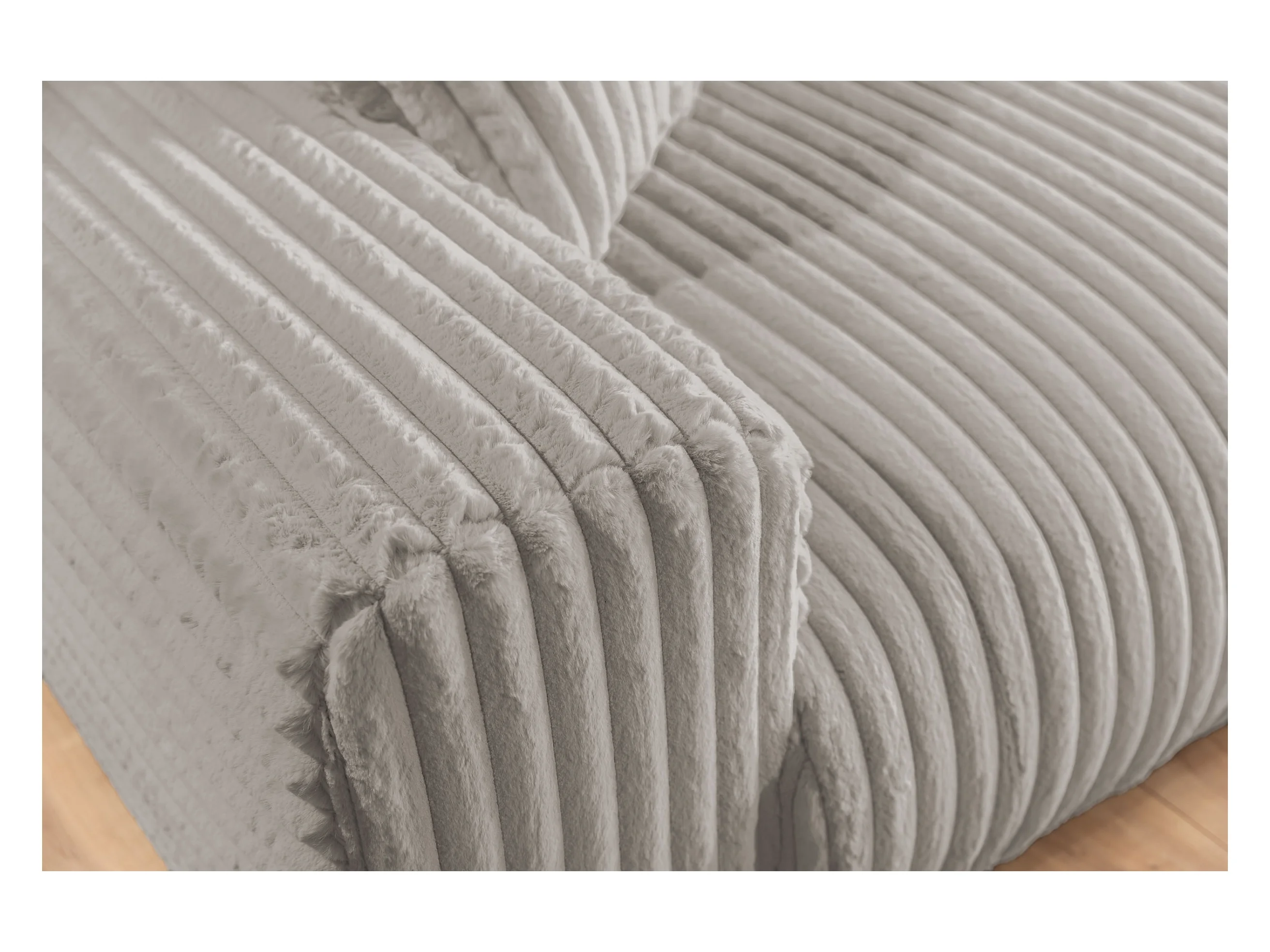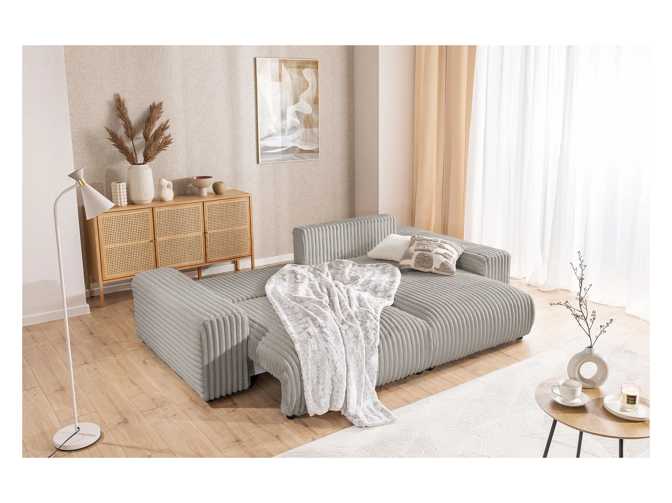 Mollis - Ecksofa mit Schlaffunktion und Bettkasten aus Hellgrau Plüschcord mit schöner Sitzkomfort