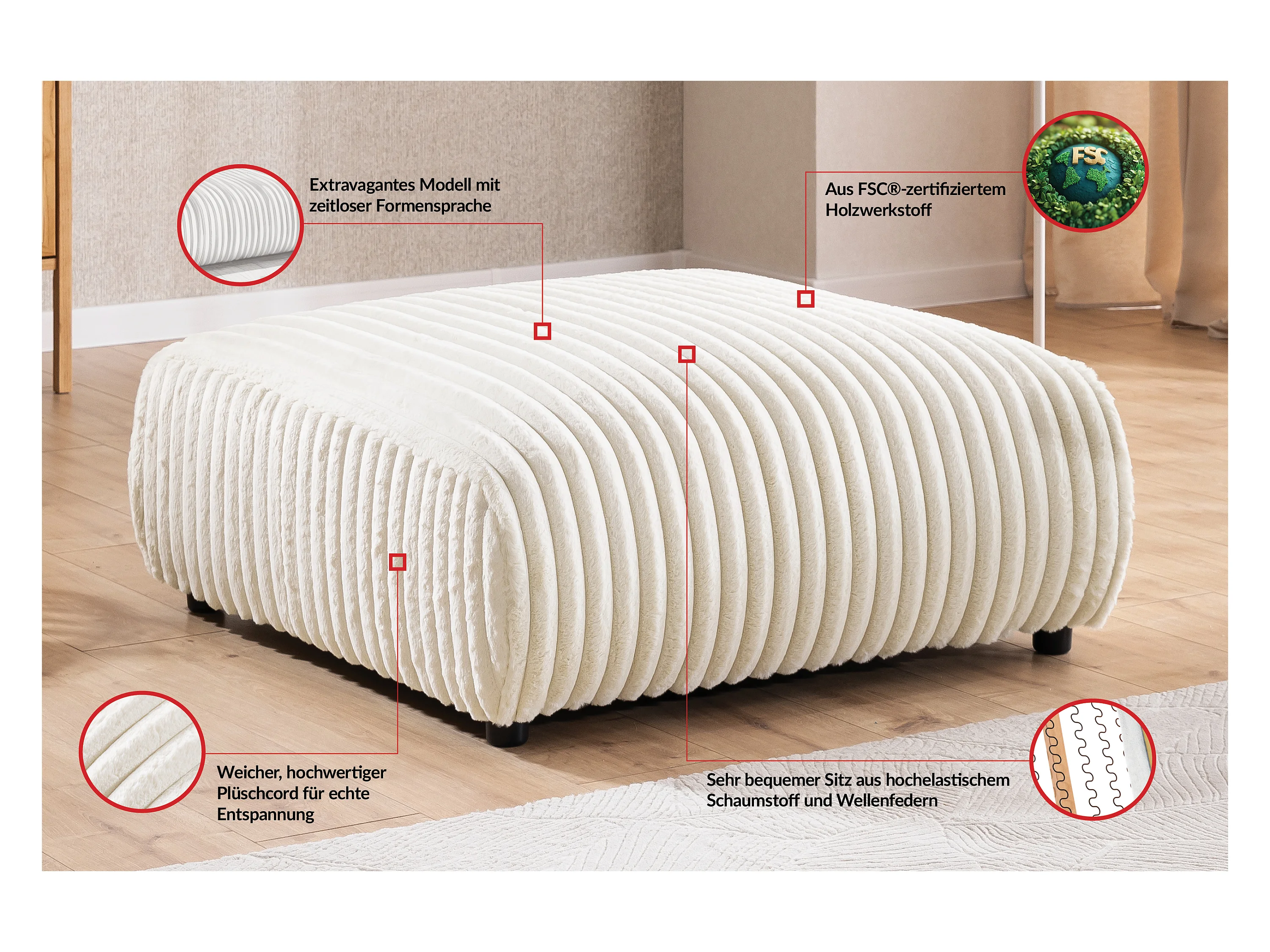Mollis - Hocker aus Hellbeige Plüschcord schöner Sitzkomfort