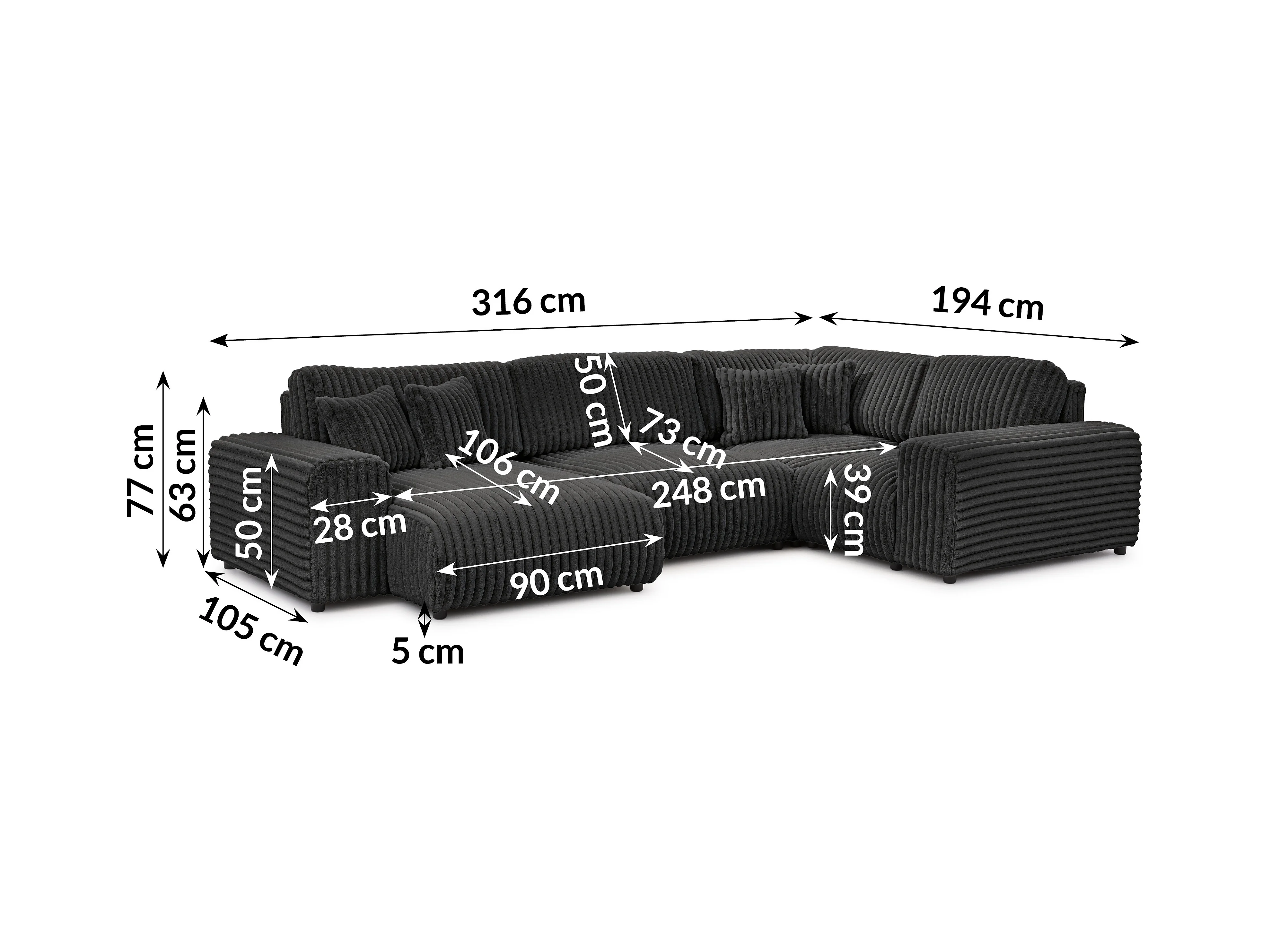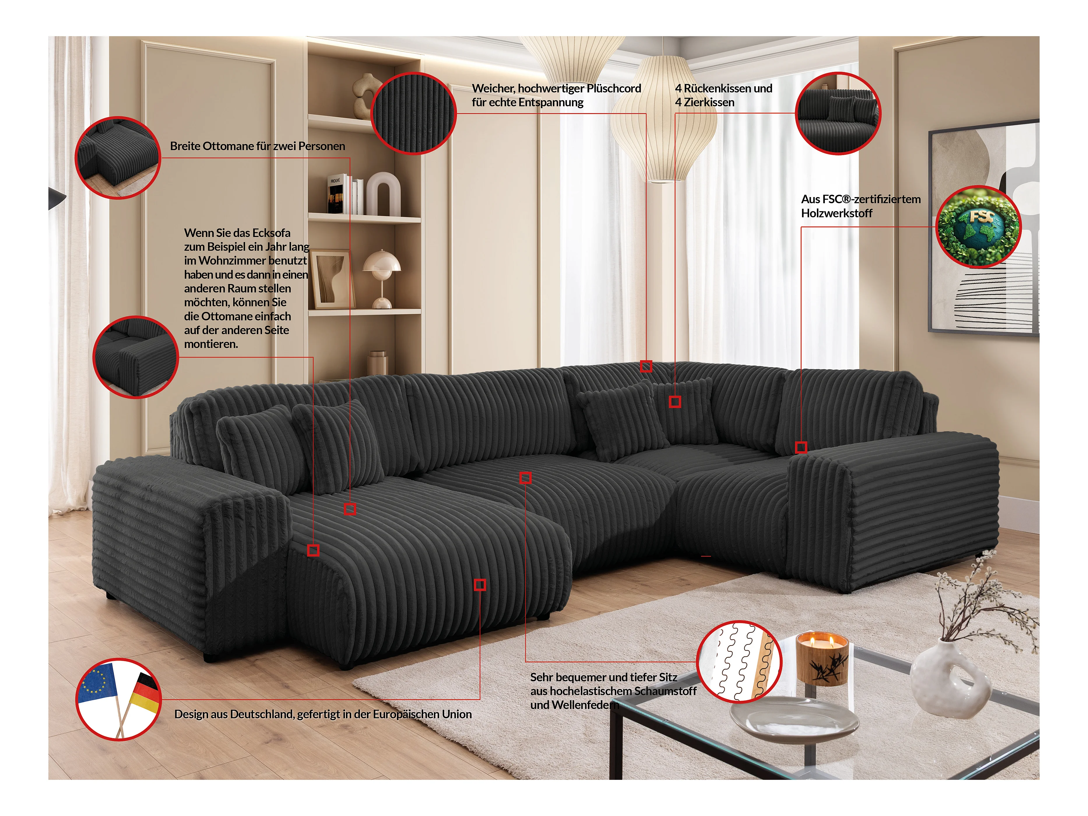 Mollis - Wohnlandschaft im XXL-Format aus Dunkelgrau Plüschcord mit schöner Sitzkomfort