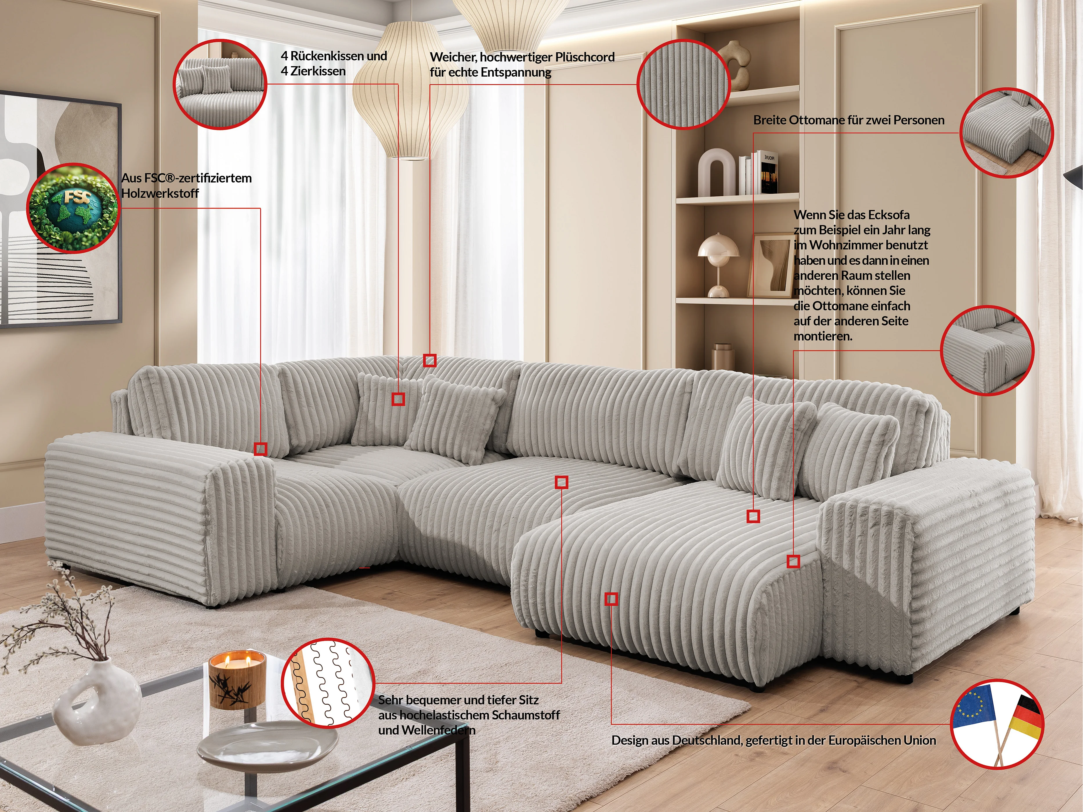 Mollis - Wohnlandschaft im XXL-Format aus Hellgrau Plüschcord mit schöner Sitzkomfort