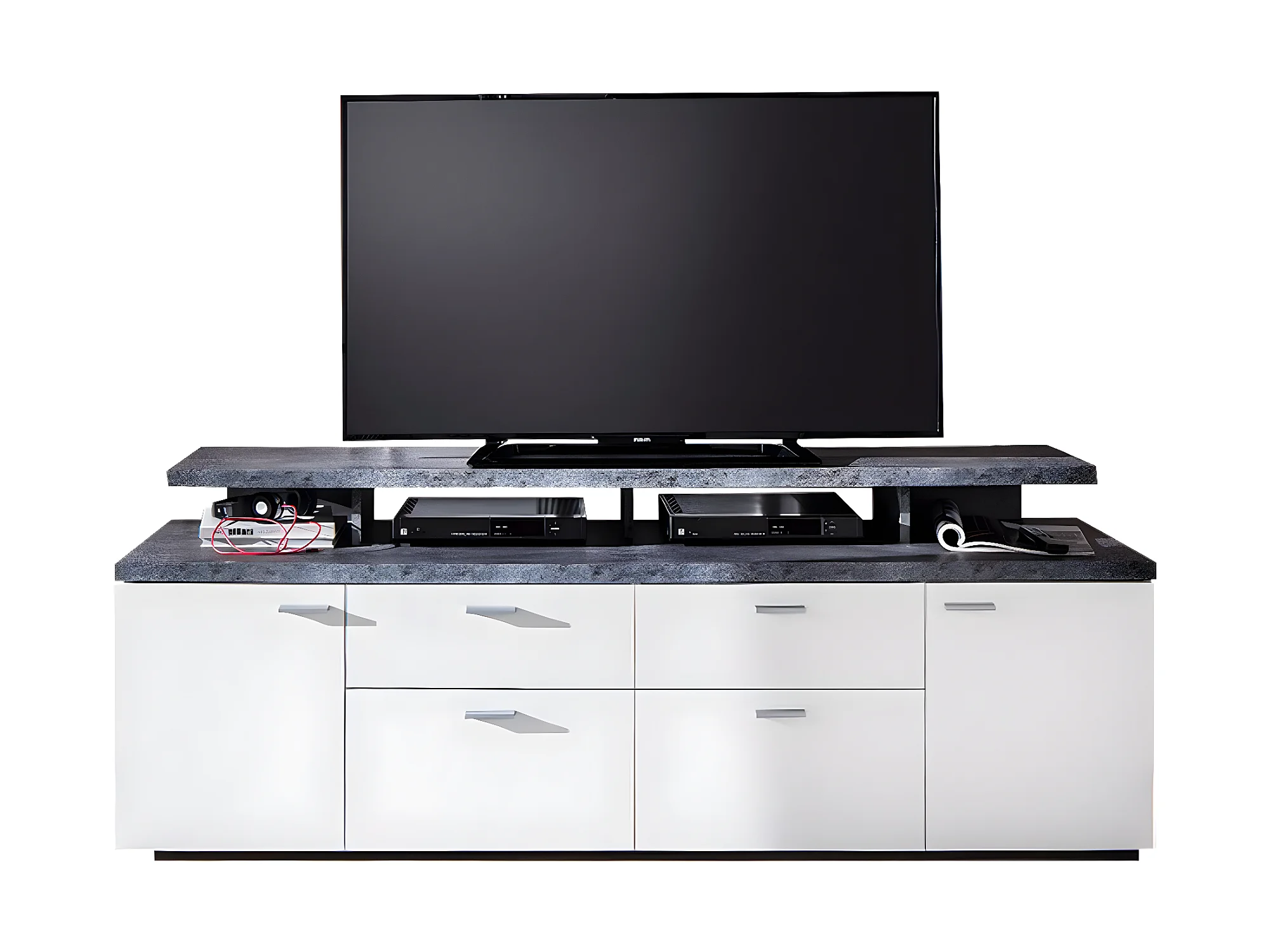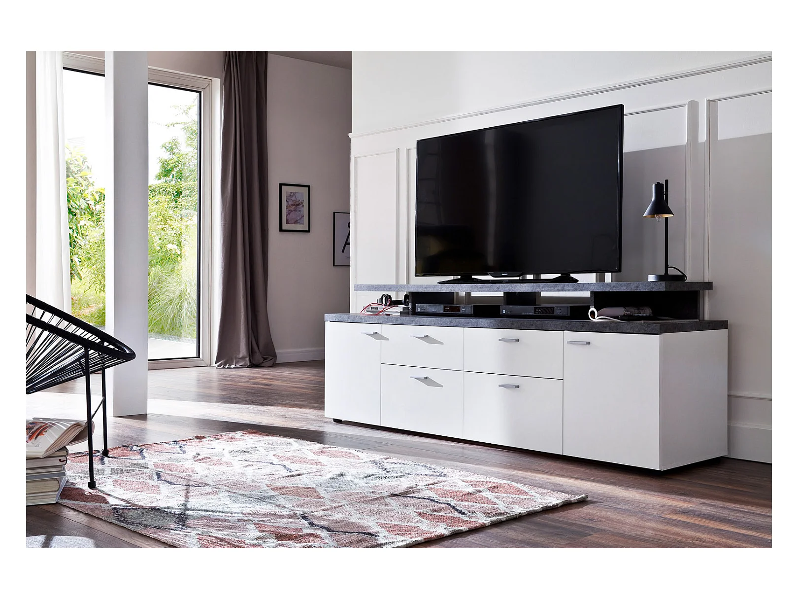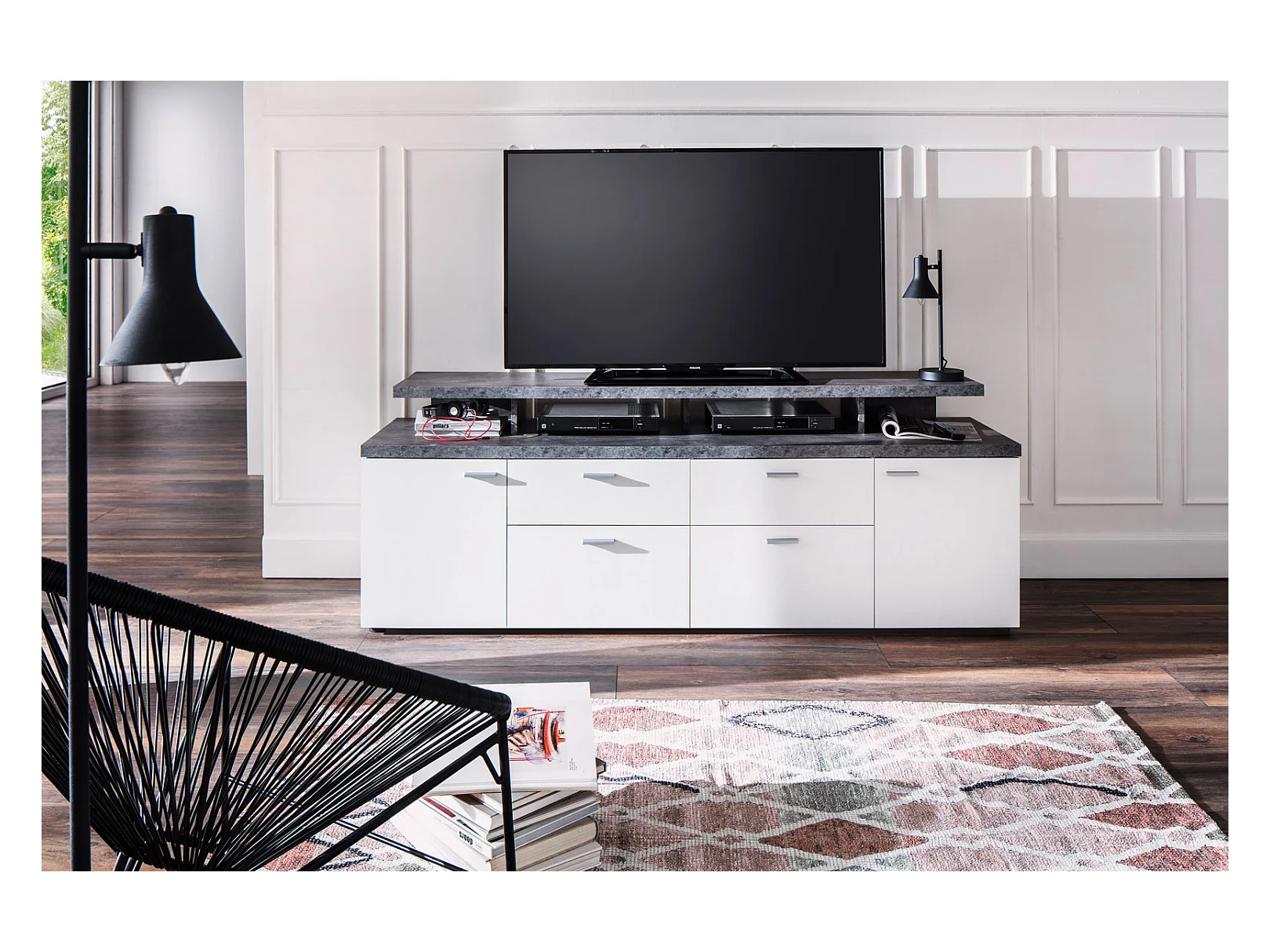 Mood TV Möbel 2 Türen, 2 Schubladen, 4 Offene Fächer, 2 Klappen weiß, Stone dekor.