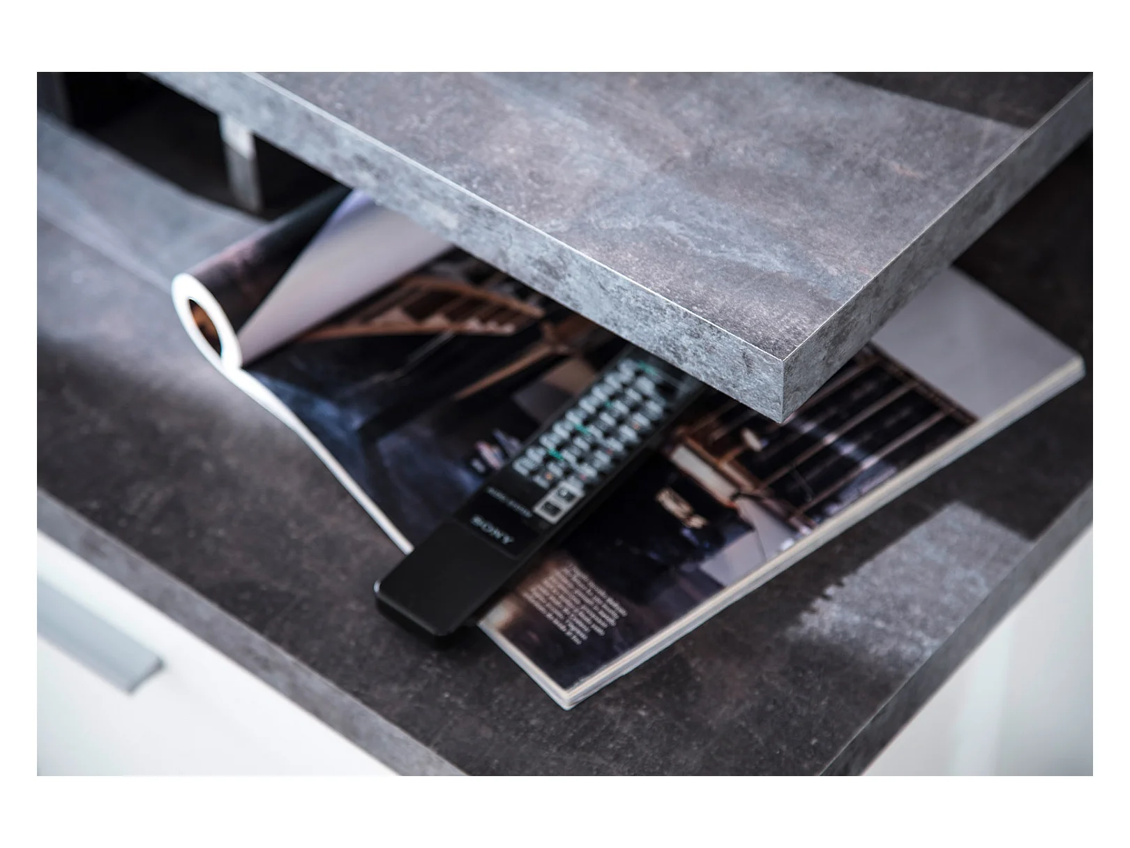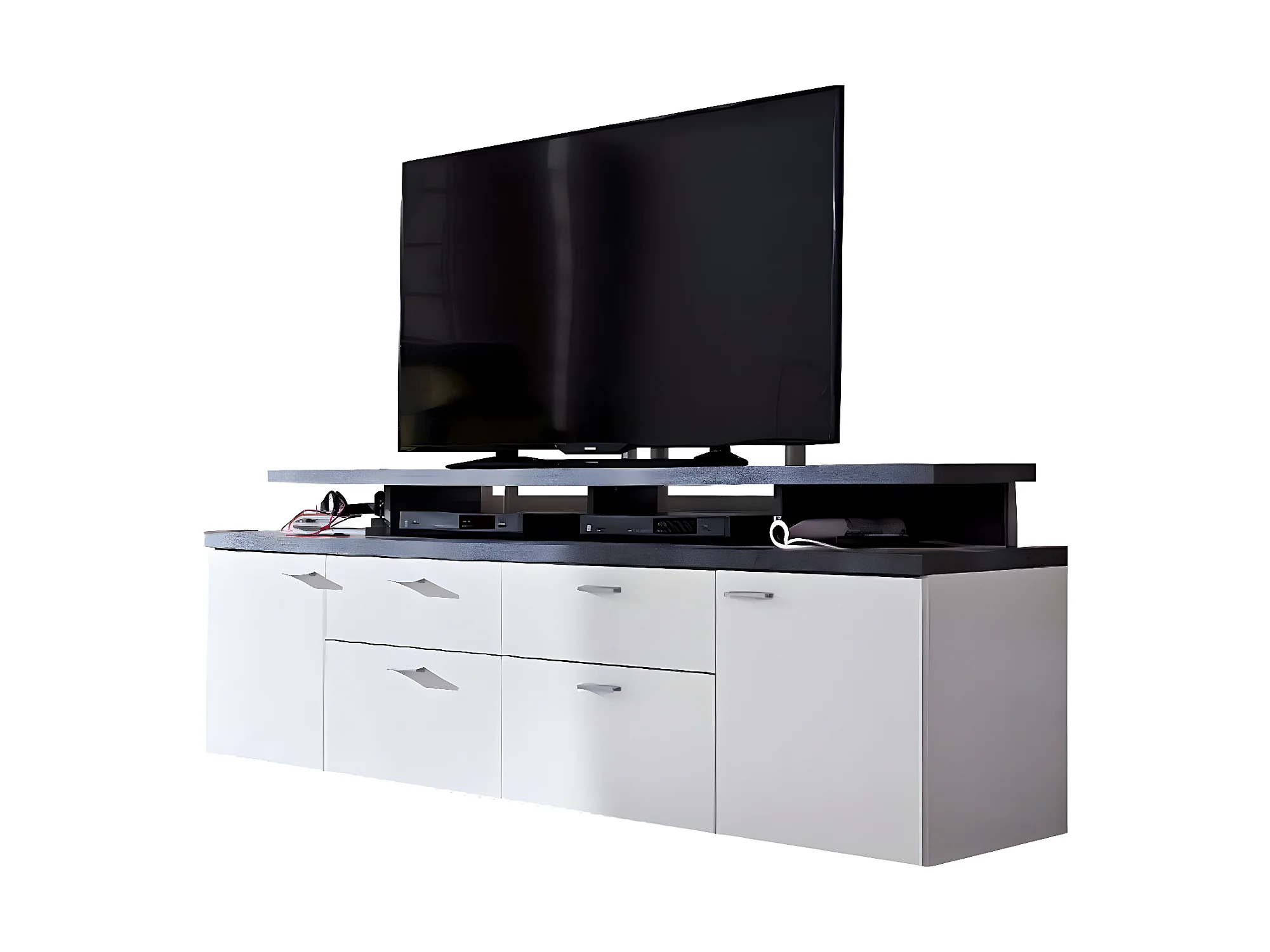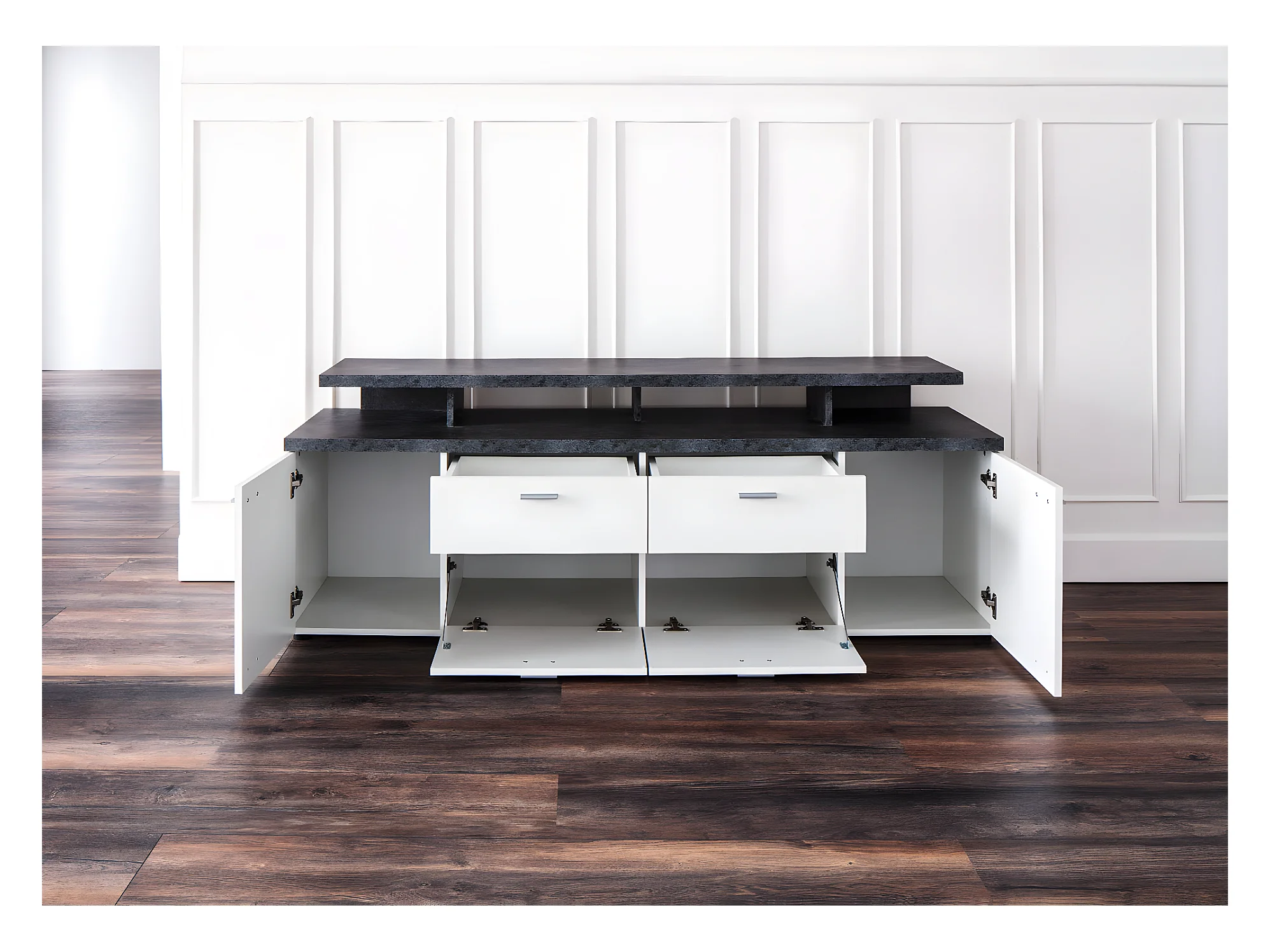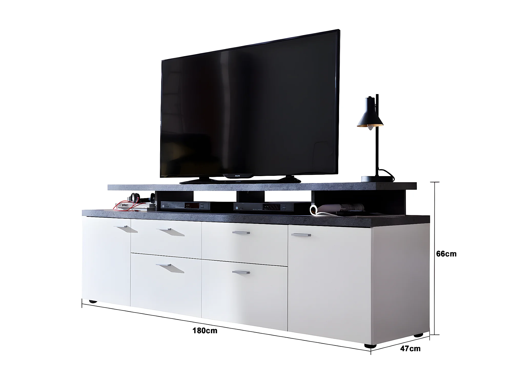 Mood TV Möbel 2 Türen, 2 Schubladen, 4 Offene Fächer, 2 Klappen weiß, Stone dekor.