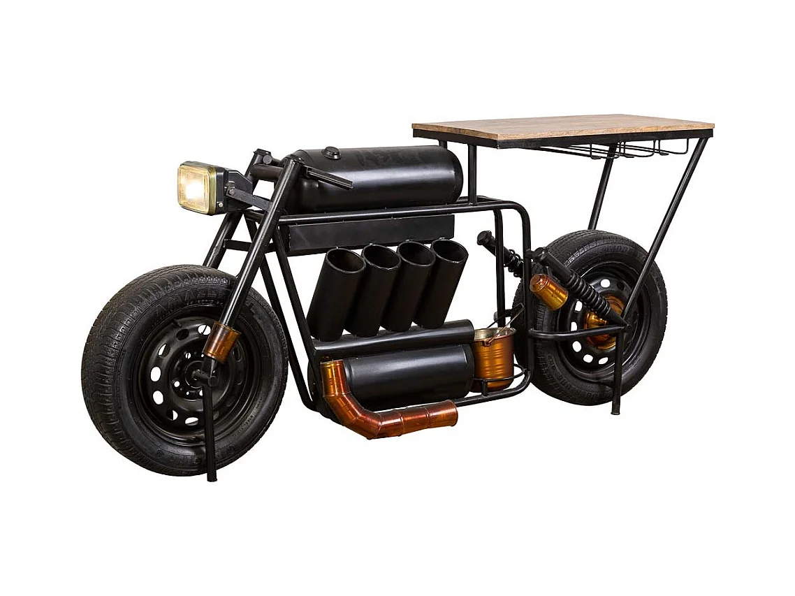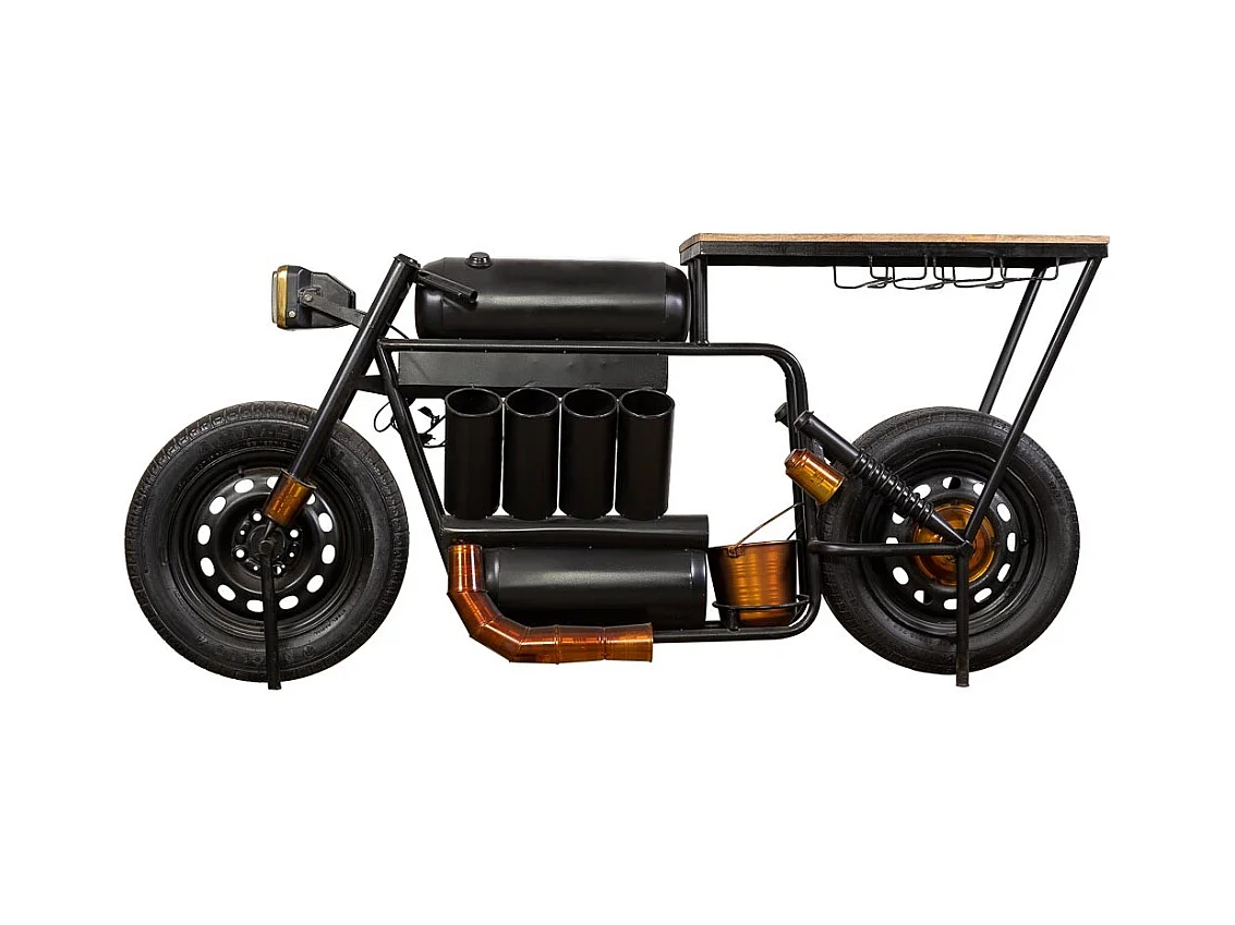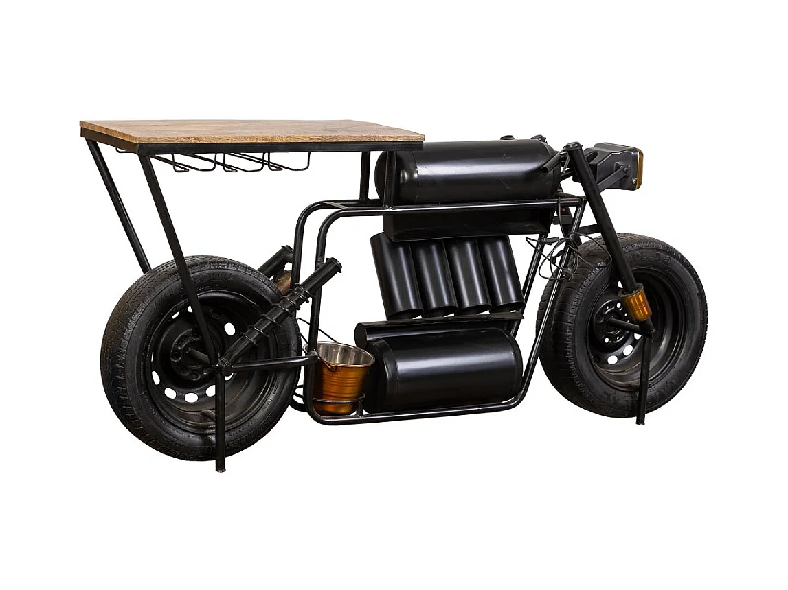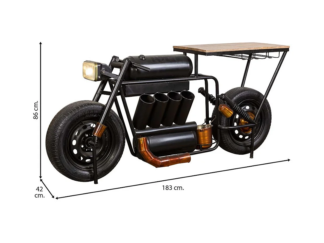 Motorrad-Flaschenhalter aus schwarzem Holz und Metall, 183 x 42 x 86 cm
