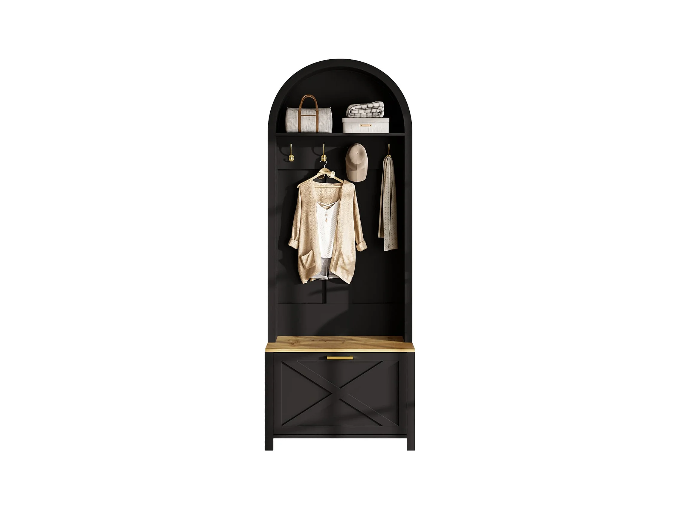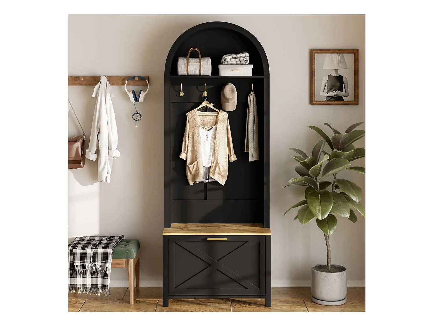 Multifunktionaler Garderobenschrank(schwarz) mit Schuhregal, Ablage & Haken,langlebiger MDF Korpus,stabile Eisenfüße,praktische Aufbewahrung