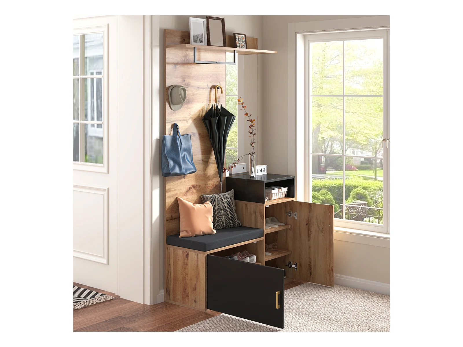 Multifunktionales Garderobenset - Garderobe mit 4 Haken, Spiegel, Schuhschrank - Wandgarderobe, Oberregal, Eingangsgarderobenbank 104x38,5x190cm
