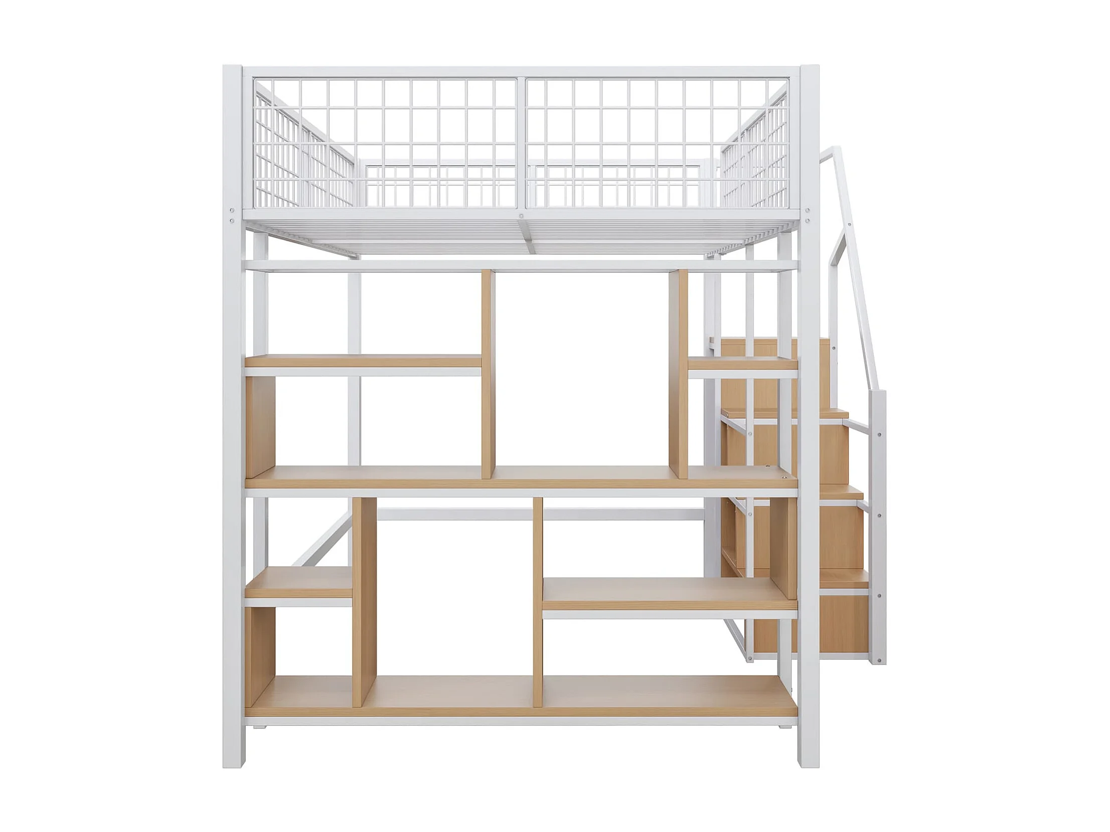 Multifunktionales Hochbett 140 x 200 cm, Metallbett mit Stauraum, Ablageflächen und Treppe, Erwachsenenbett und Kinderbett, Weiß