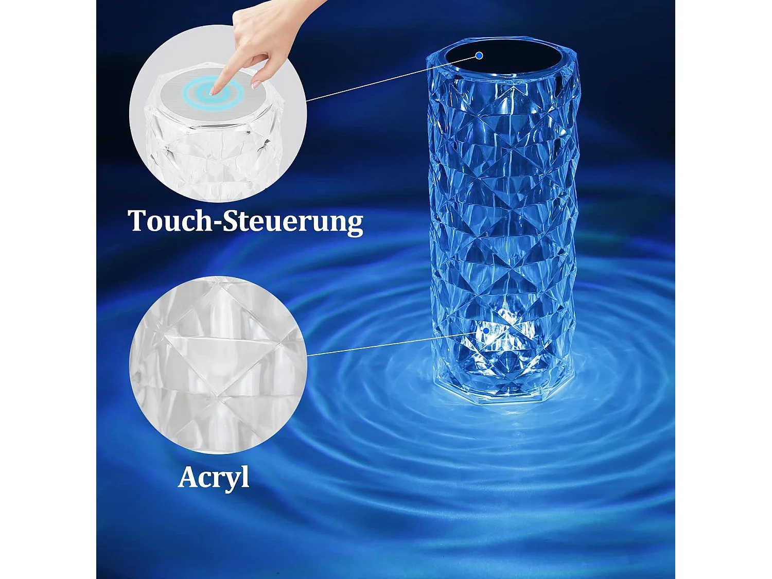NETTLIFE Kabellose LED-Tischlampe fürs Bett – dimmbare Tischlampe mit Touch-Funktion aus Kristall, wiederaufladbare RGB-Lampe