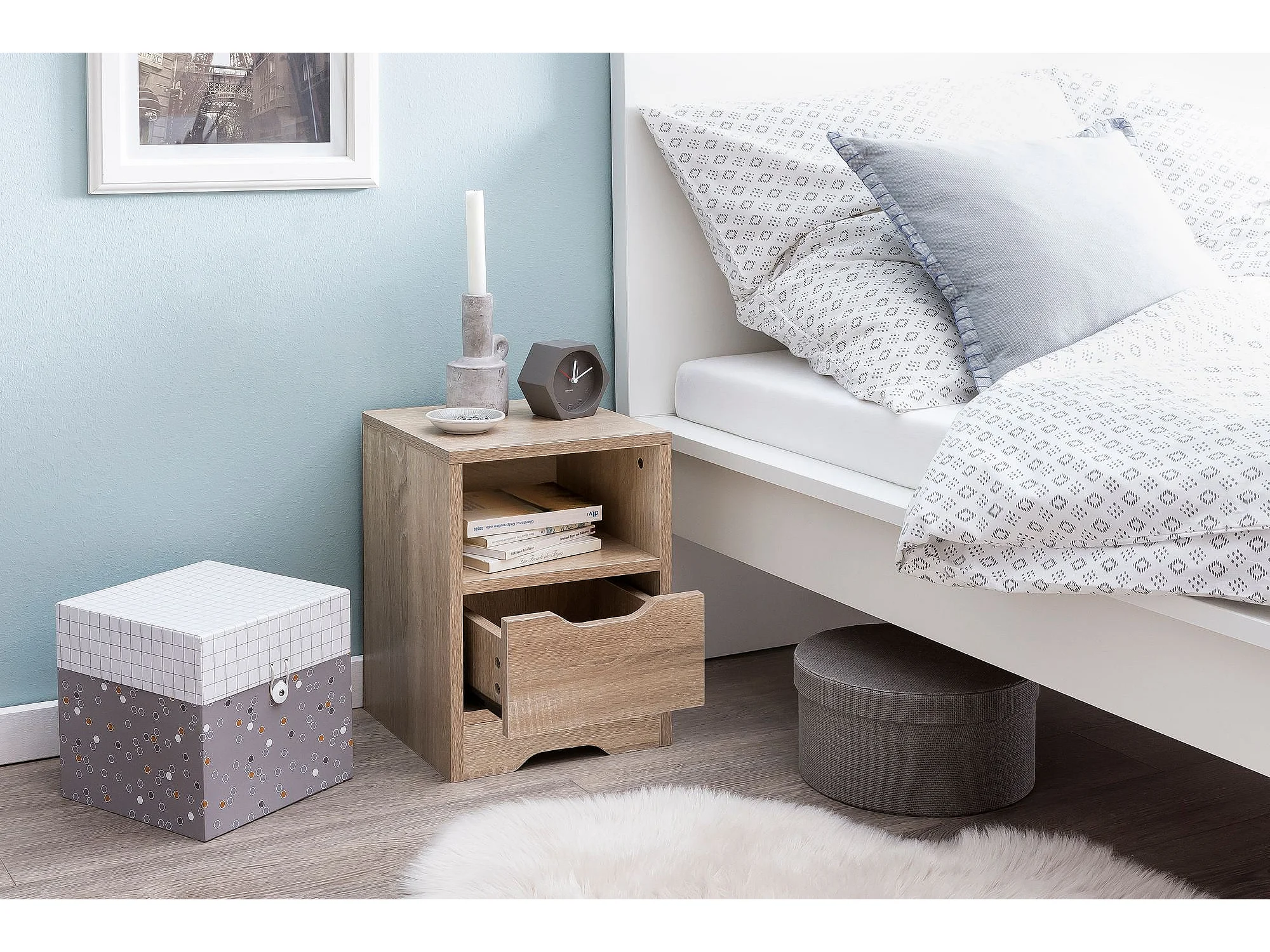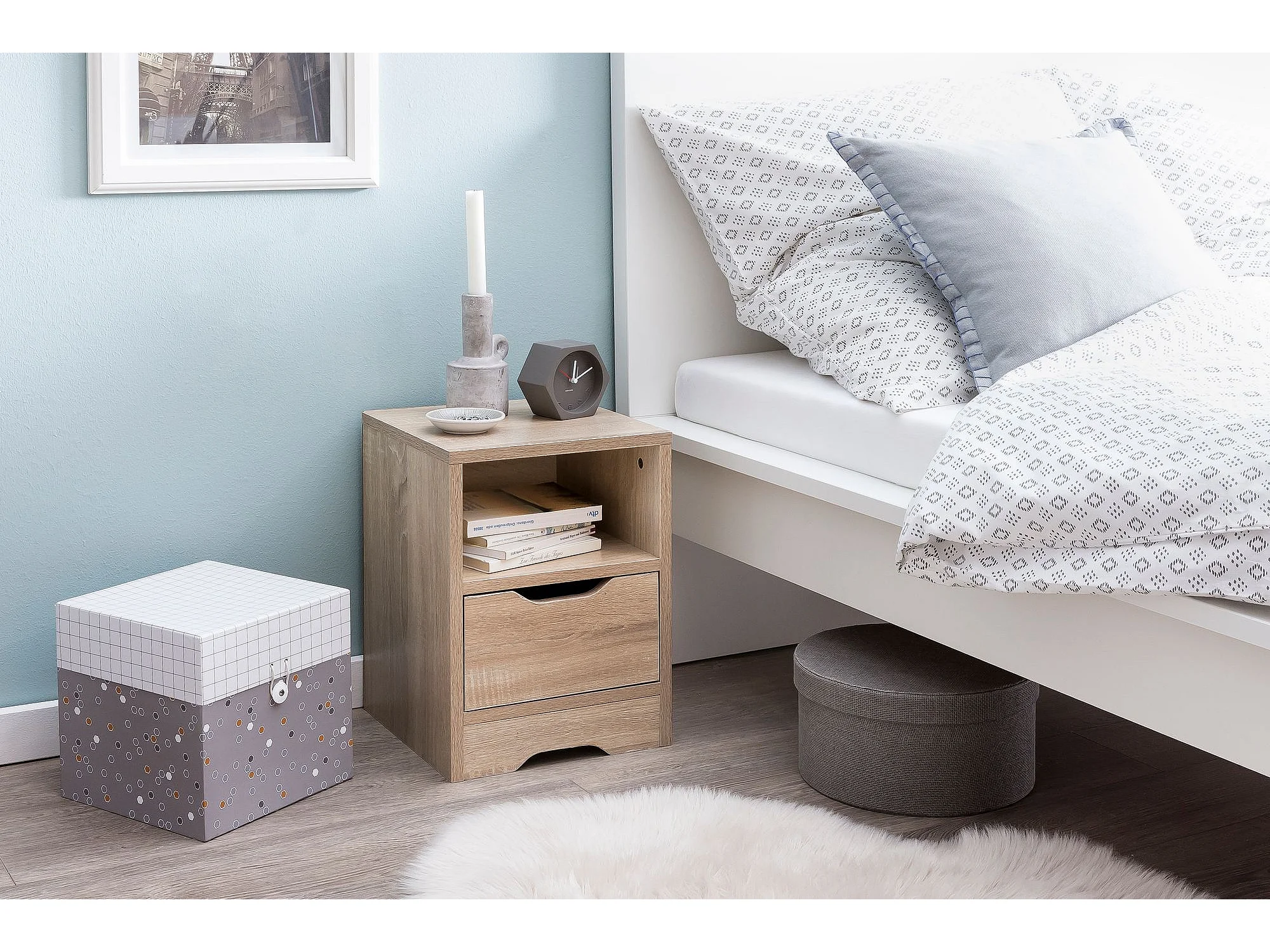 Nachtkonsole WL5.701 31x43x31 cm Sonoma 1 Schublade und Ablagefach, Weisse Nachtkommode mit