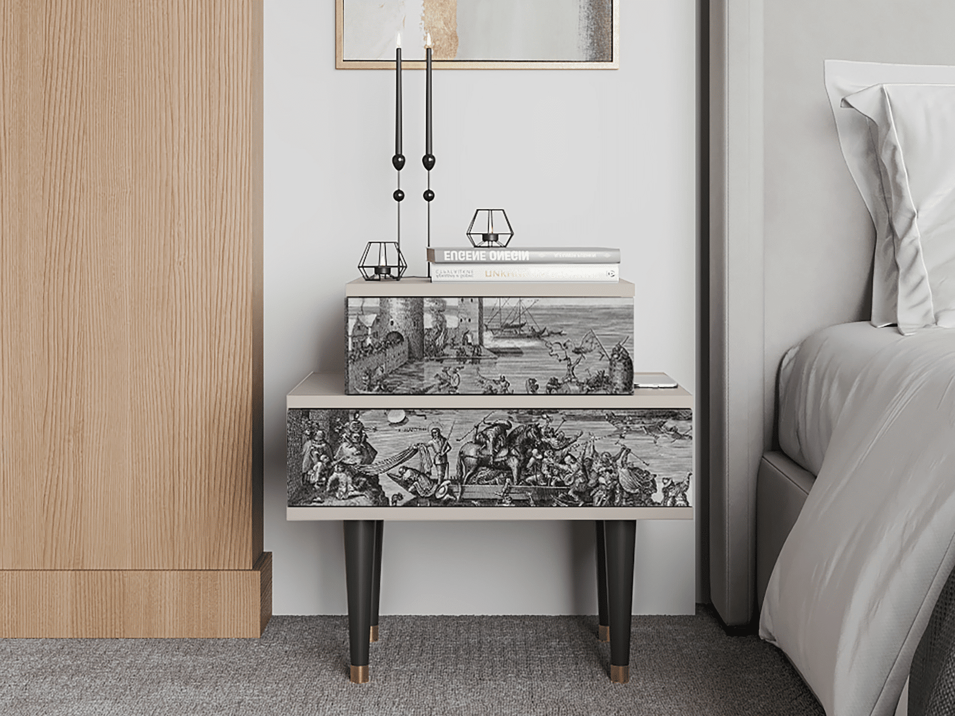NS1 – Der Kleine, aber Mutige Eine außergewöhnliche Persönlichkeit unter seinen Geschwistern, der NS1 ist so vielseitig wie deine Vorstellungskraft. Klein bedeutet nicht nutzlos. Ein Platz für deine Vinylsammlung? Absolut. Ein Nachttisch? Natürlich. Ein minimalistisches Kunstwerk? Tausendmal ja. Der NS1 beweist, dass Kompaktheit kraftvoll sein kann, indem er Stil und Funktionalität in einem Format vereint, das überall passt. Jede Front ist mit höchster Präzision gefertigt, versehen mit hochwertigem UV-Druck, der dem Design Tiefe und Charakter verleiht. Die Oberfläche wird mit einem schützenden Lack versiegelt, der für Langlebigkeit und Widerstandsfähigkeit gegen Kratzer und Verblassen sorgt. Der NS1 steht auf stabilen Holzbeinen mit eleganten Metallelementen, die Stabilität mit raffinierter Eleganz verbinden. Egal ob in einem modernen, minimalistischen oder klassischen Interieur, er fügt sich harmonisch ein und verleiht dem Raum eine dezente stilvolle Note. Der NS1 ist Teil einer exklusiven Kollektion mit 16 Modellen, 6 stilvollen Farben und 208 einzigartigen Designs, sodass du die perfekte Kombination für deinen persönlichen Stil wählen kannst. Mehr als nur ein Nachttisch—es ist eine kleine, aber kraftvolle Stilentscheidung. Maße: Breite: 58 cm Höhe: 58 cm Tiefe: 48 cm