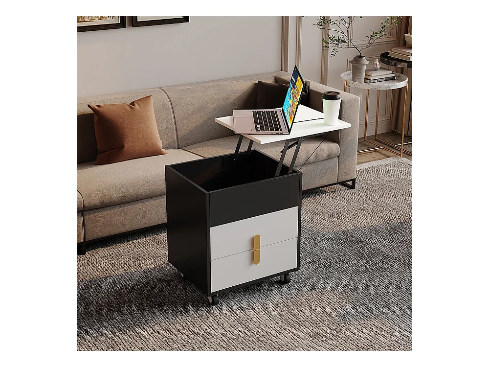 Nachttisch mit USB-Ladeanschluss, Hubtisch, abnehmbare Rollen, zwei Schubladen, schwarz + weiß.