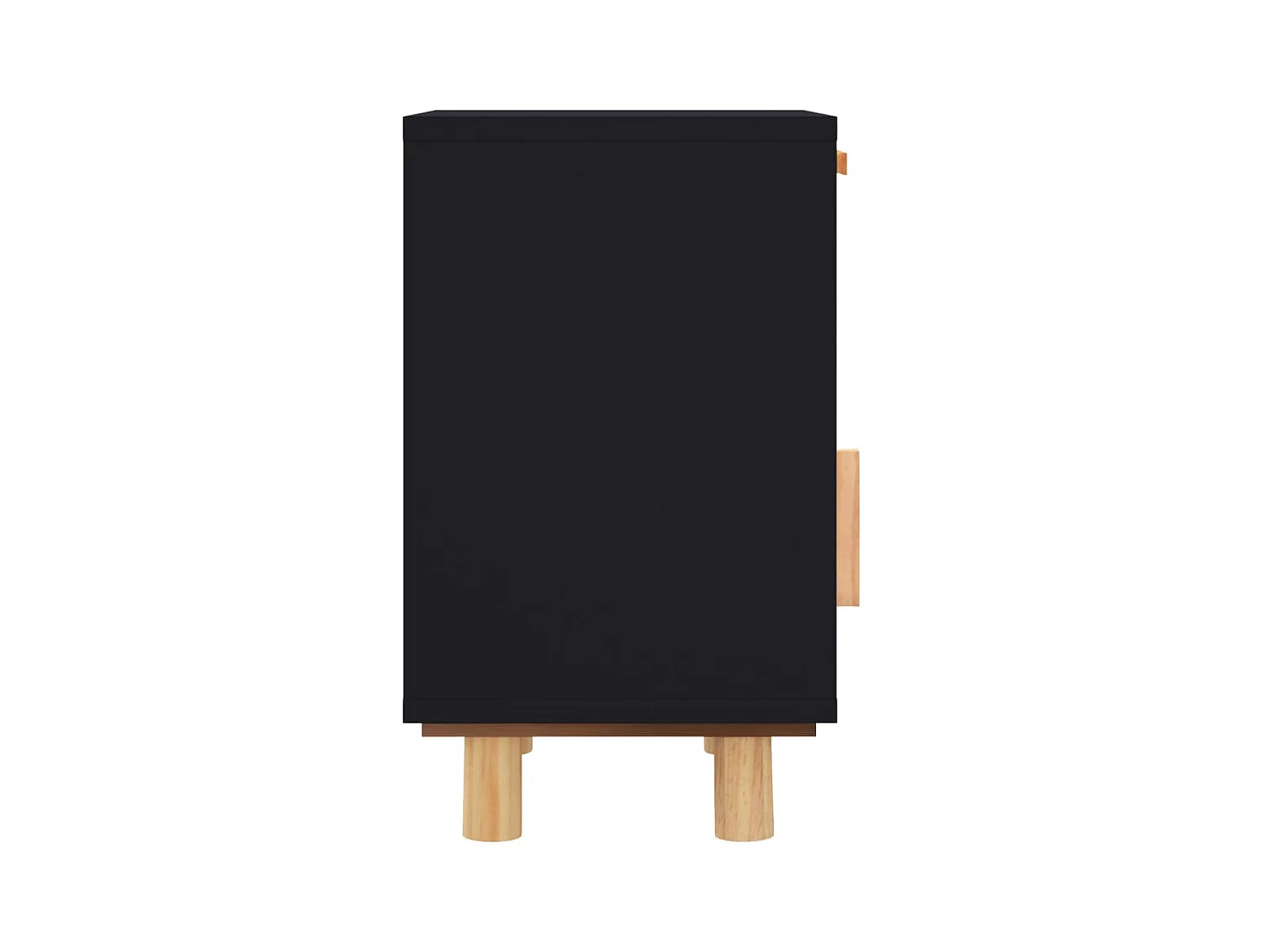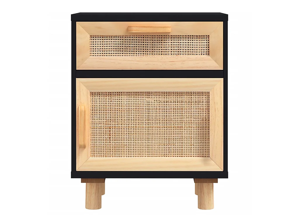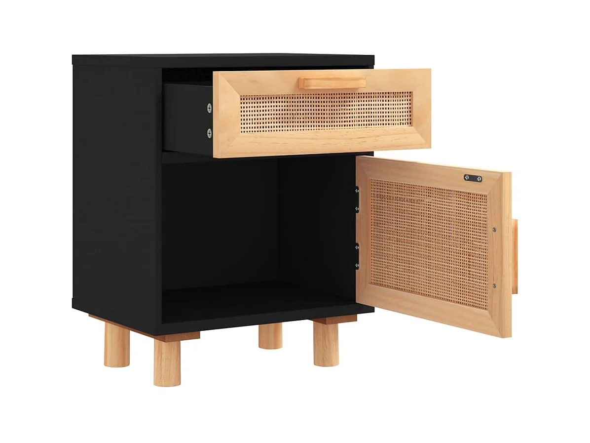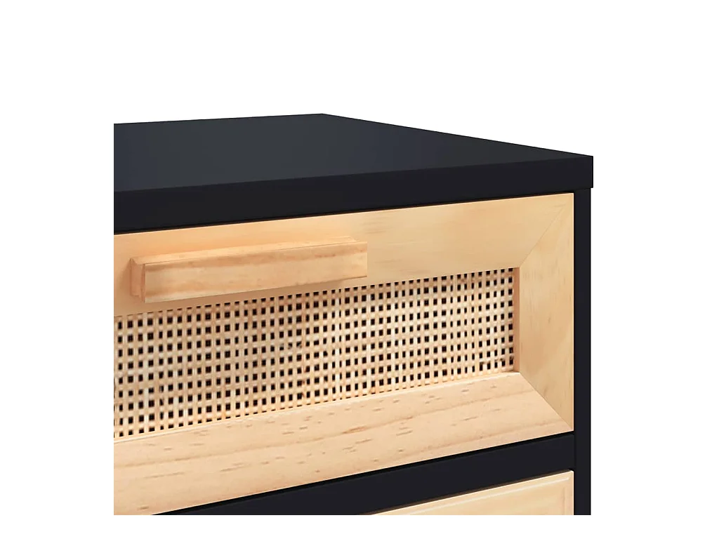 Nachttisch Nachtschrank Schwarz Massivholz Kiefer und Natur-Rattan -RN57687
