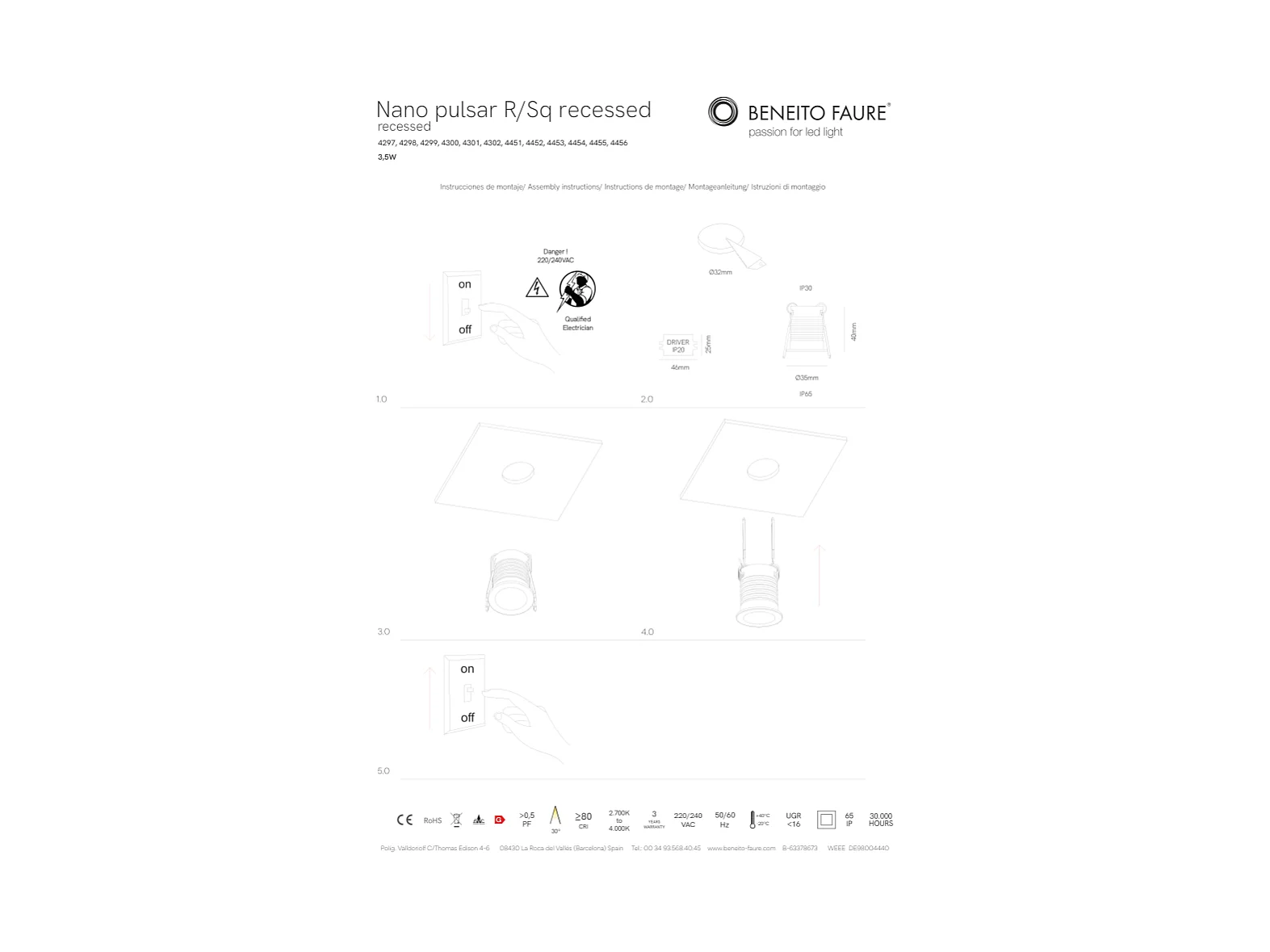Nano Pulsar Sq Einbaustrahler - 3,5 W, 30° Abstrahlwinkel, matt schwarz, kleiner 35-mm-Lichtfleck, 2700 K - Beneito & Faure