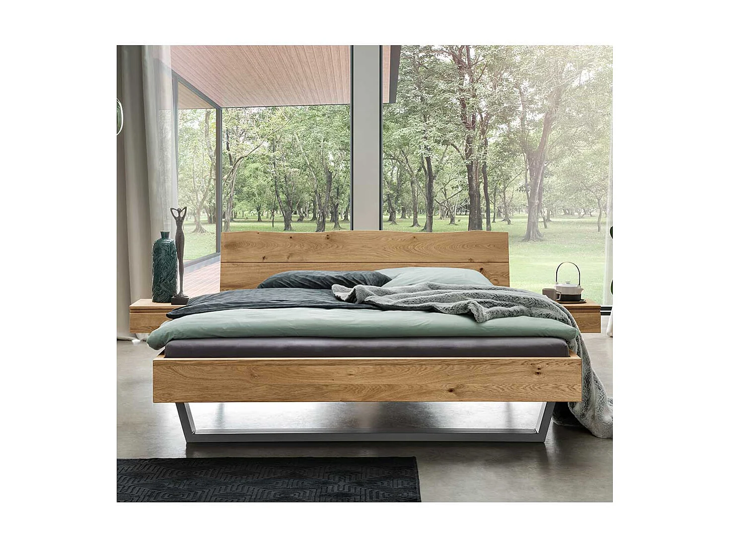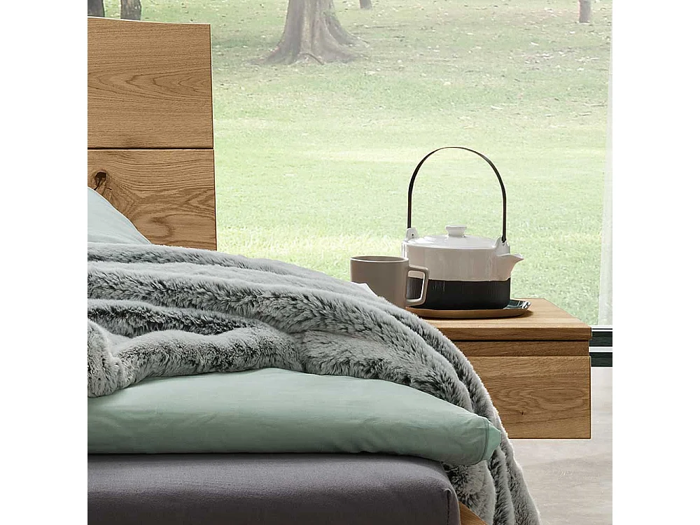 Naturholzbett aus Wildeiche und Metall zwei Nachtkommoden (dreiteilig)