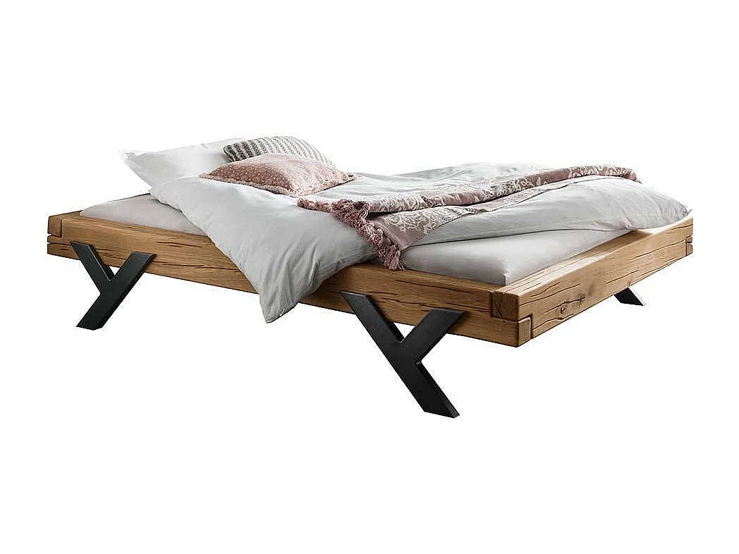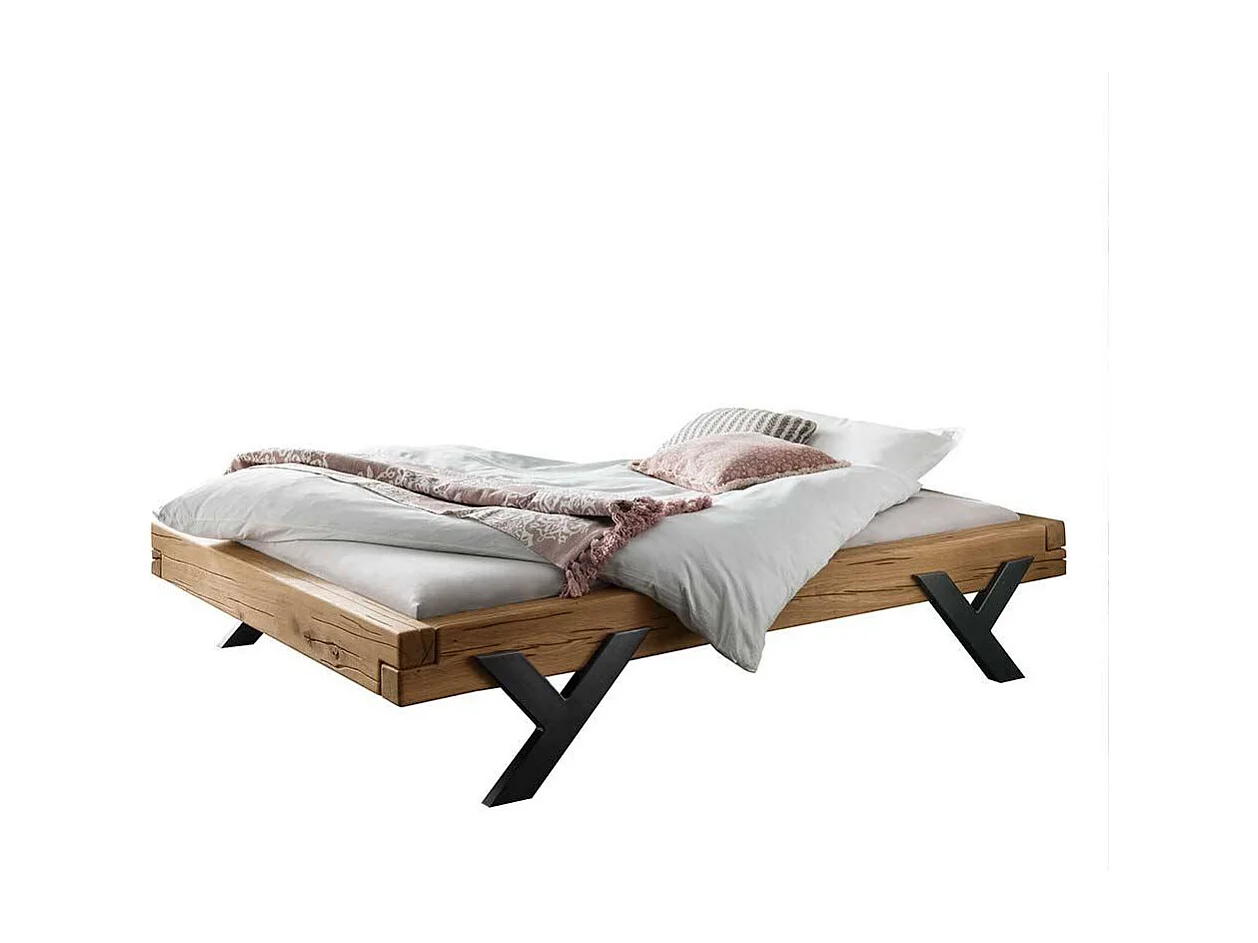 Naturholzbett massiv aus Wildeiche Y Gestell aus Metall