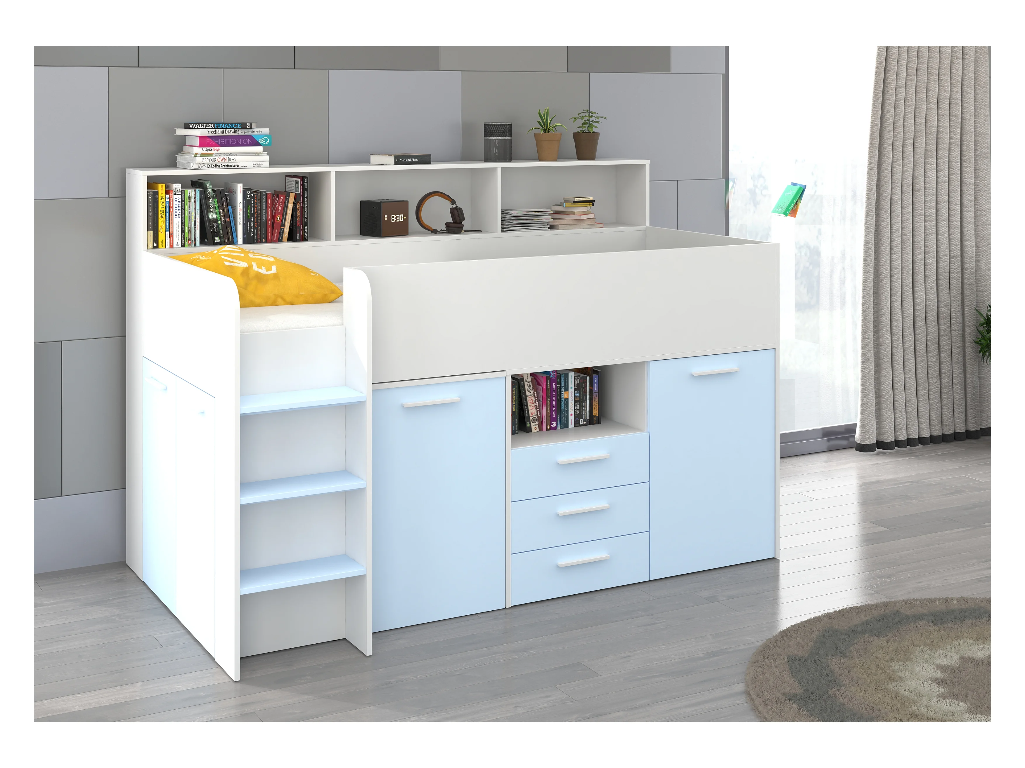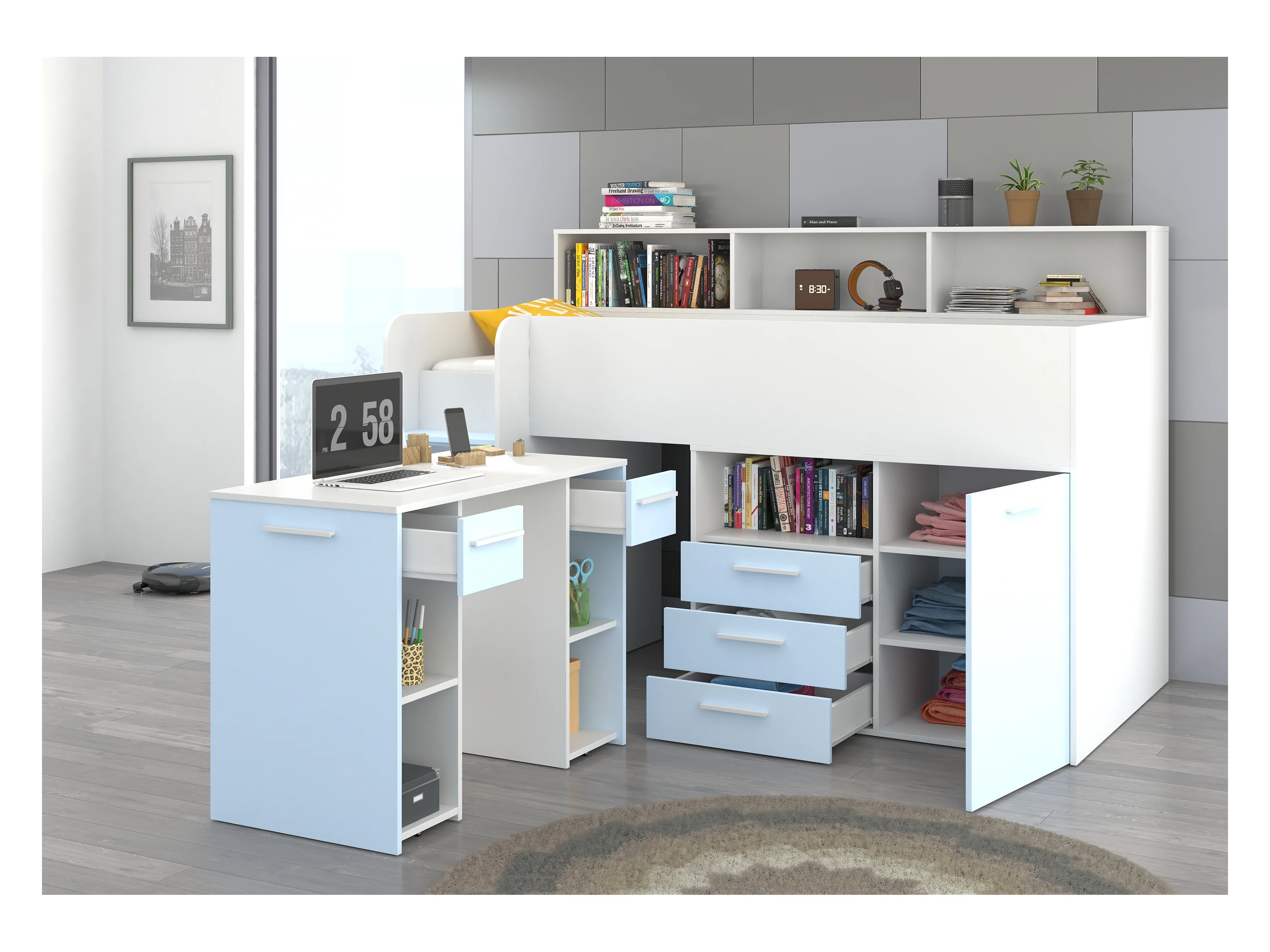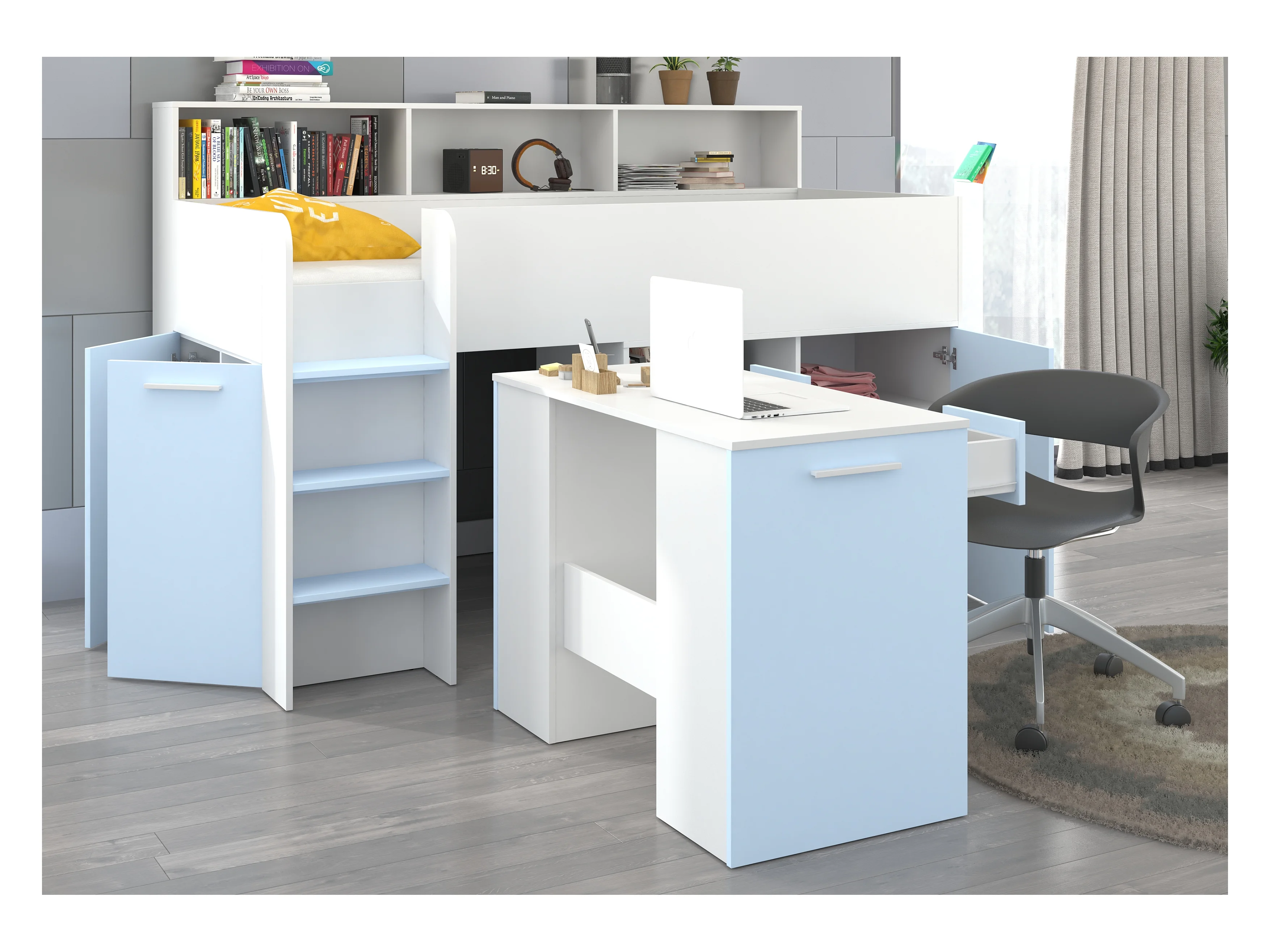 NEO L Etagenbett mit Schreibtisch, Schubladen und Regalen – weiß/blau, modernes Möbelstück für Kinderzimmer, sichere Leiter, Schlafbereich 80x200 cm