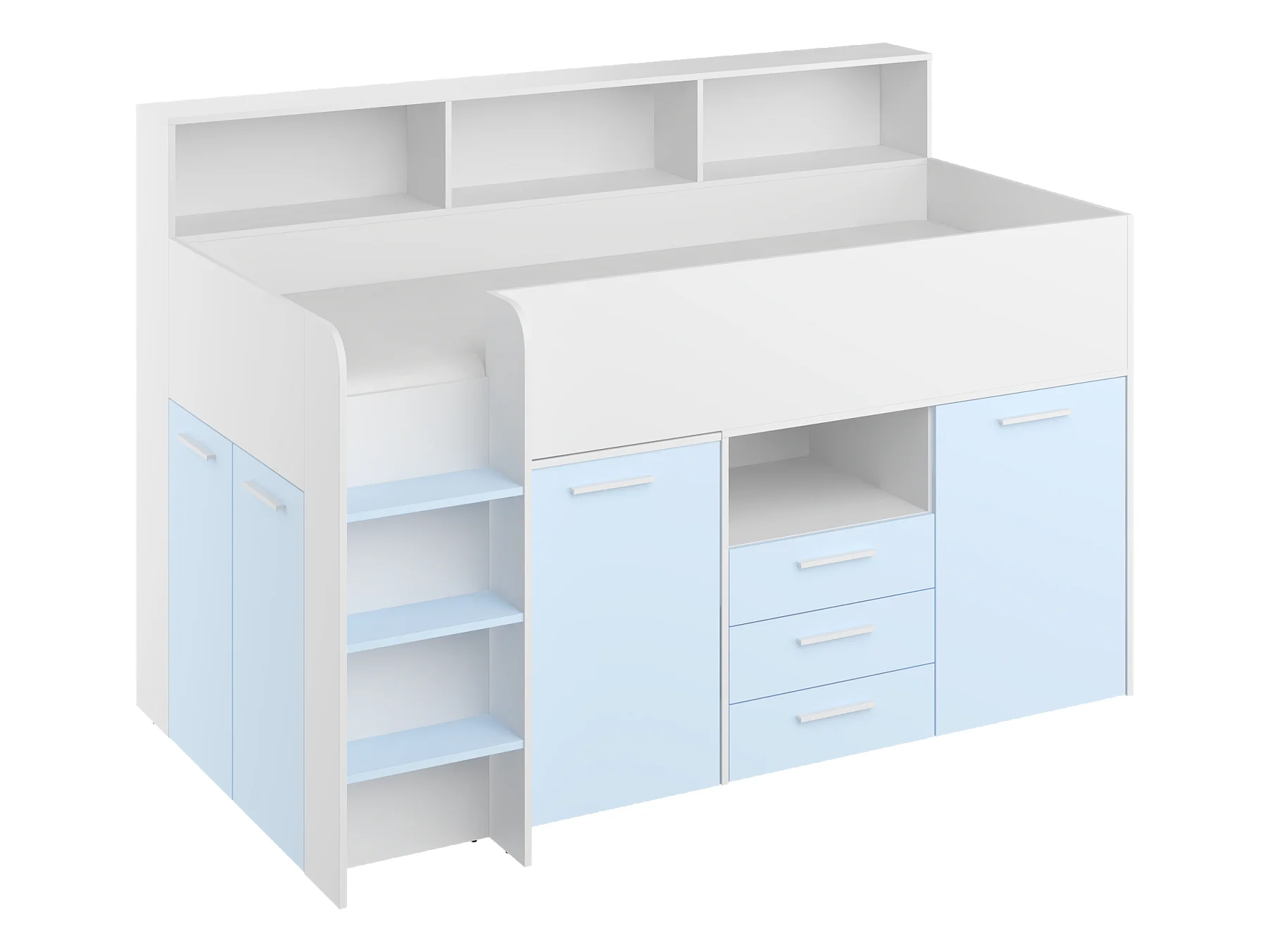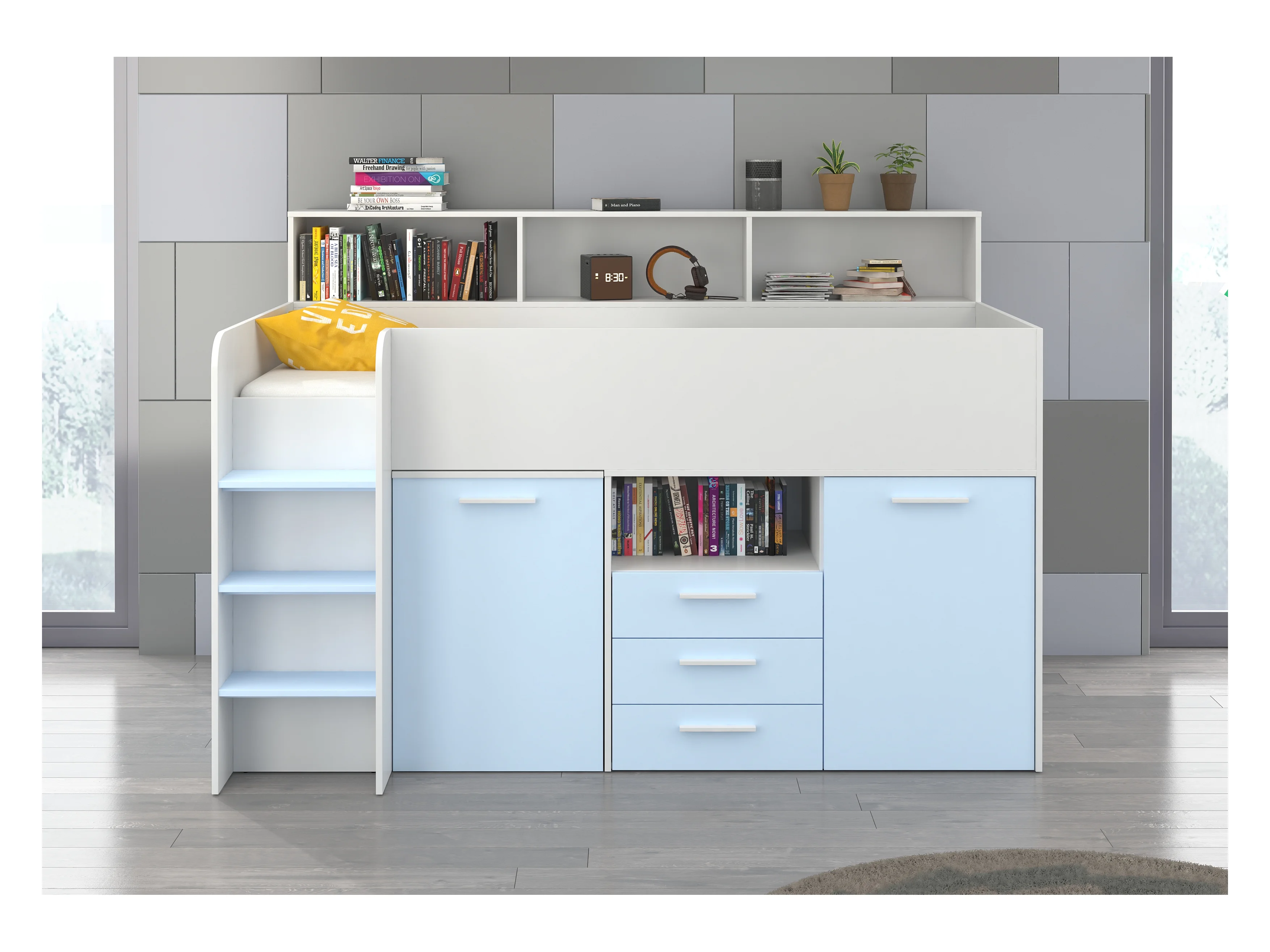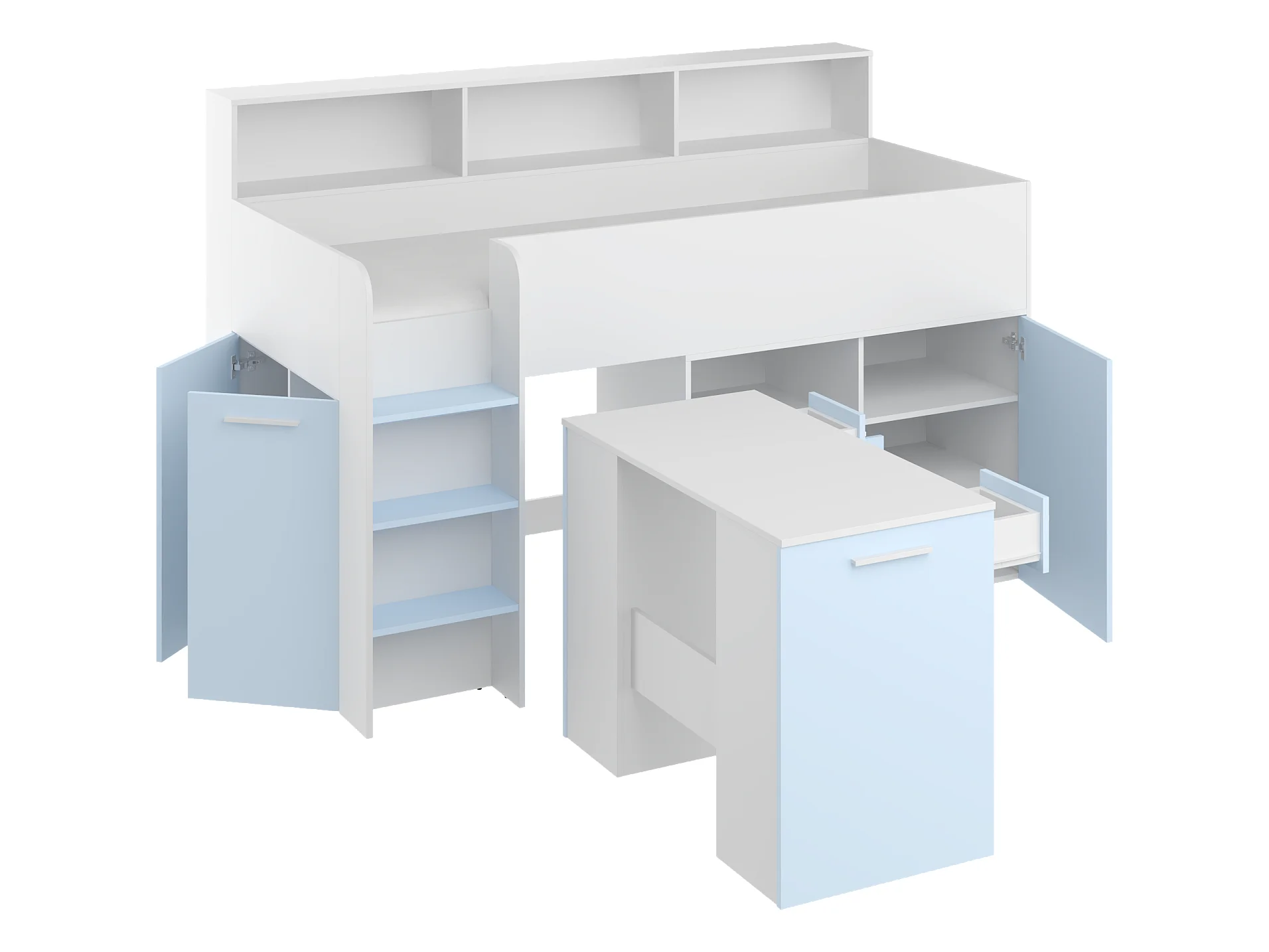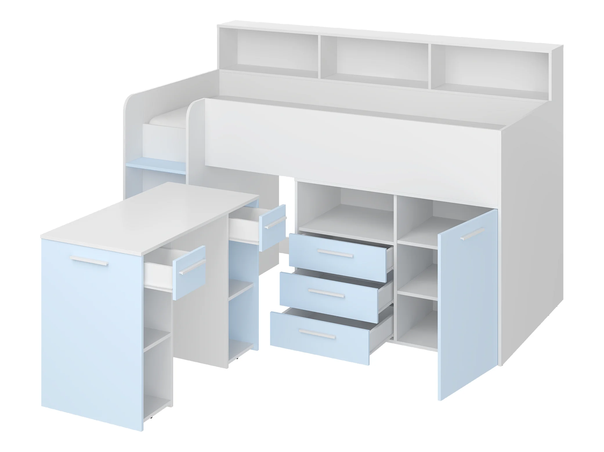 NEO L Etagenbett mit Schreibtisch, Schubladen und Regalen – weiß/blau, modernes Möbelstück für Kinderzimmer, sichere Leiter, Schlafbereich 80x200 cm