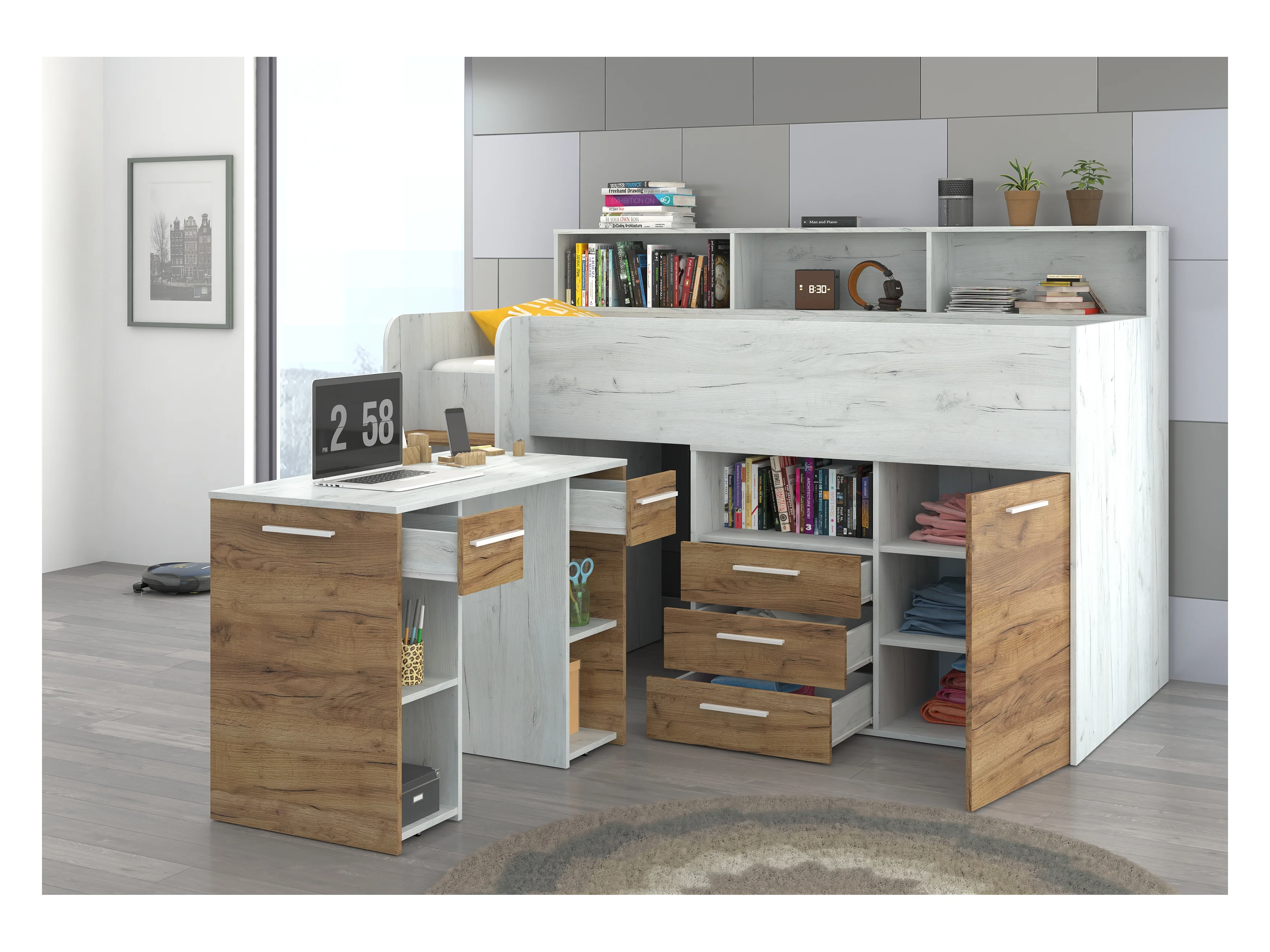 NEO L Etagenbett mit Schreibtisch, Schubladen und Regalen – weiß/craft gold, modernes Möbelstück für Kinderzimmer, sichere Leiter, Schlafbereich 80x200 cm