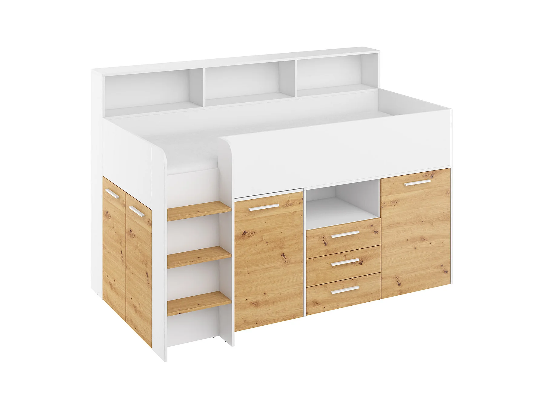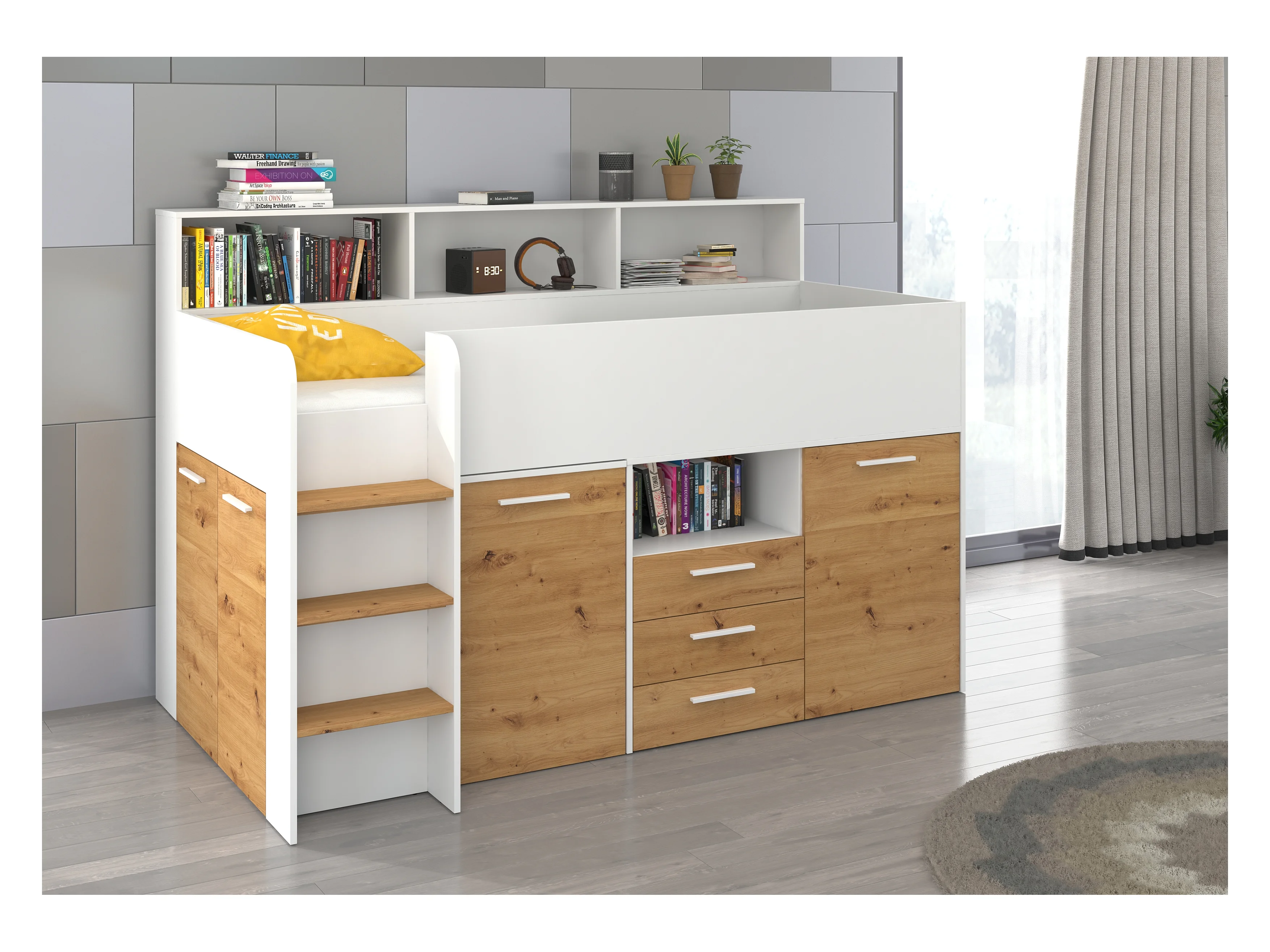NEO L Etagenbett mit Schreibtisch, Schubladen und Regalen – weiß/douglas artisan, modernes Möbelstück für Kinderzimmer, sichere Leiter, Schlafbereich 80x200 cm