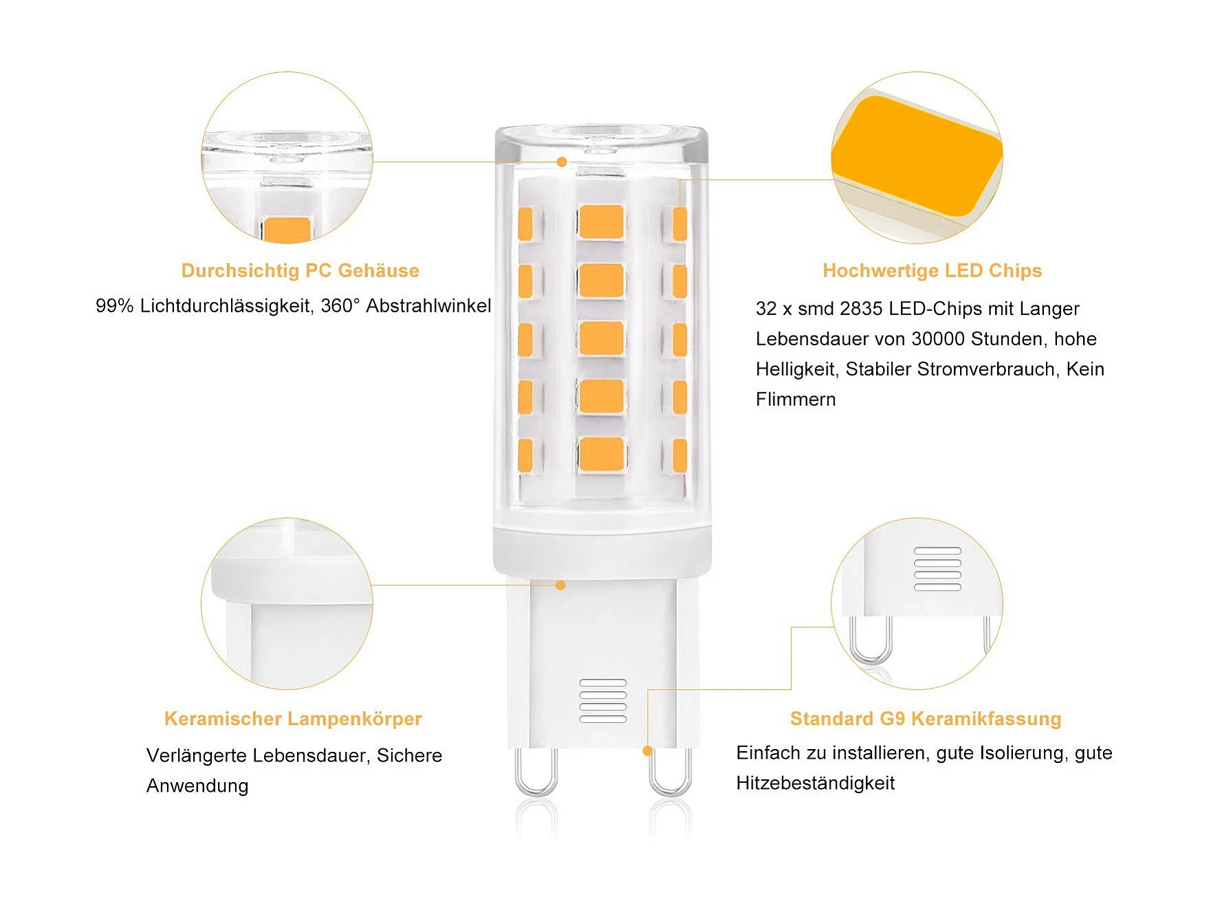 10er-Pack LED-G9-Glühbirne, Warmweiß, 3 W, Halogen, 28 W, 30 W, 40 W, Sockel, kein Flimmern, energiesparend