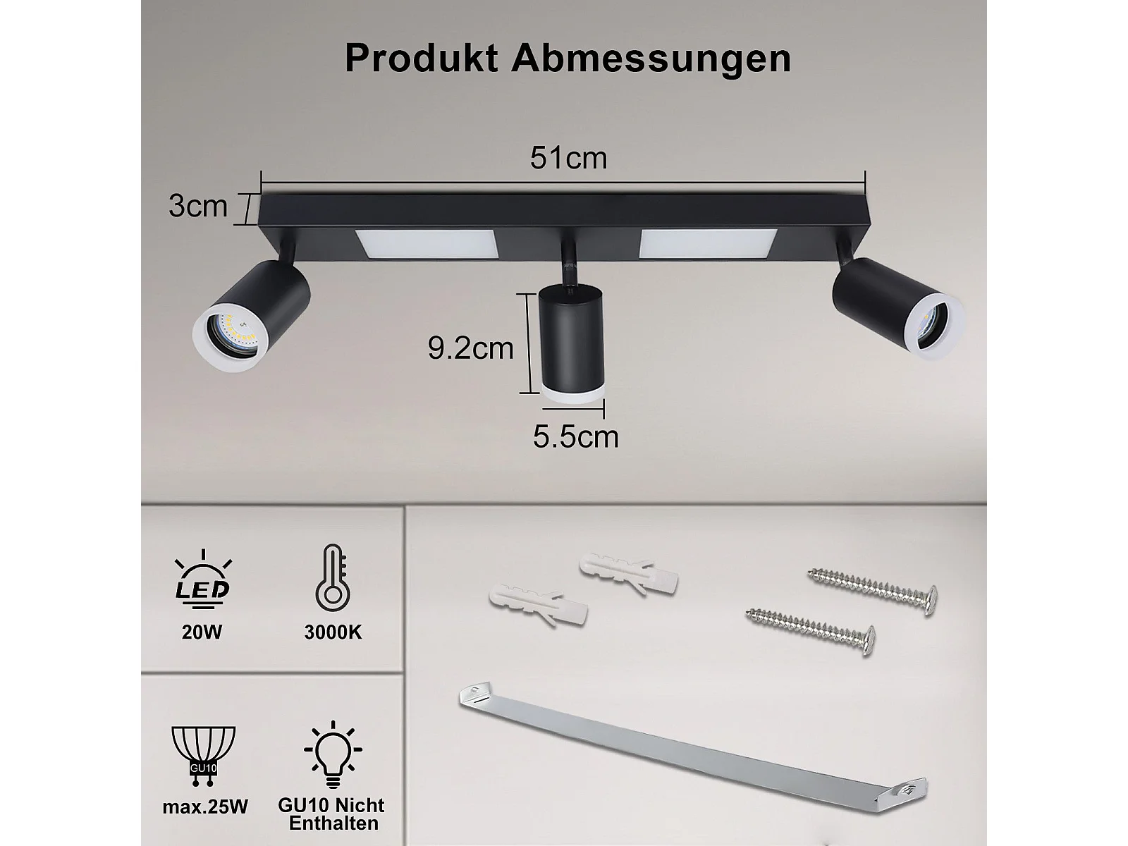 NETTLIFE Deckenstrahler 3-flammig GU10 Schlafzimmer 3000k 20W Küchenlampe schwarz warmweiß, verstellbar