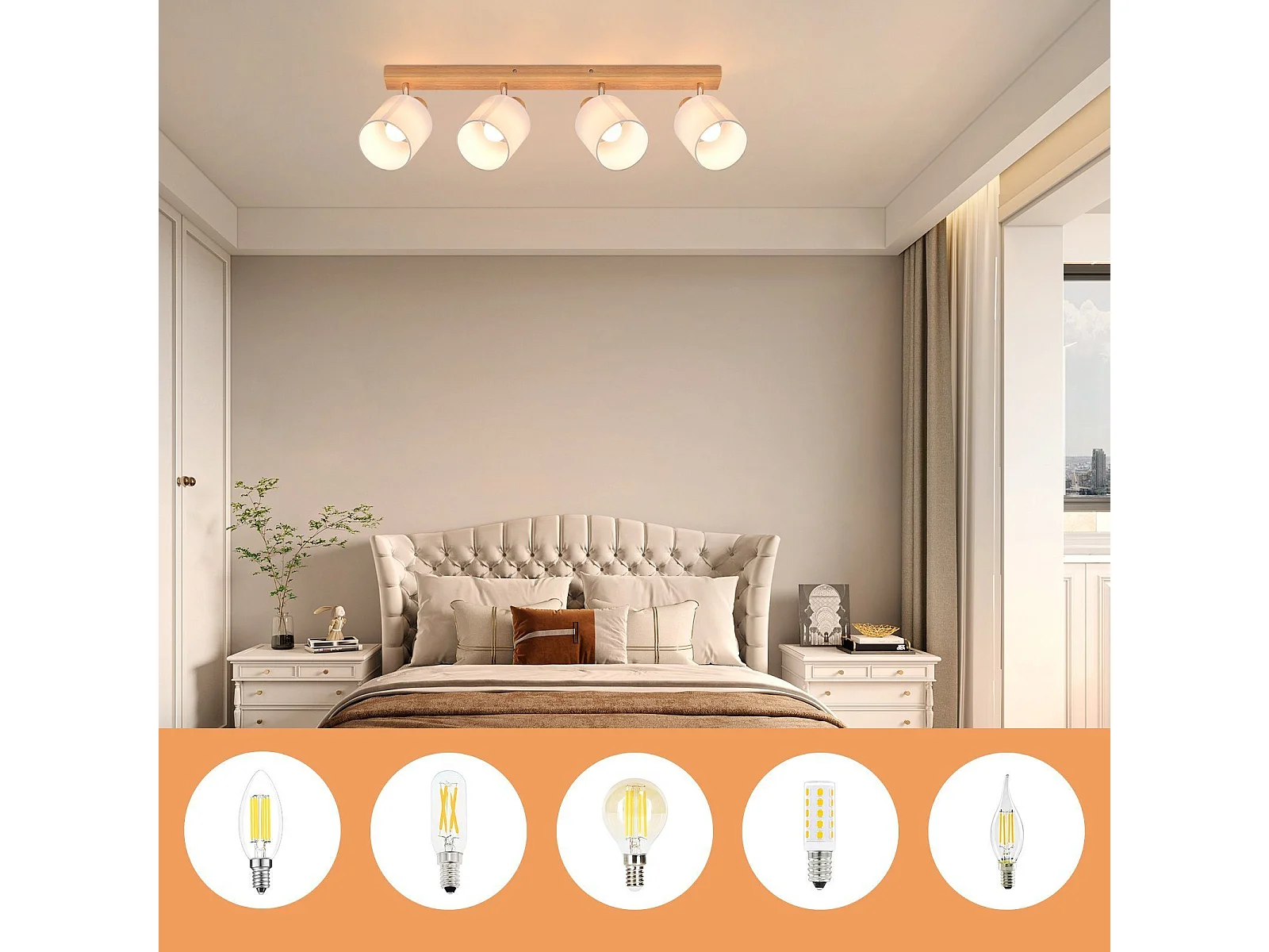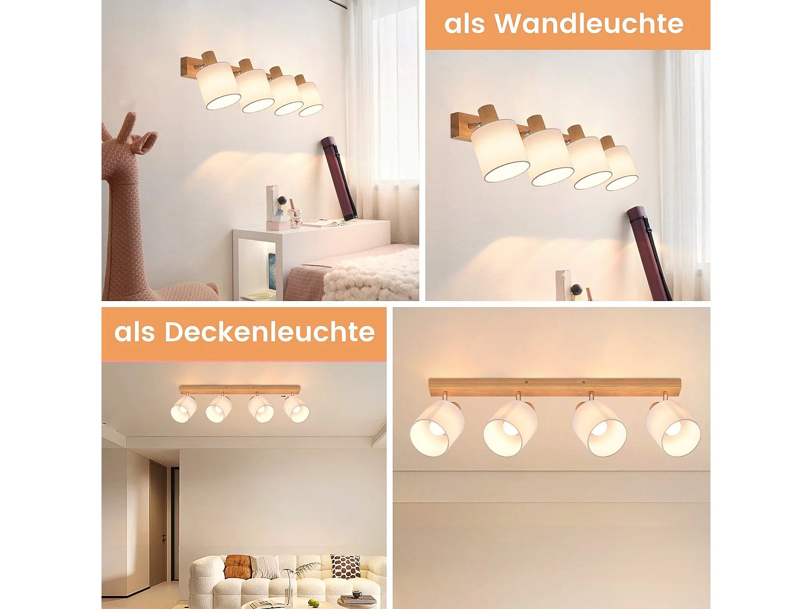 NETTLIFE 4er Modern Holz Wohnzimmer Deckenstrahler E14 350° Schwenkbar MAX.25W Stoffschirm Lampe für Schlafzimmer Küche Flur (Ohne Leuchtmittel)