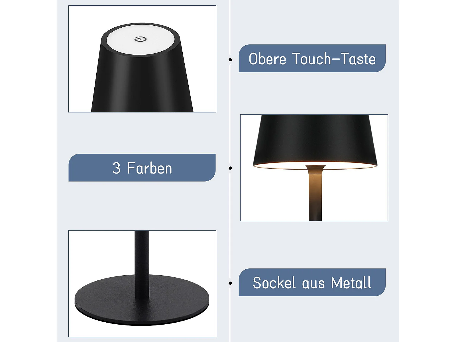 NETTLIFE kabellose Nachttischlampe, LED mit 2600 mAh, außen nutzbare wiederaufladbare Tischlampe, berührungsempfindlich, schwarz, mit USB.