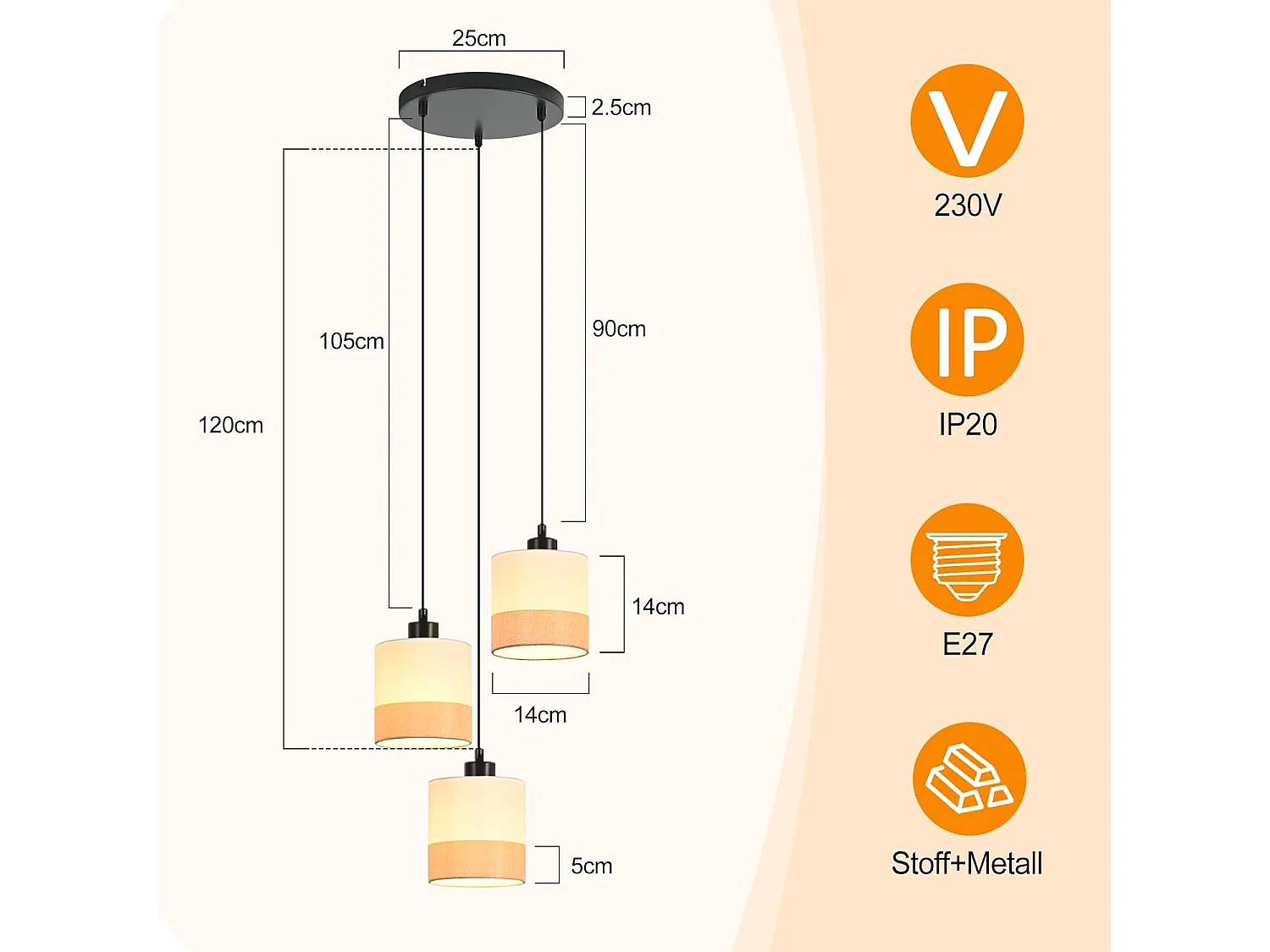 Nettlife Vintage Esstisch-Pendelleuchte - 3-flammiger weißer Stoff-Kronleuchter E27, Retro-Beleuchtung für Wohnzimmer und Küche (Leuchtmittel nicht enthalten)