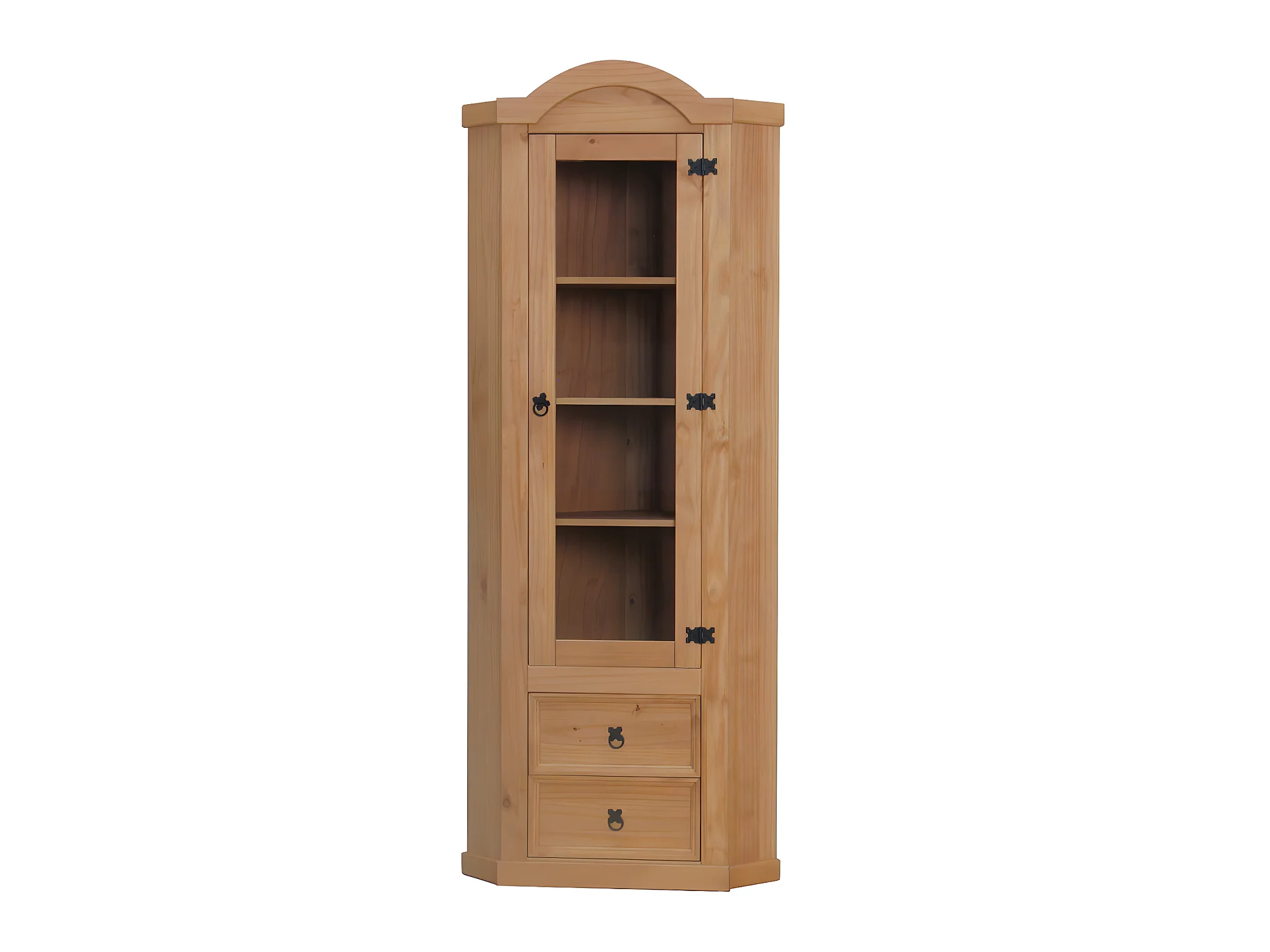 New Mexico Eckschrank mit 1 Glastür und 2 Schubladen, gelaugt und gewachst.