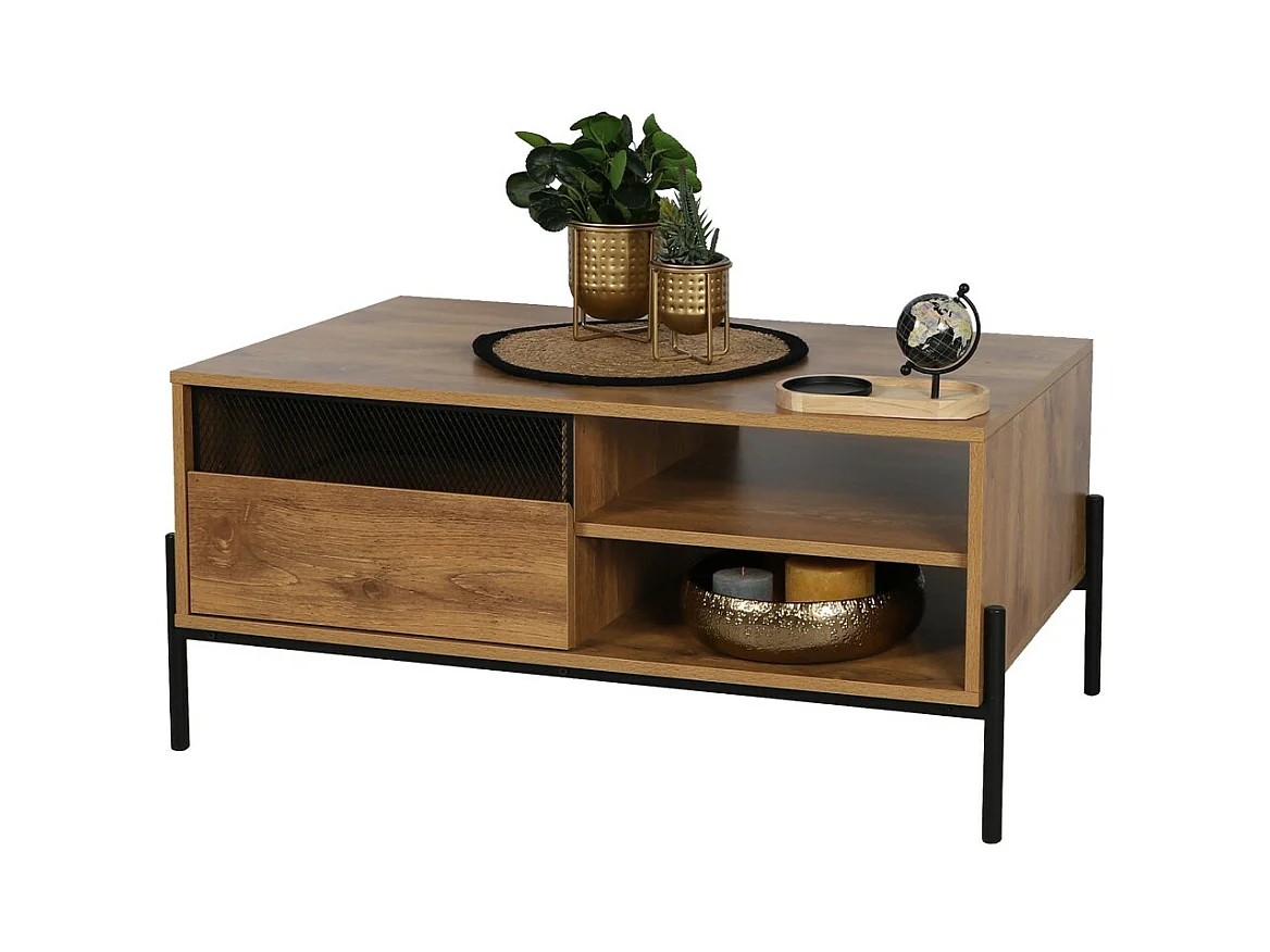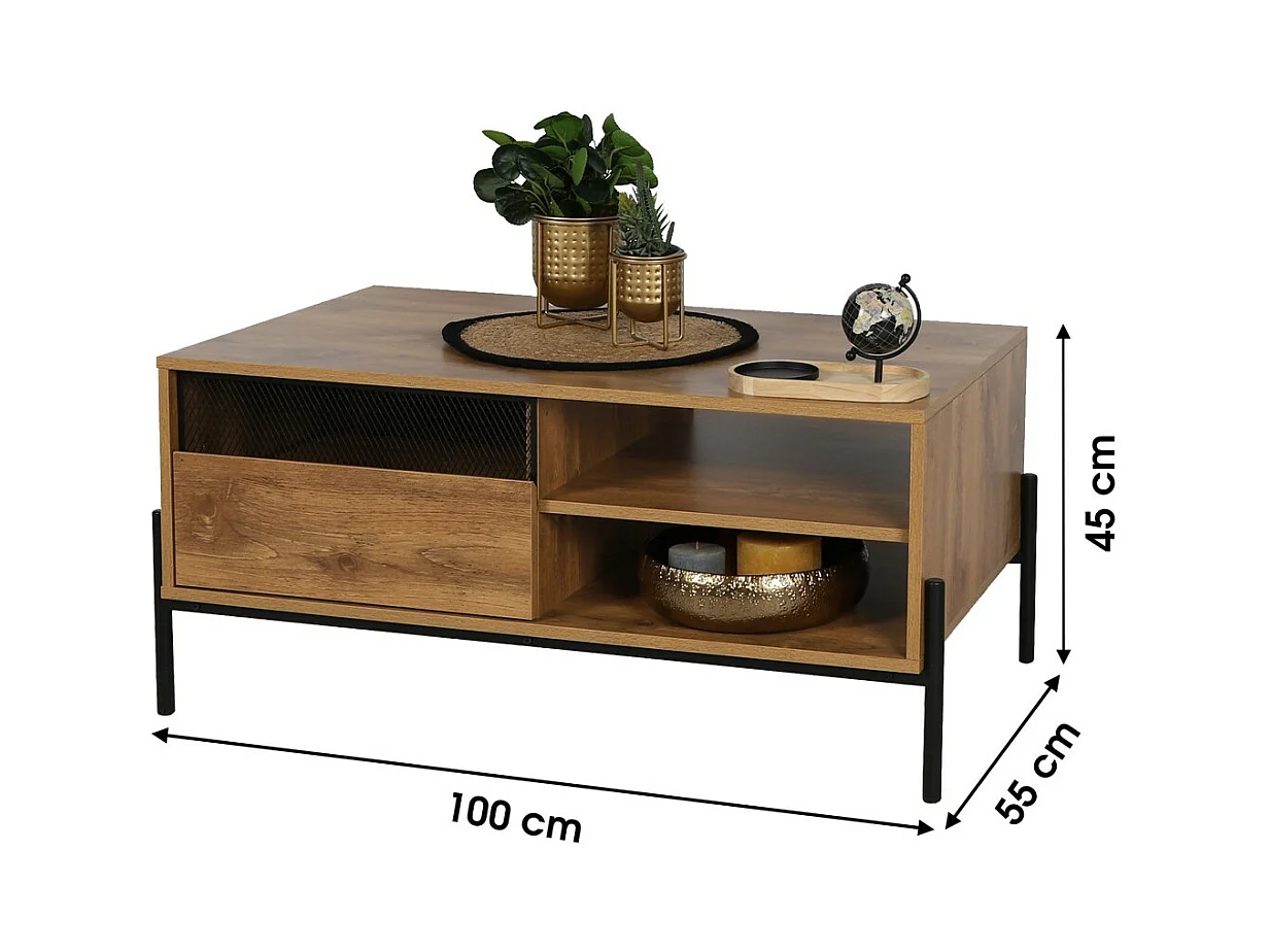 Niedriger Tisch im rustikalen Stil, Kollektion HELIAS – Farbe dunkle Eiche, Beine aus schwarzem Metall, Maße 60x49x110 cm